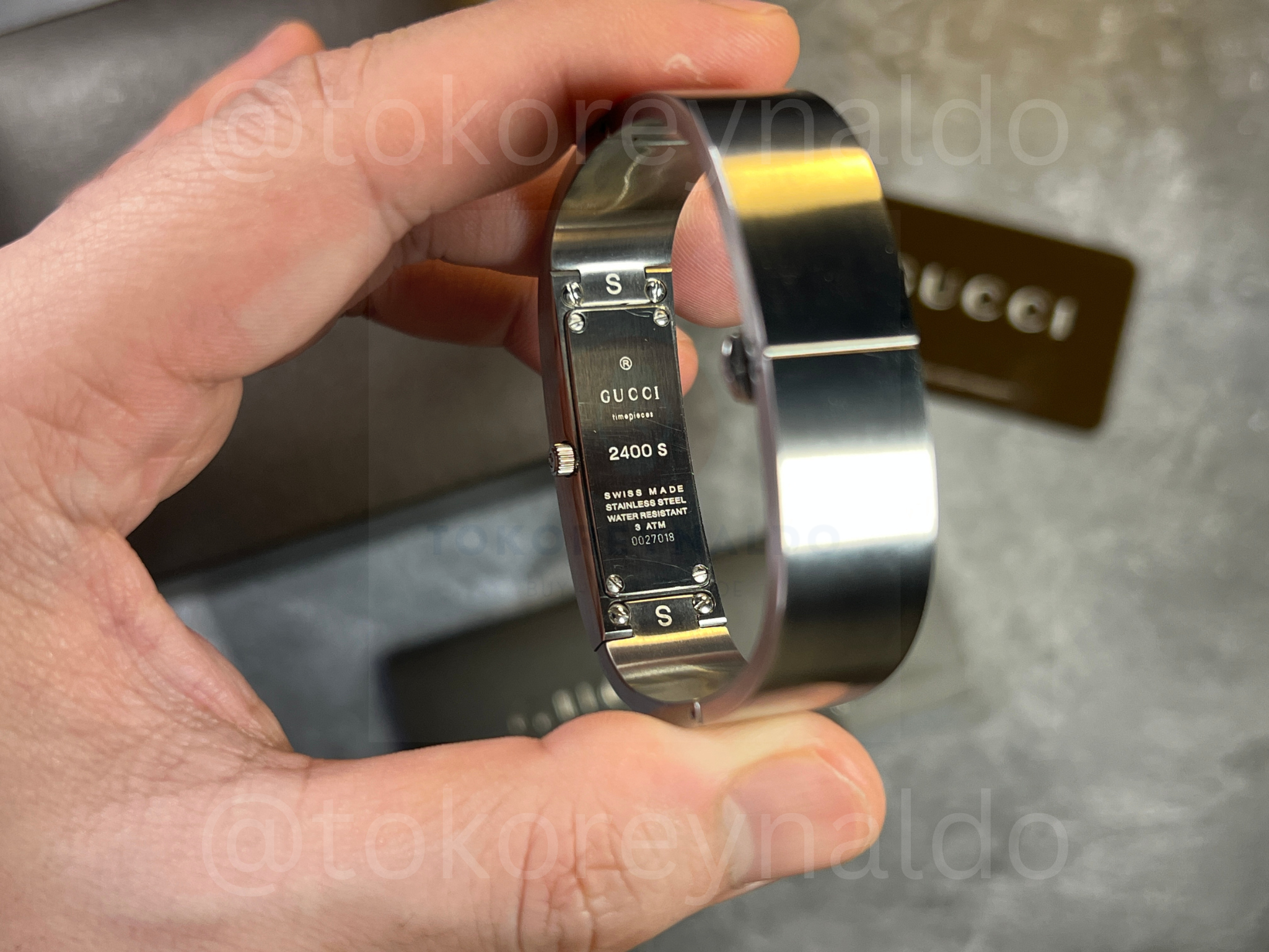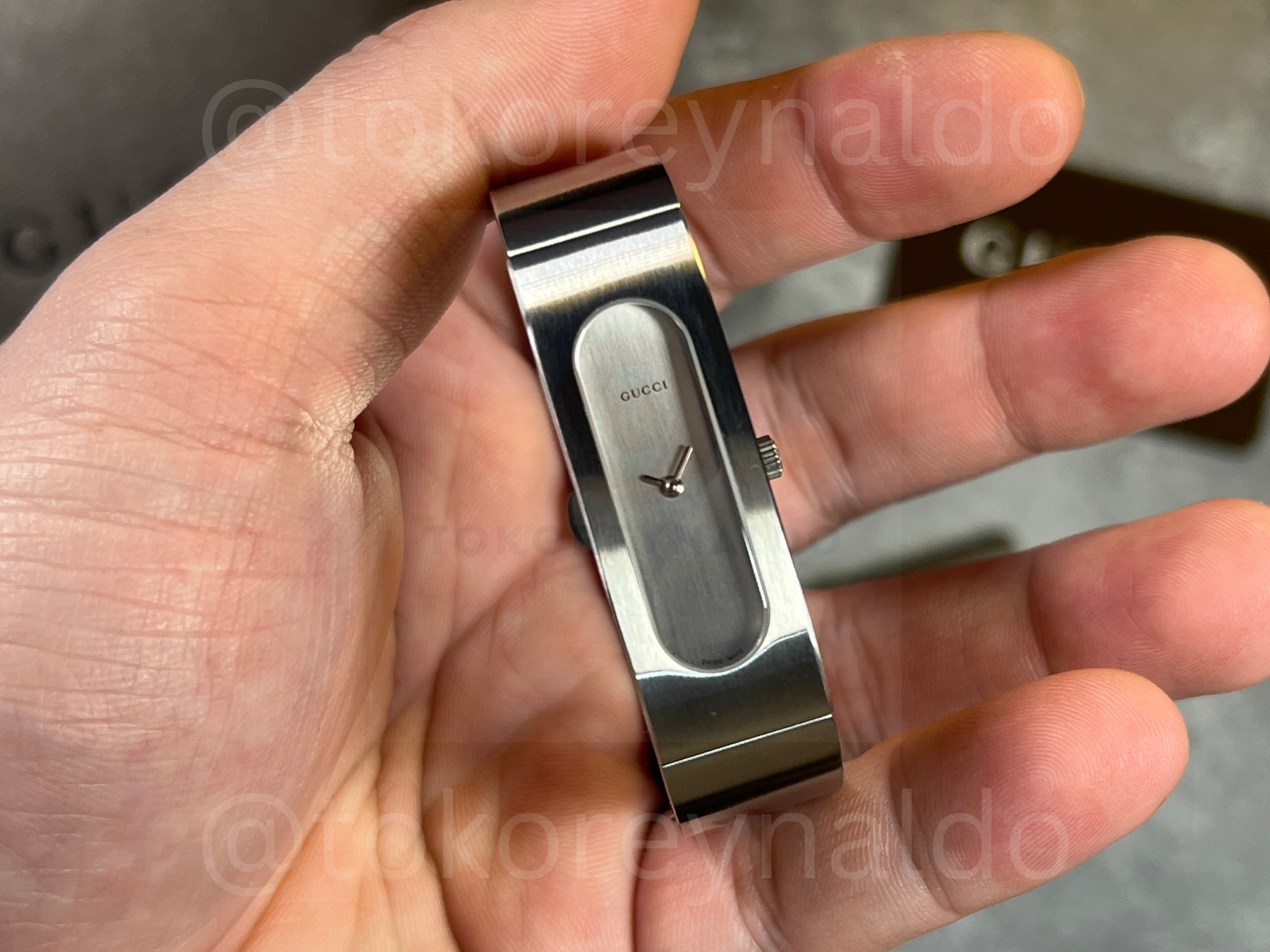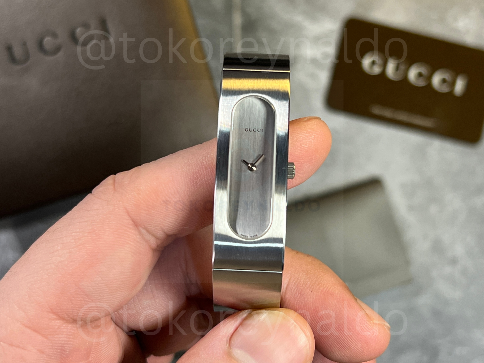 Authentic vintage Gucci 2400S featuring a sleek, architectural oval case integrated into a high-polish stainless steel bangle bracelet. This minimalist Swiss-made timepiece showcases a vertical brushed silver dial with petite silver-tone hands, protected by a recessed crystal for a seamless, modern aesthetic. Designed as a sophisticated fusion of fine jewelry and horology, it features a secure hinged opening and branded clasp, available now at Toko Reynaldo.