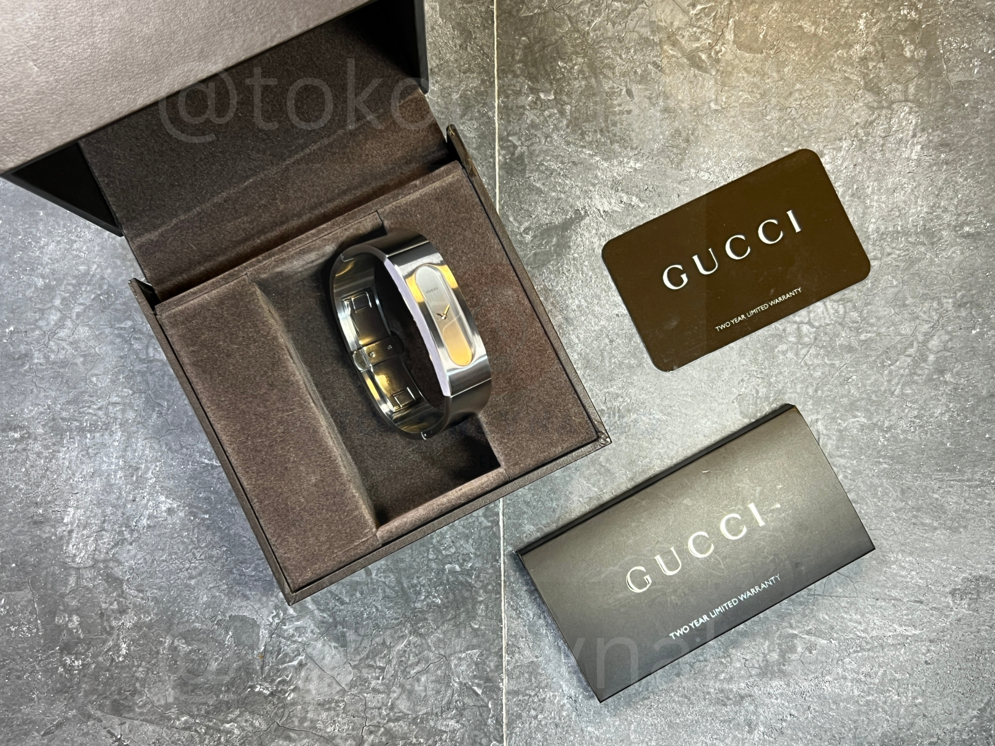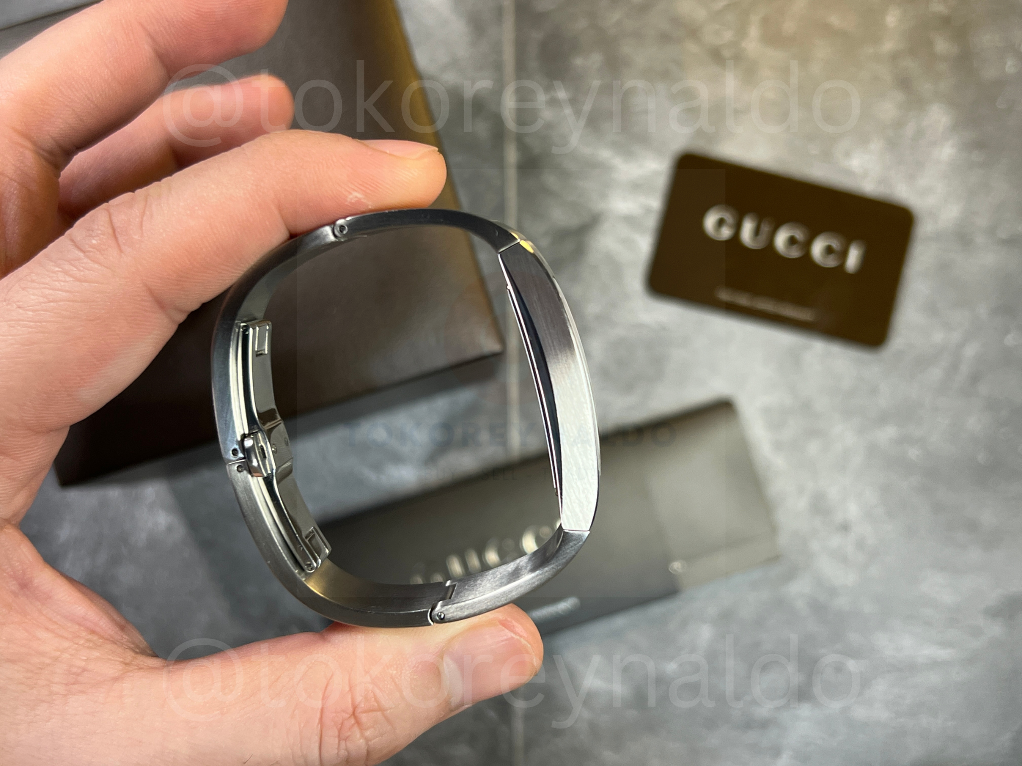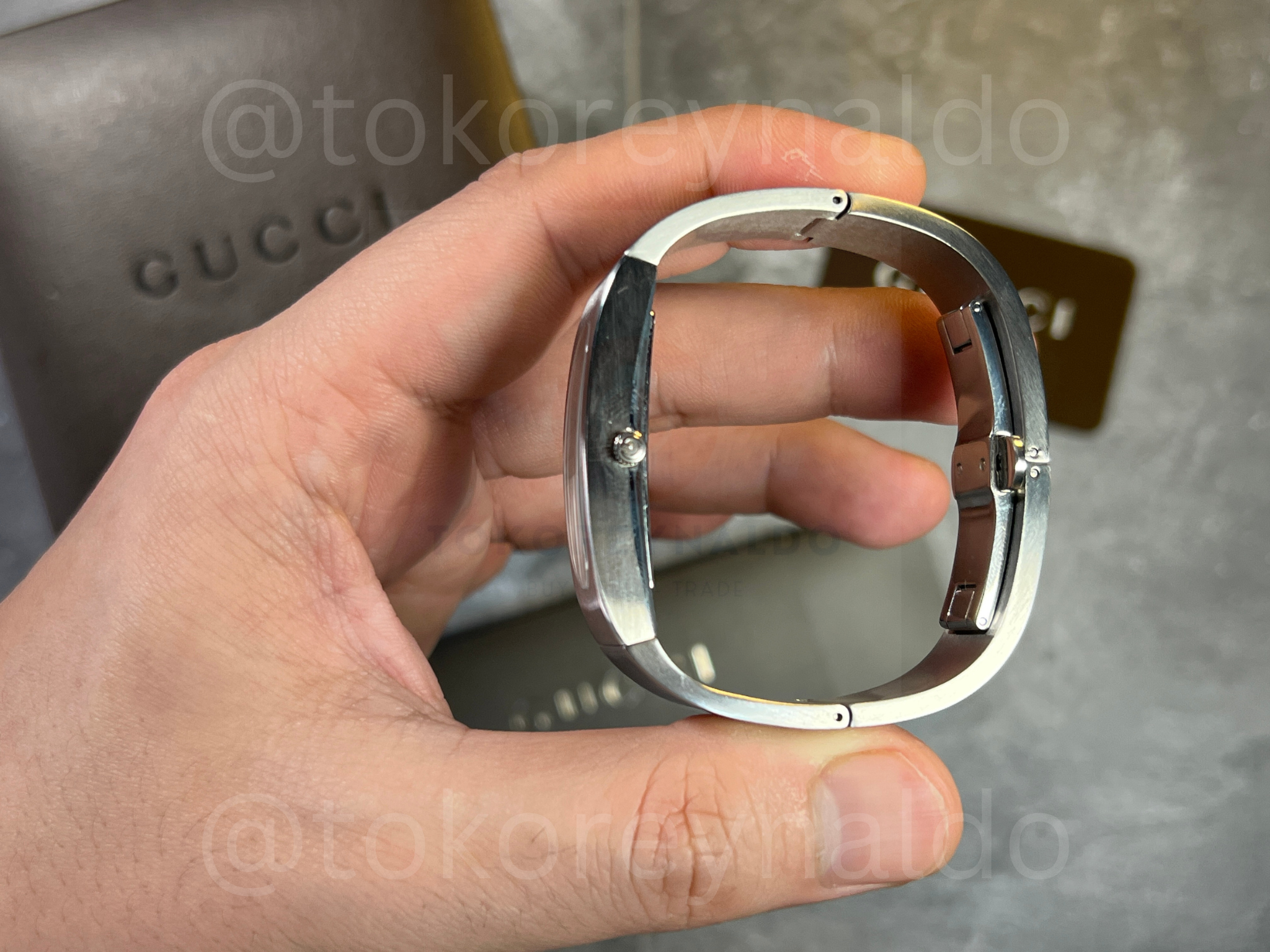 Authentic vintage Gucci 2400S featuring a sleek, architectural oval case integrated into a high-polish stainless steel bangle bracelet. This minimalist Swiss-made timepiece showcases a vertical brushed silver dial with petite silver-tone hands, protected by a recessed crystal for a seamless, modern aesthetic. Designed as a sophisticated fusion of fine jewelry and horology, it features a secure hinged opening and branded clasp, available now at Toko Reynaldo.