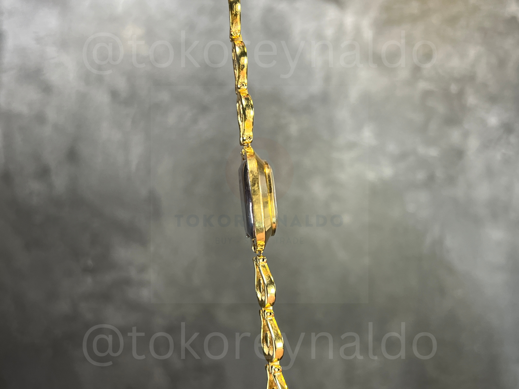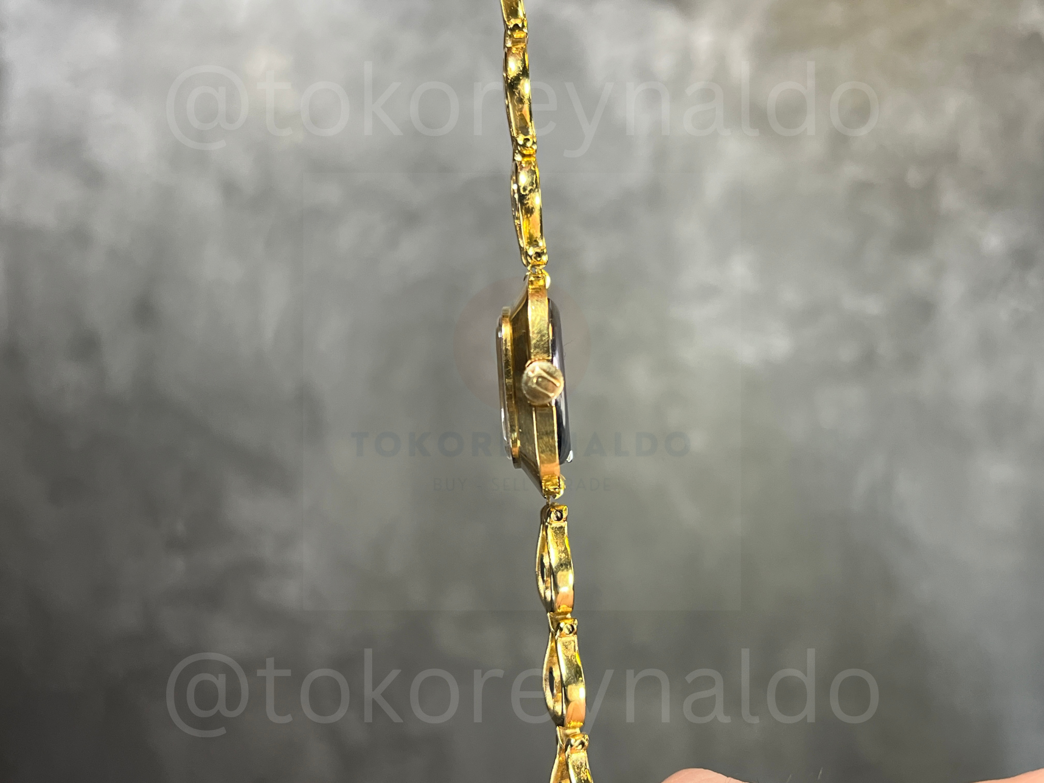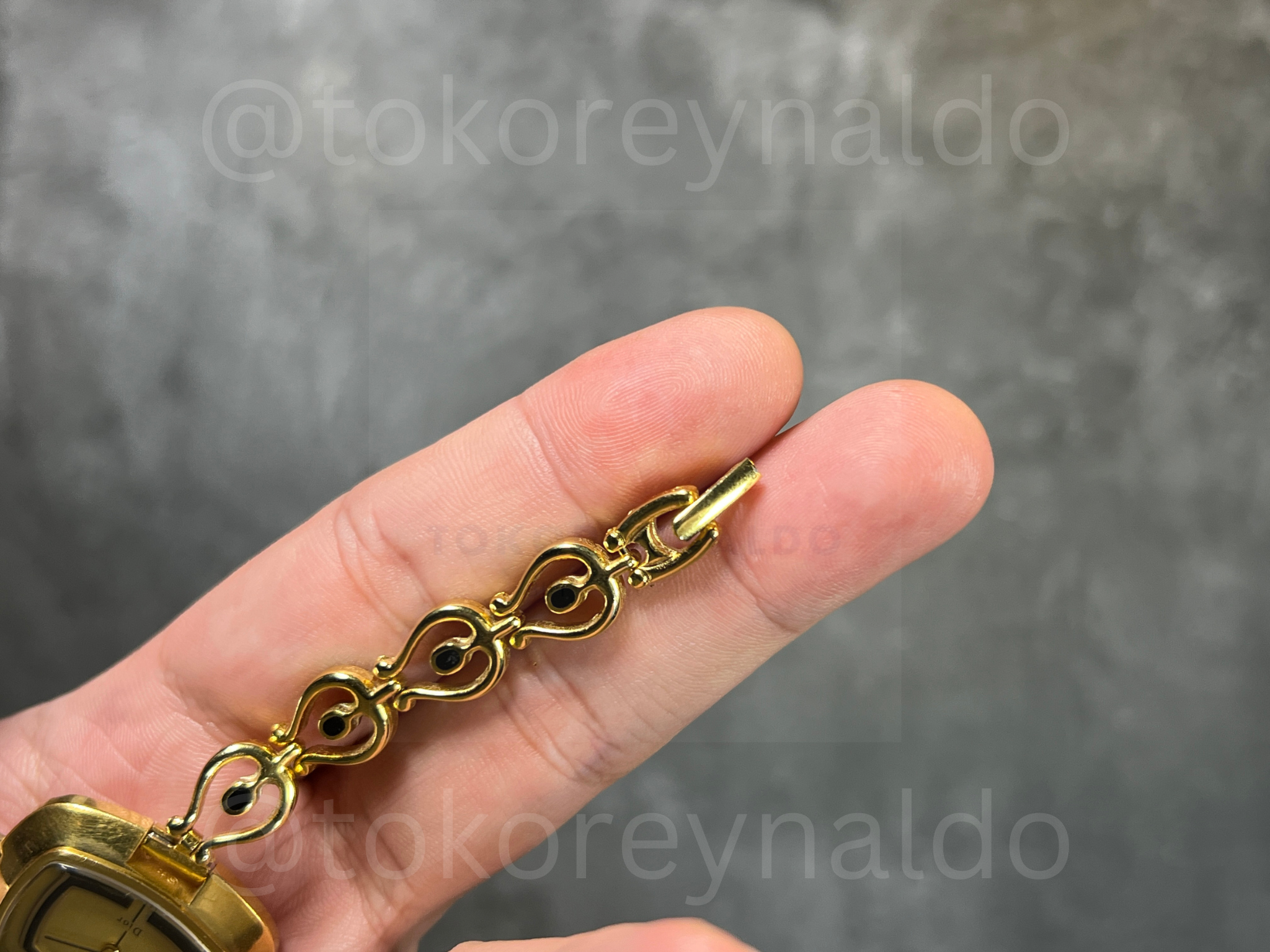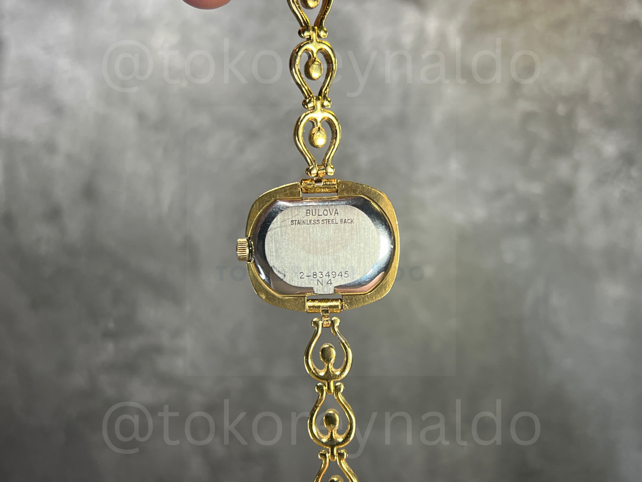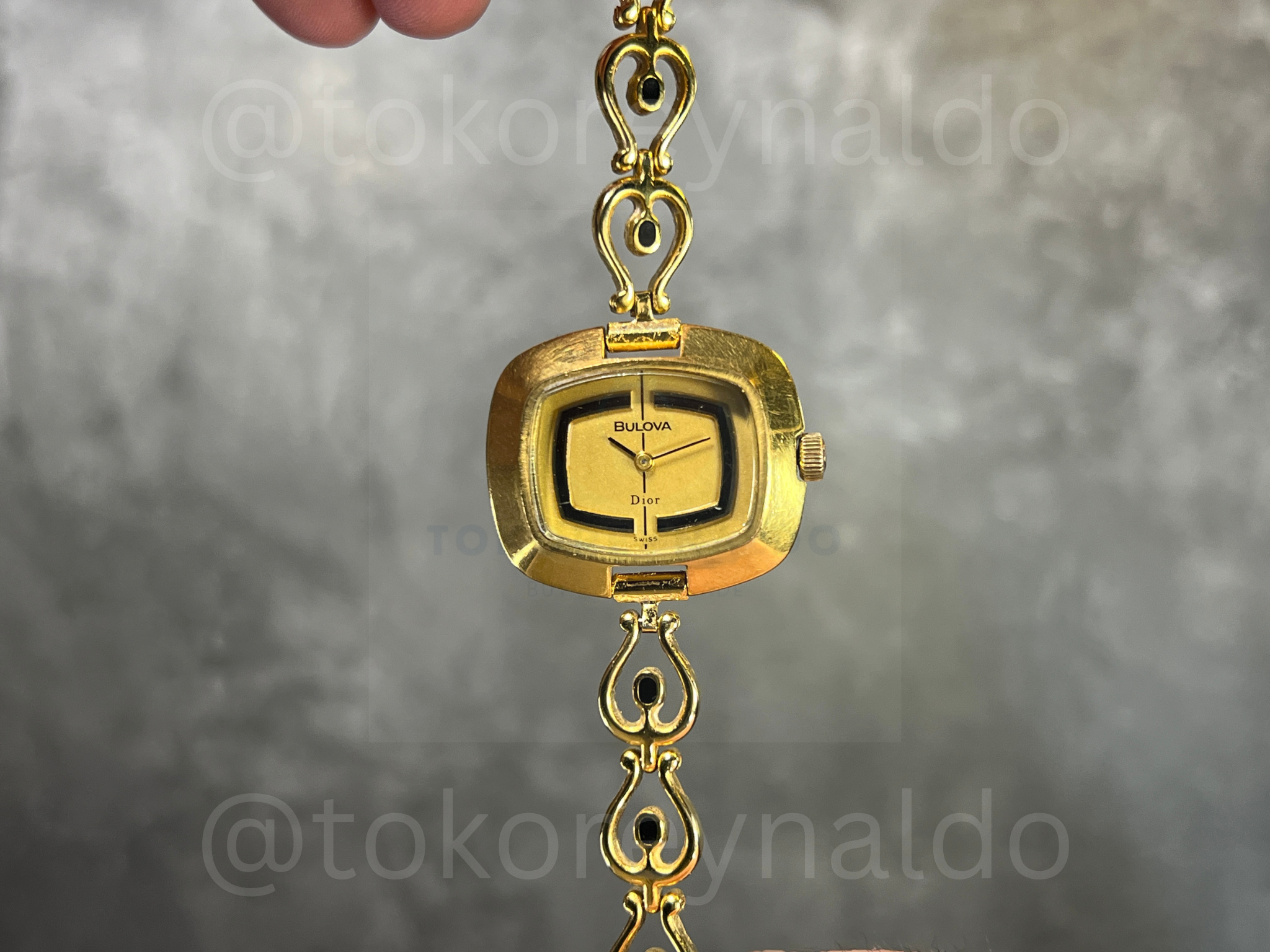 Authentic vintage 1970’s Bulova x Christian Dior collaboration (Ref. 2-834945 N4) featuring a unique cushion/TV-shaped case in a polished gold-plated finish. This rare Swiss-made timepiece showcases a radiant gold-tone dial with a minimalist two-hand display, protected by a contoured crystal and signed with both the Bulova and Dior heritage logos. Paired with its original and highly decorative integrated gold-plated link bracelet featuring openwork heart-shaped motifs, it is a stunning piece of jewelry-watch history for collectors, available now at Toko Reynaldo.