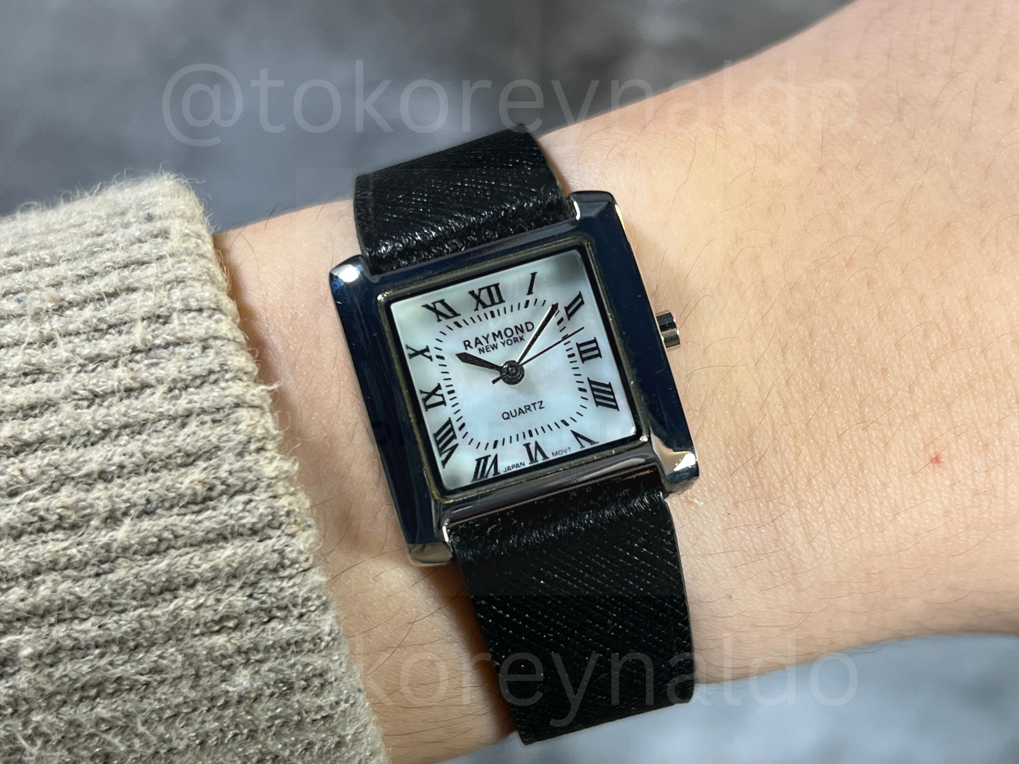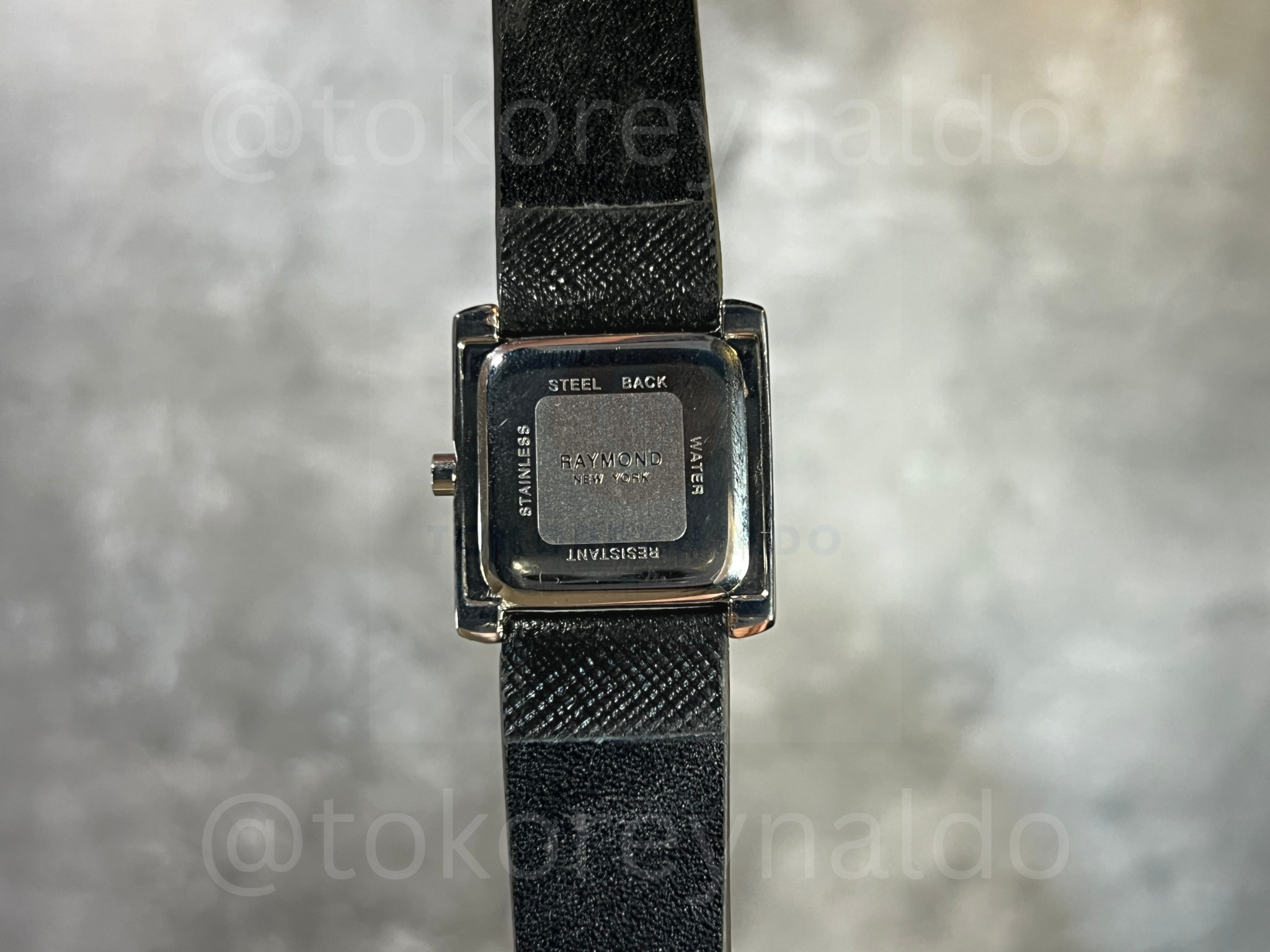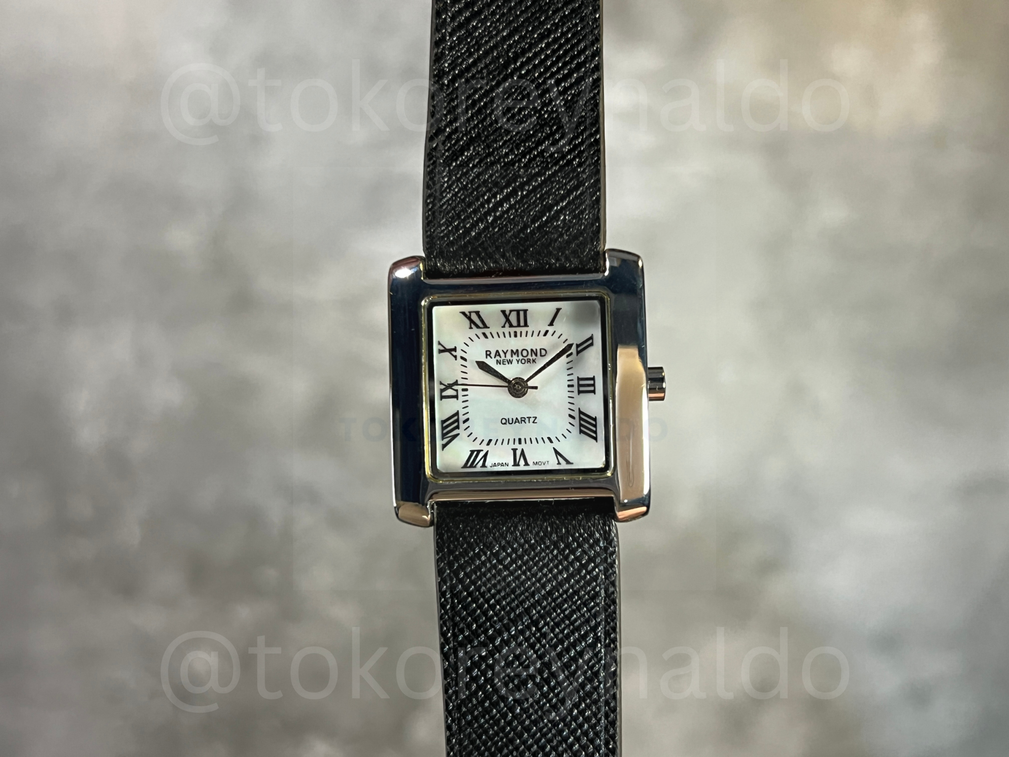 Authentic vintage Raymond New York featuring a sophisticated square-shaped stainless steel case with a polished mirror finish. This elegant timepiece showcases a radiant white Mother of Pearl (MOP) dial that shifts beautifully in the light, accented by traditional black Roman numeral indices and a delicate inner minute track. Paired with a premium black saffiano leather strap, it offers a refined and timeless aesthetic for collectors of unique dress watches, available now at Toko Reynaldo.