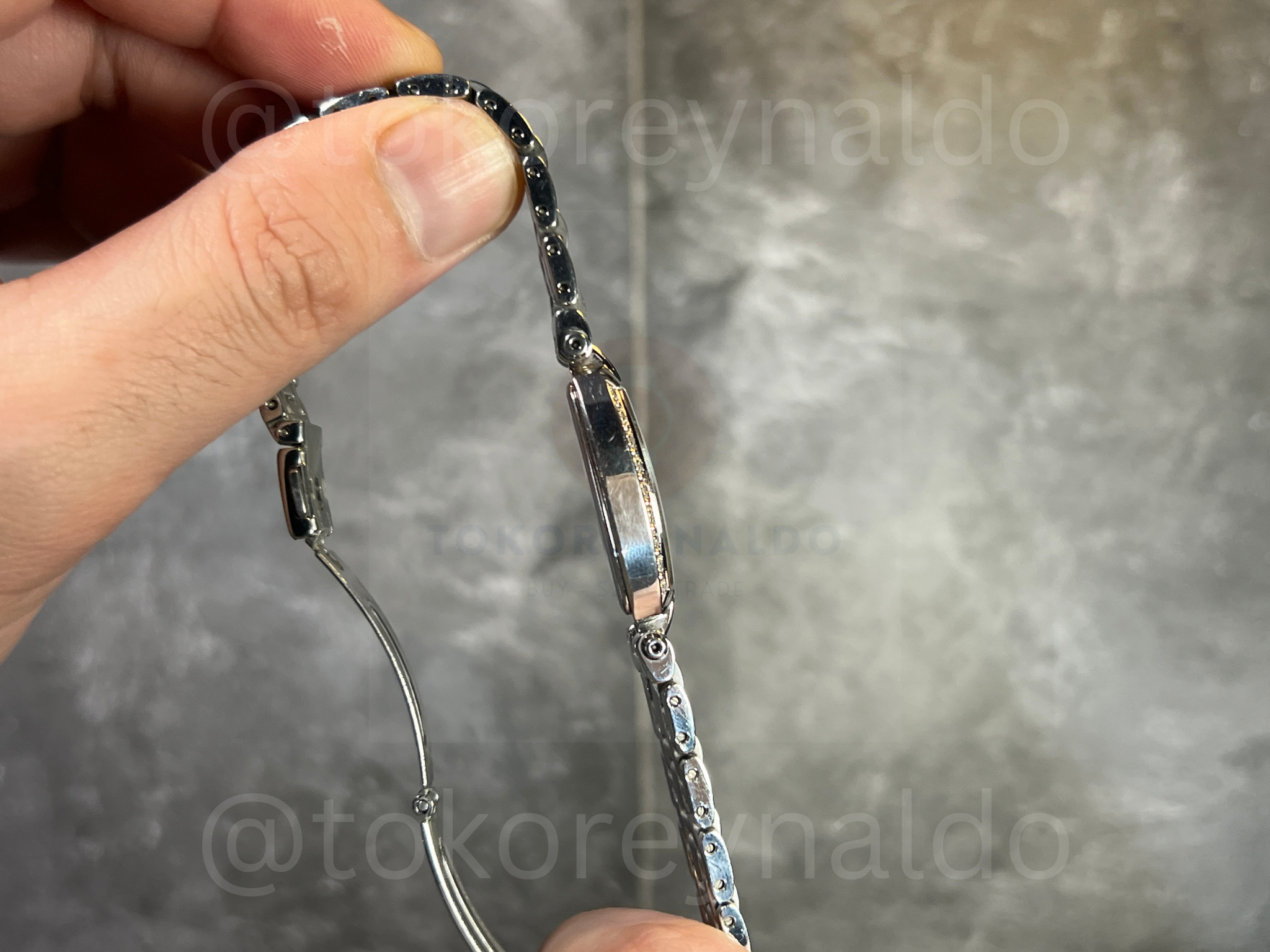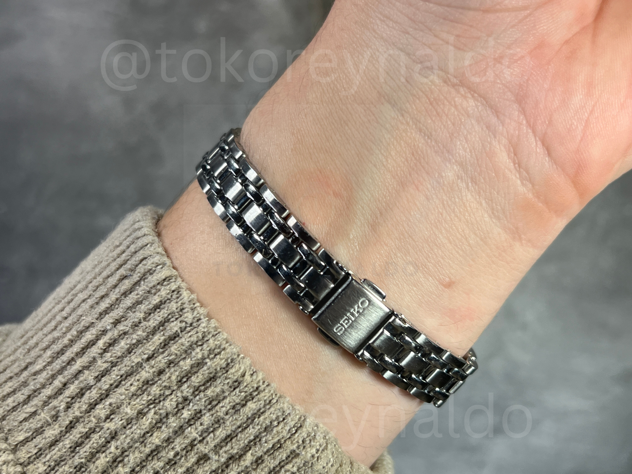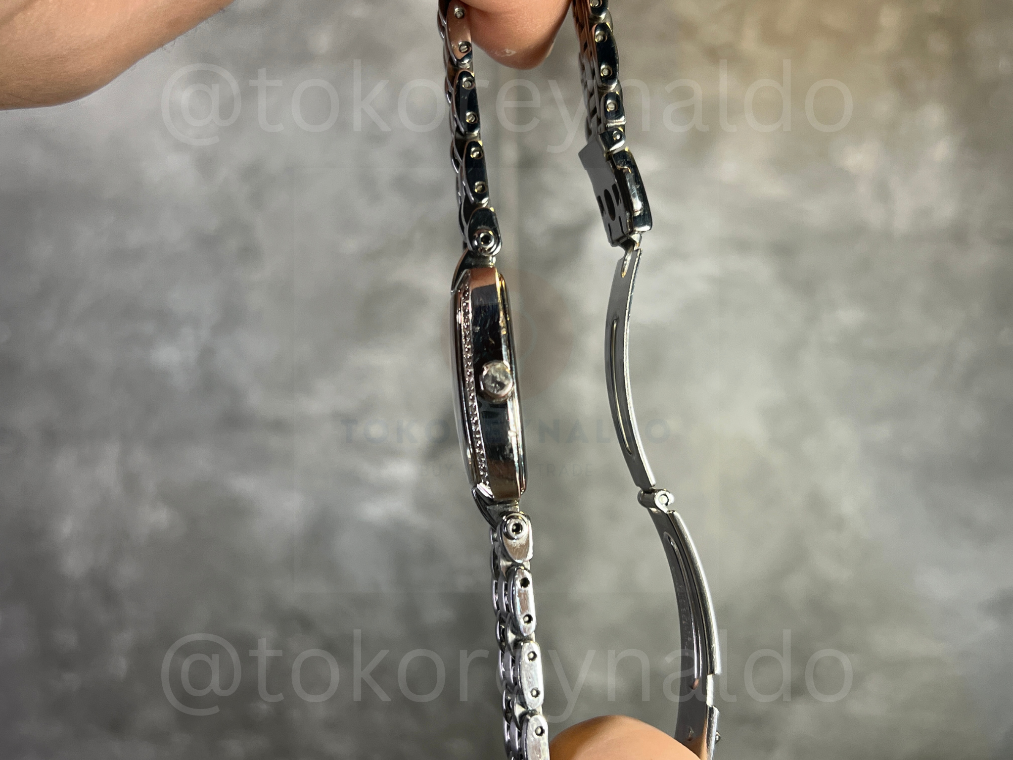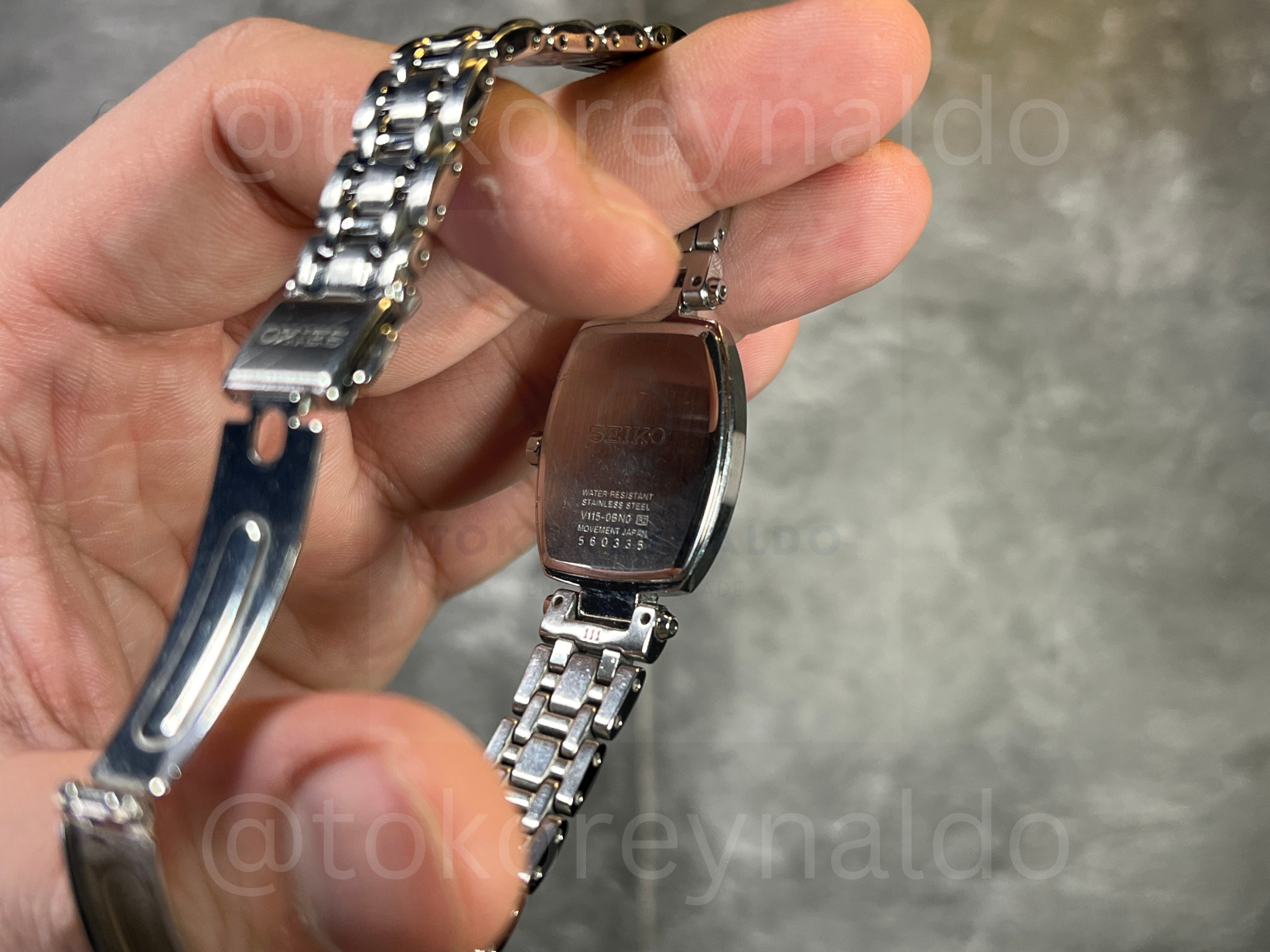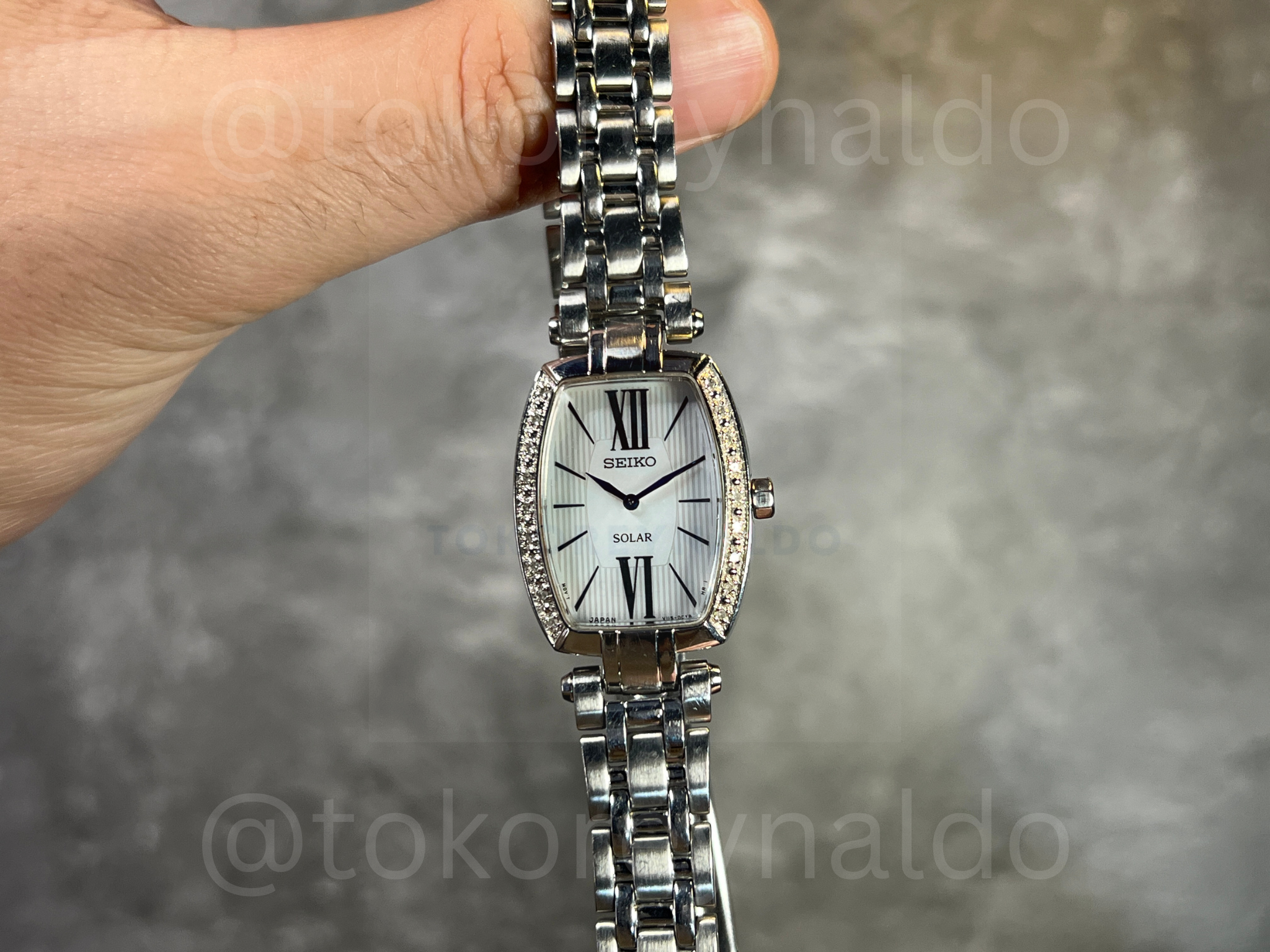 Authentic Seiko Solar (Ref. V115-0BN0) featuring an elegant tonneau-shaped stainless steel case adorned with a brilliant diamond-set bezel. This sophisticated timepiece showcases a radiant silver-white textured dial with a vertical guilloché pattern, high-contrast black Roman numeral indices at 12 and 6 o’clock, and sleek black hands. Paired with its original integrated stainless steel multi-link bracelet, it is a refined blend of sustainable technology and luxury jewelry design, available now at Toko Reynaldo.