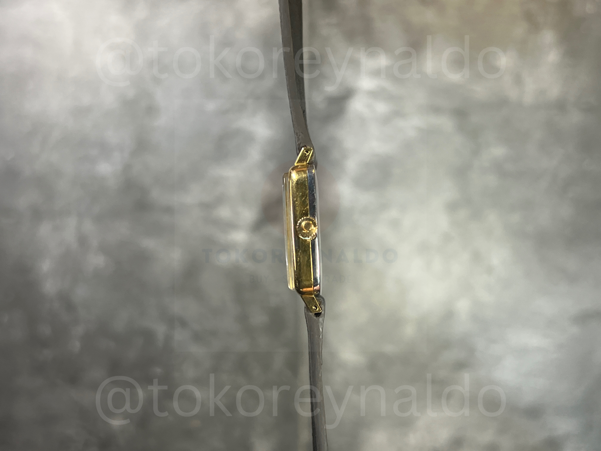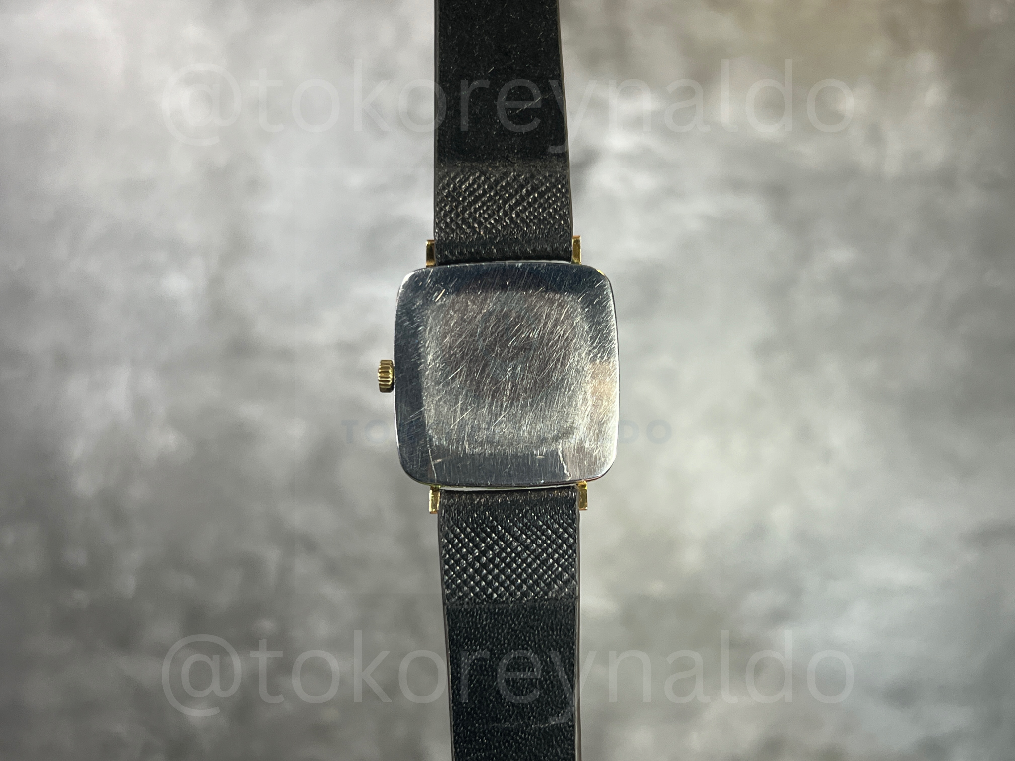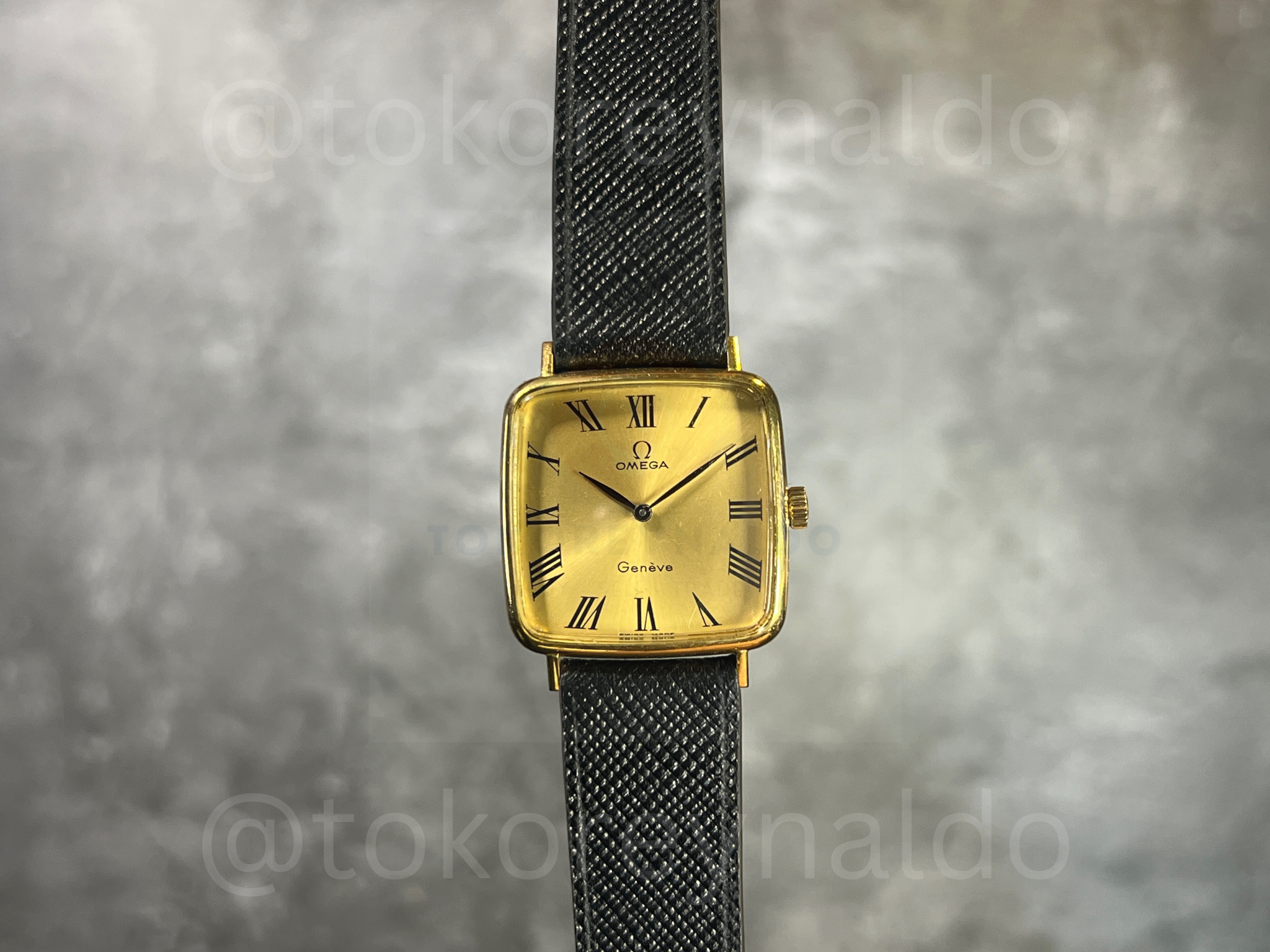 Authentic vintage 1970’s Omega Geneve featuring a classic square-shaped case in a polished gold-plated finish. This sophisticated Swiss-made dress watch showcases a radiant gold sunburst dial with traditional black Roman numeral indices and sleek baton-style hands. Paired with a premium black saffiano leather strap, it represents the height of mid-century luxury horology, available now at Toko Reynaldo.