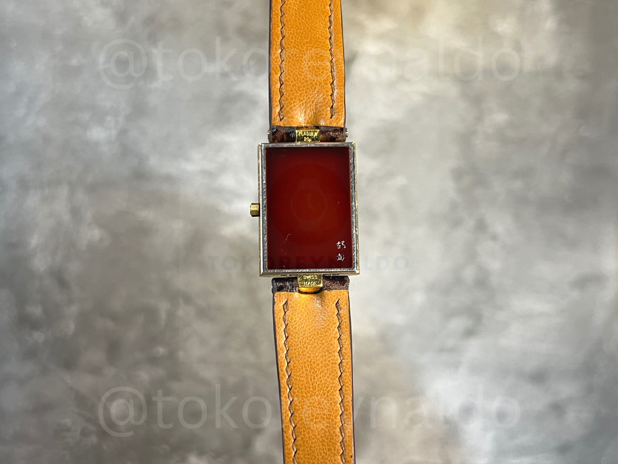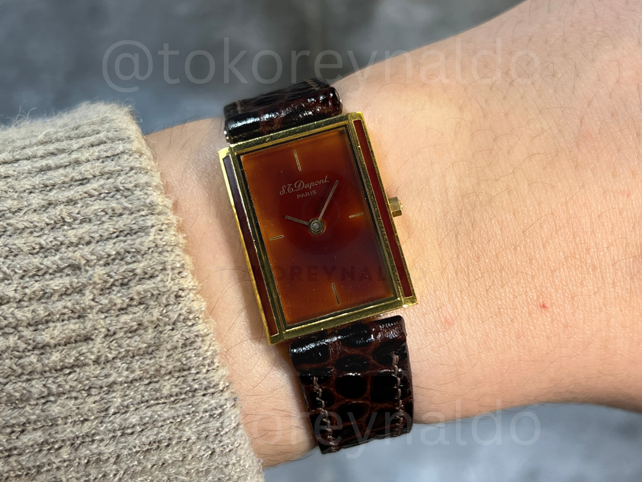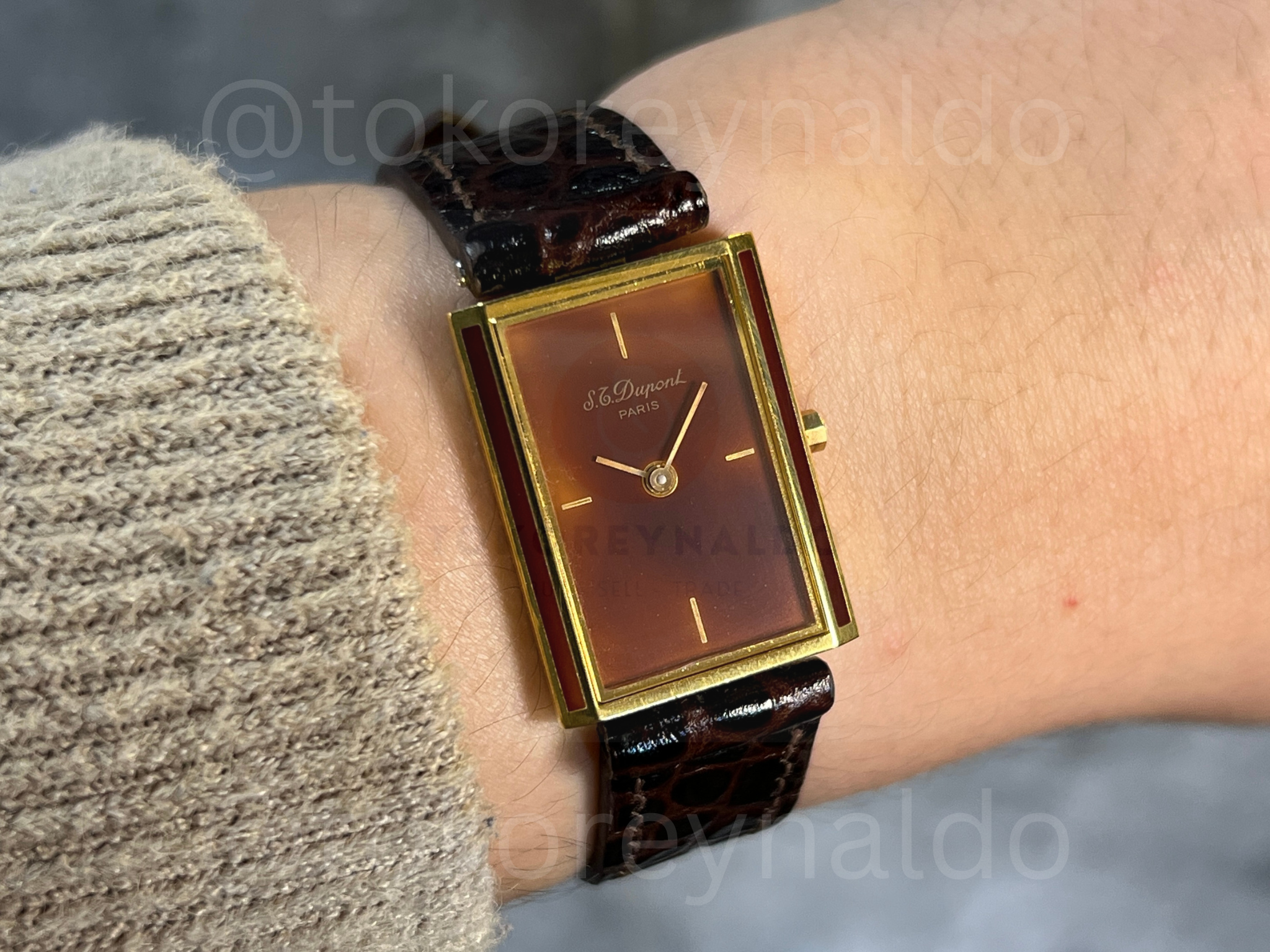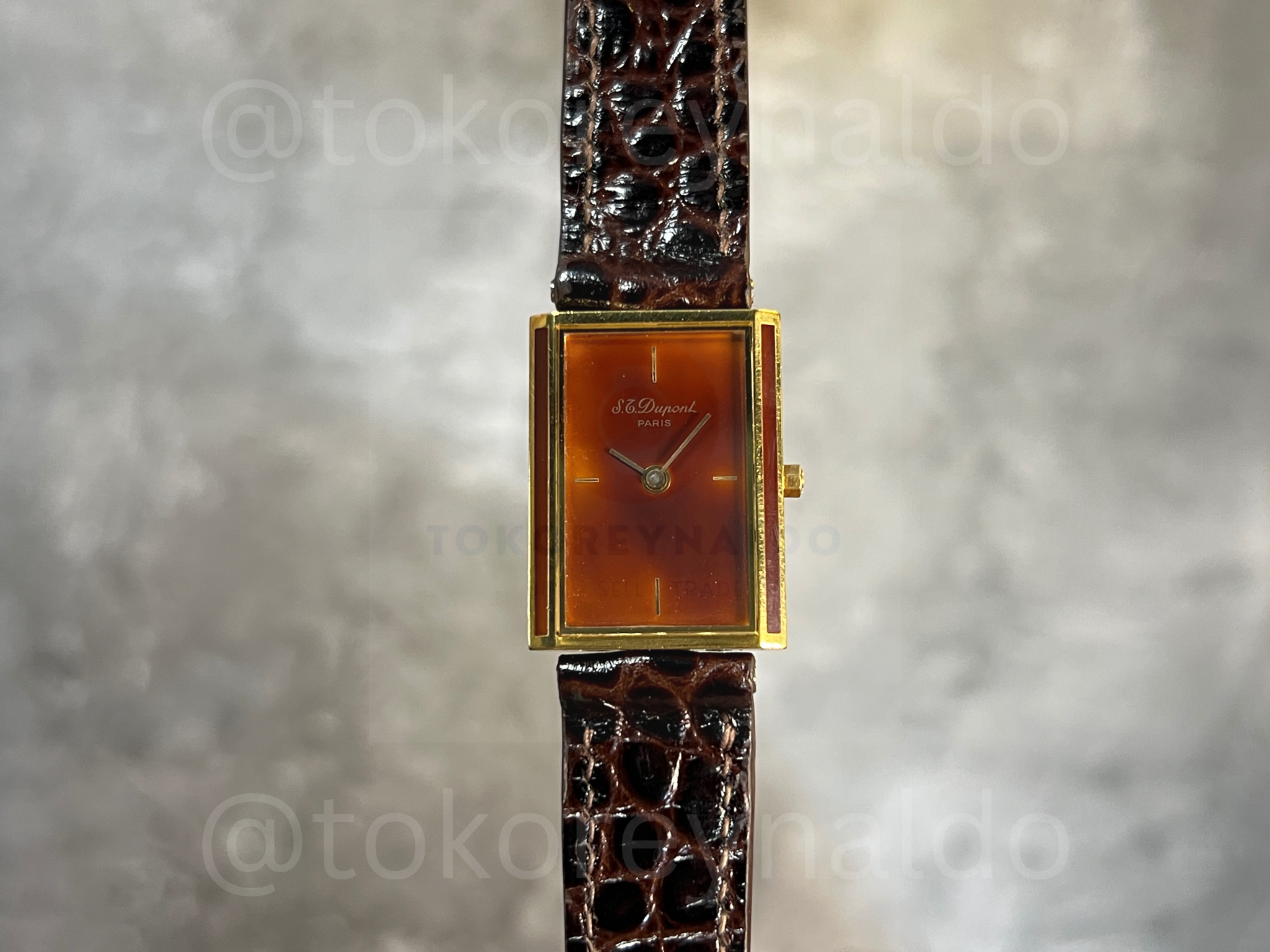Authentic vintage 1990’s S.T. Dupont featuring a classic rectangular gold-plated case finished with genuine “Laque de Chine” (Chinese Lacquer). This rare Swiss-made timepiece showcases a deep “Vulcain Coffee” brown dial with minimalist gold-tone hour markers and hands. Paired with a premium dark brown crocodile-grain leather strap, it is a masterpiece of luxury craftsmanship and elegant design, available now at Toko Reynaldo.