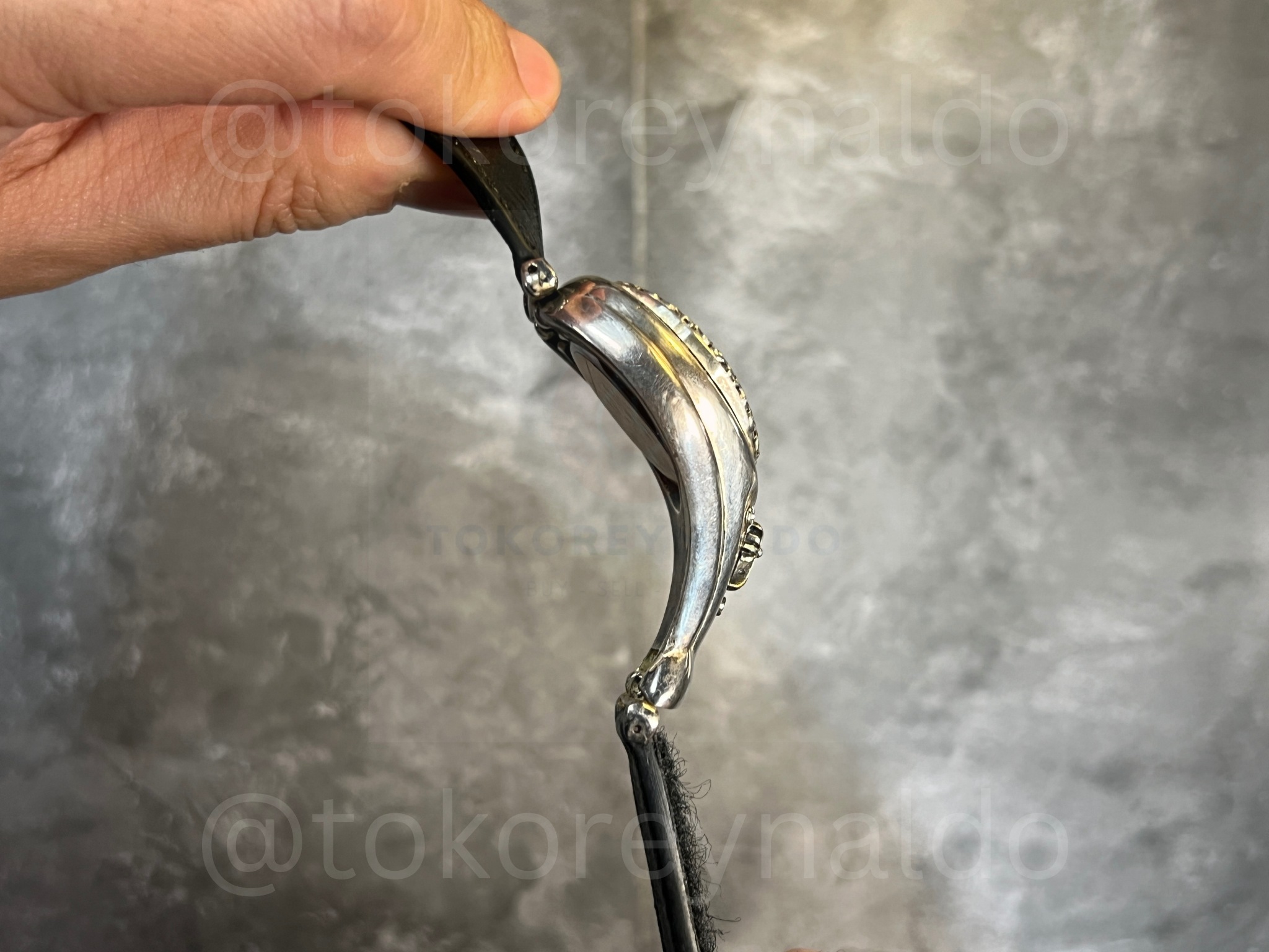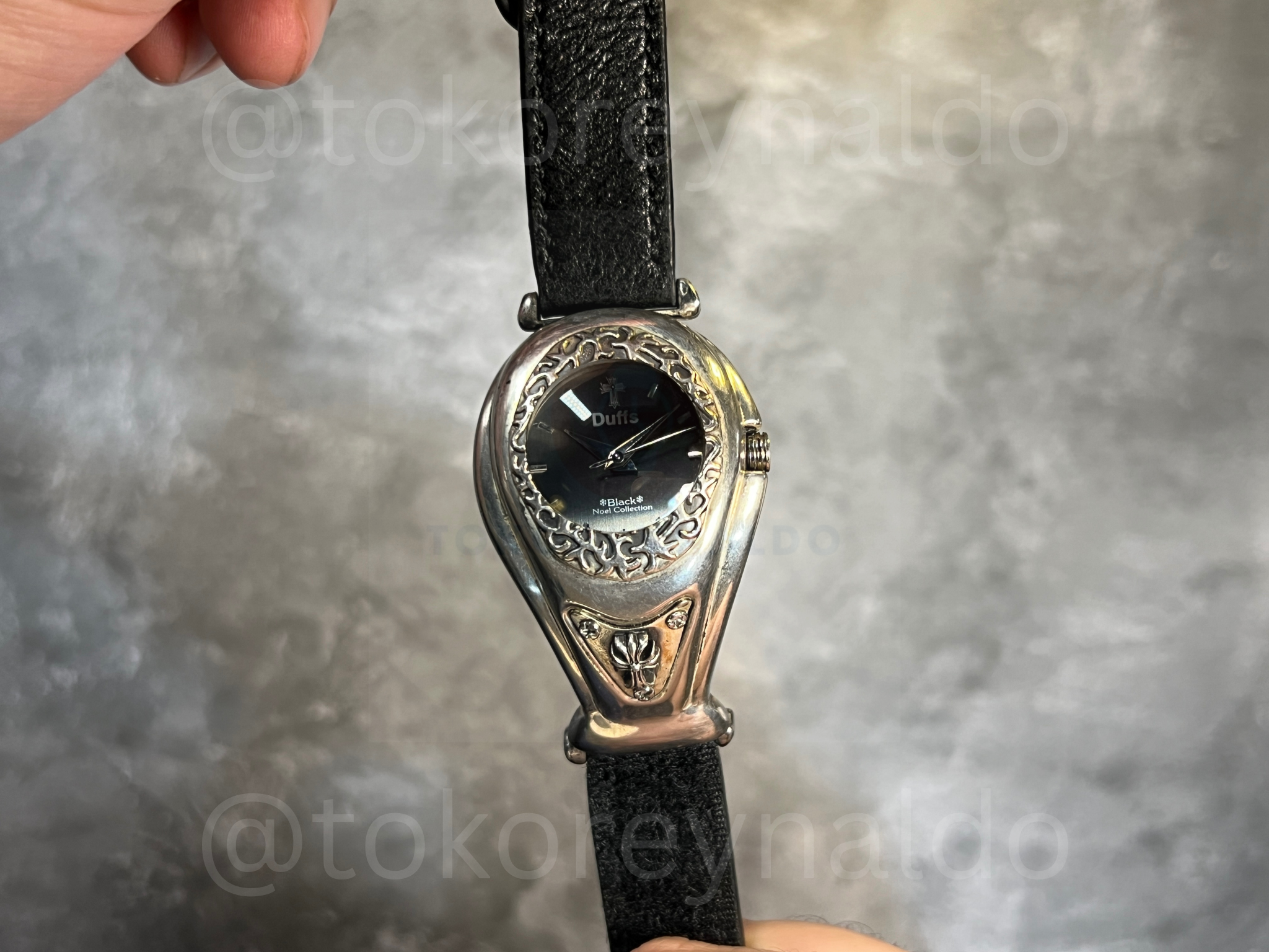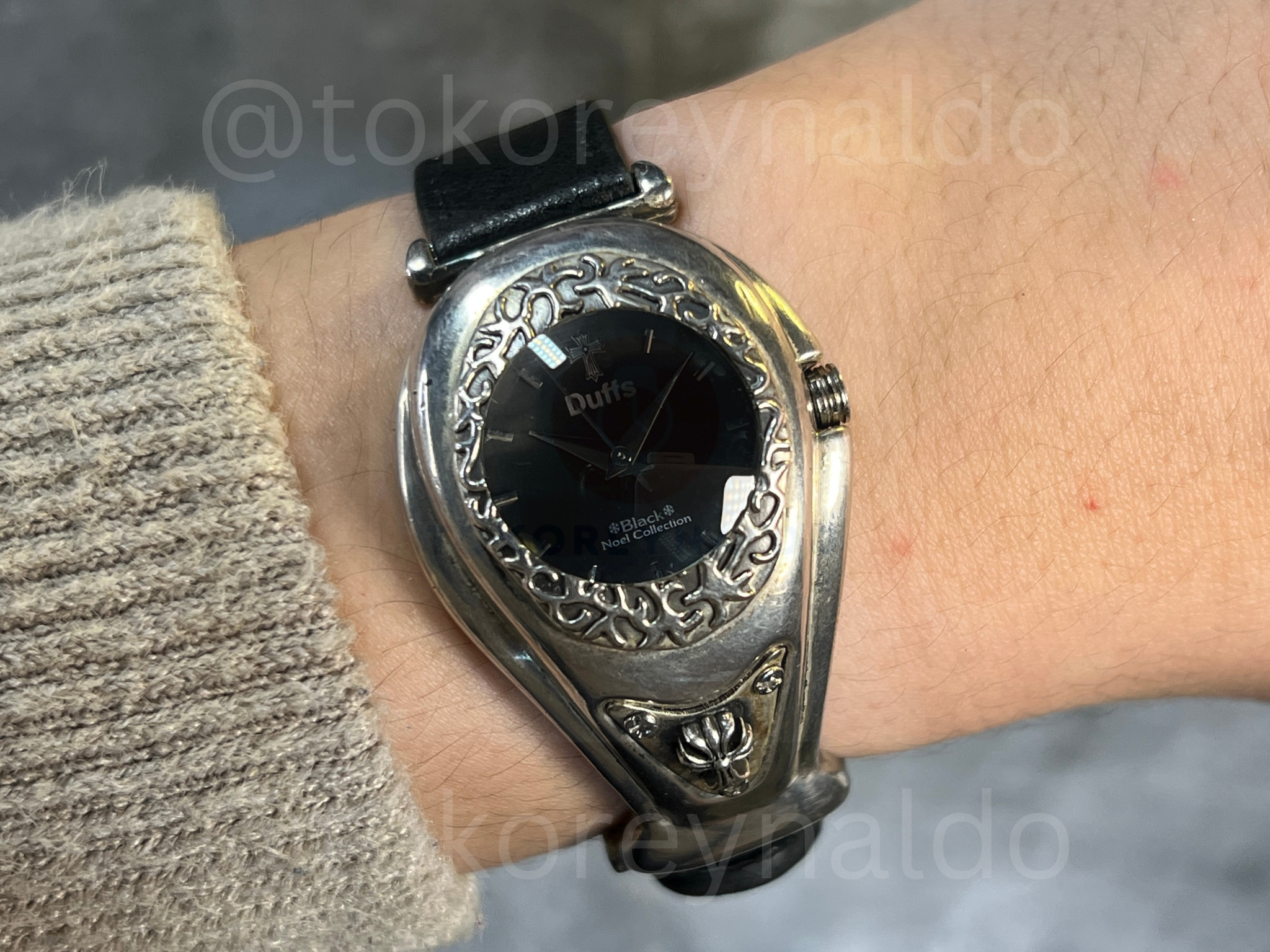 Authentic vintage 1998 Duff’s timepiece from the “Black Noel Collection” featuring a distinctive gothic-inspired design. This unique watch showcases an ornate, silver-tone textured case with intricate scrollwork, a minimalist black dial with sleek baton indices, and a signature chrome cross emblem at the 6 o’clock position. Paired with its original wide black leather cuff strap, it is a bold statement accessory for collectors of 90s alternative fashion, available now at Toko Reynaldo.