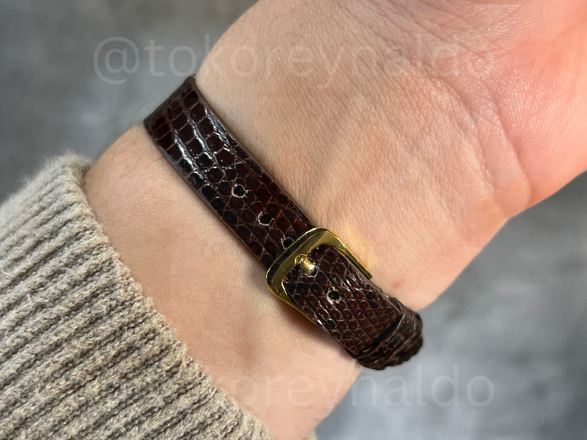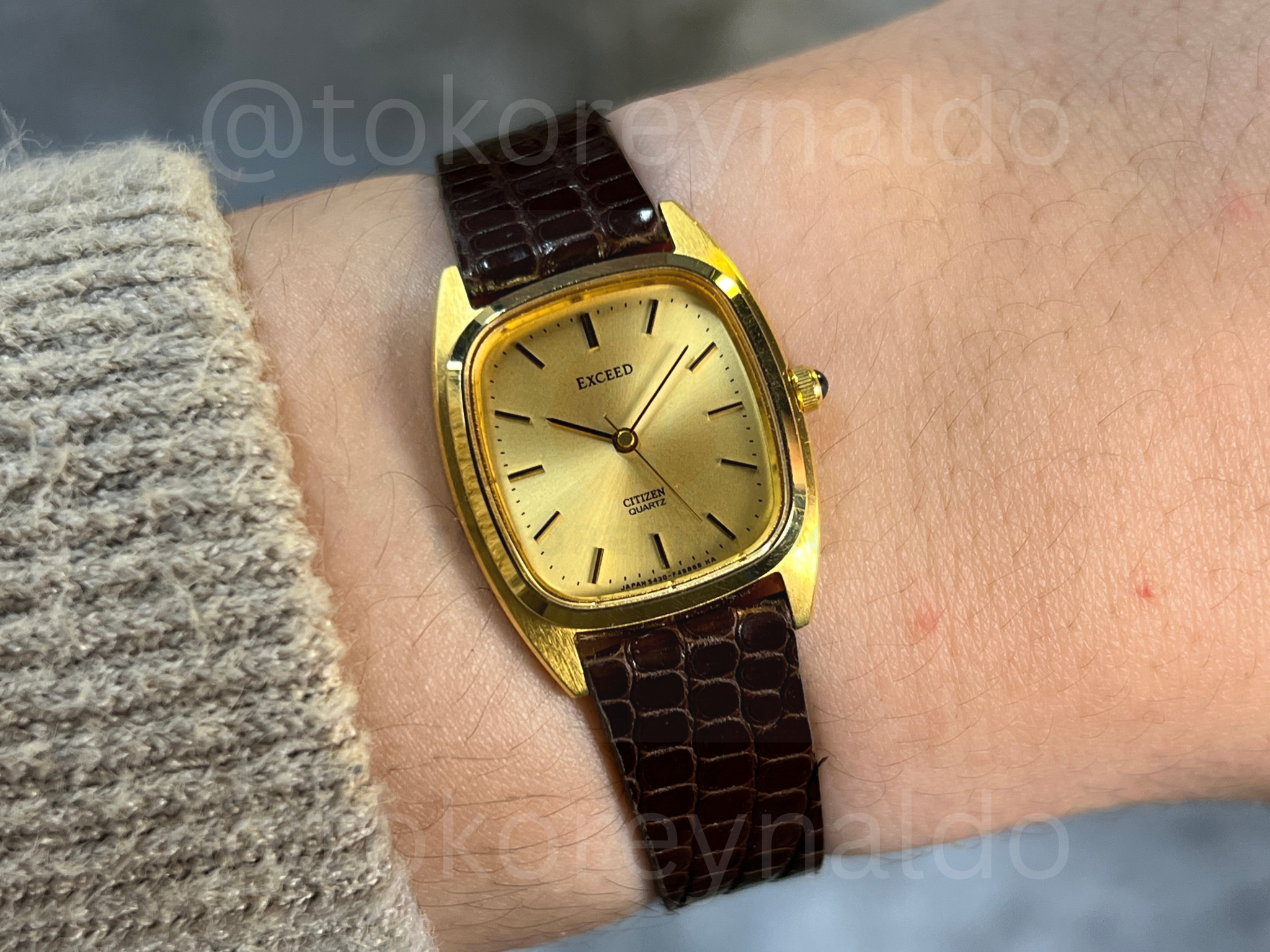 Authentic vintage Citizen Exceed featuring an elegant cushion-shaped gold-plated case and a matching gold sunburst dial. This refined Japanese dress watch showcases minimalist baton indices and is paired with a premium dark brown lizard-grain leather strap. A high-quality ultra-slim quartz timepiece for collectors, available now at Toko Reynaldo.