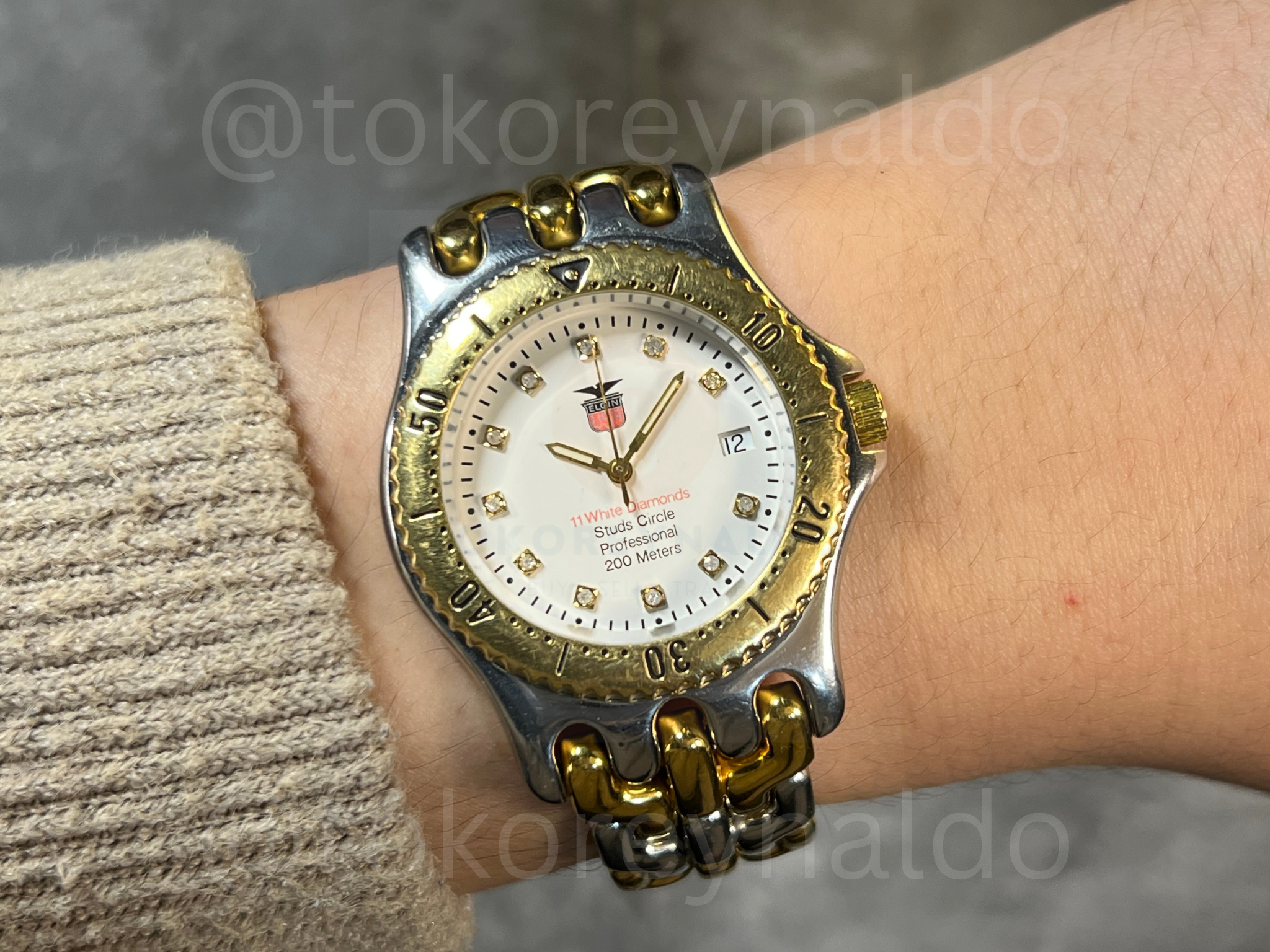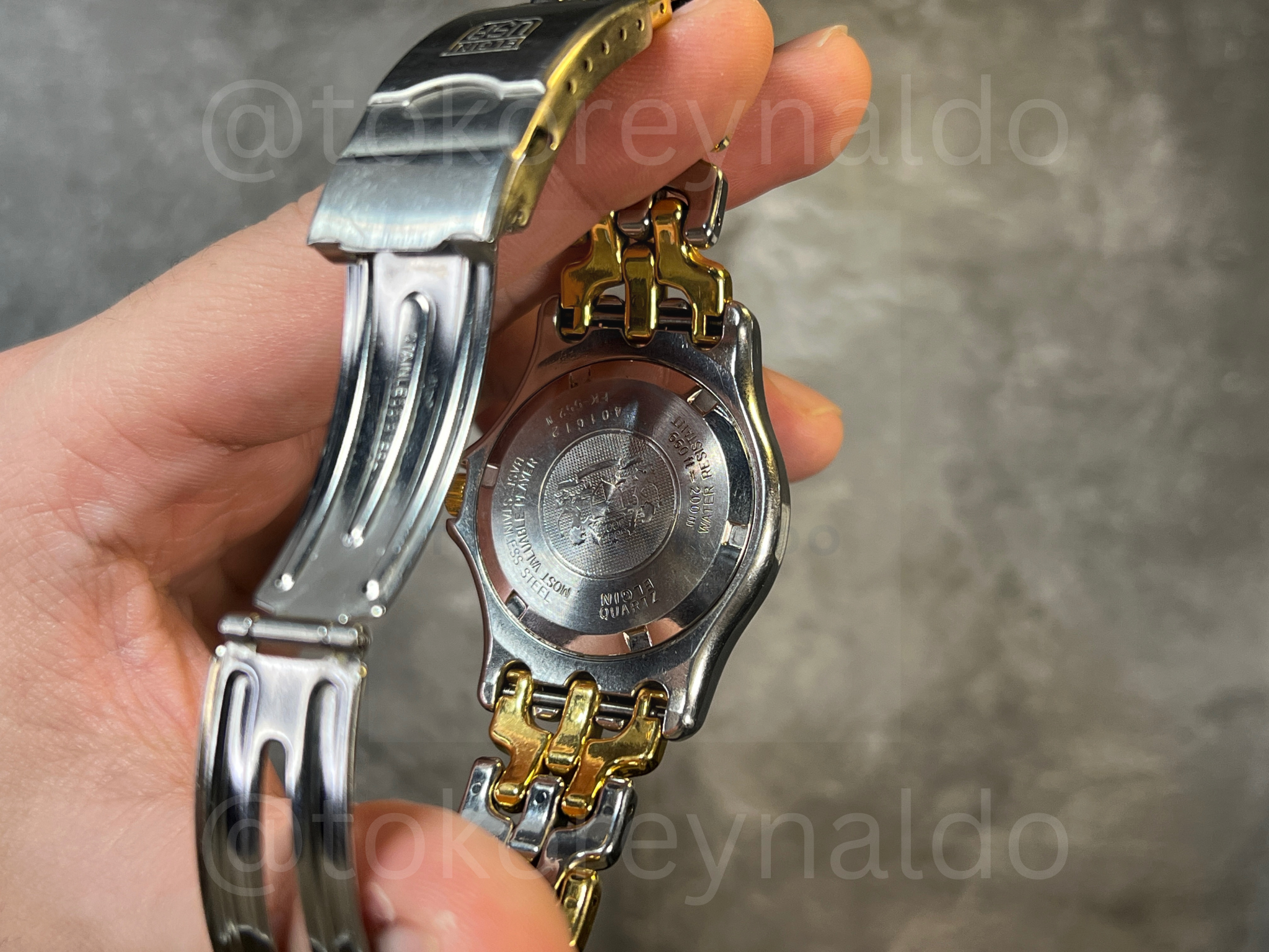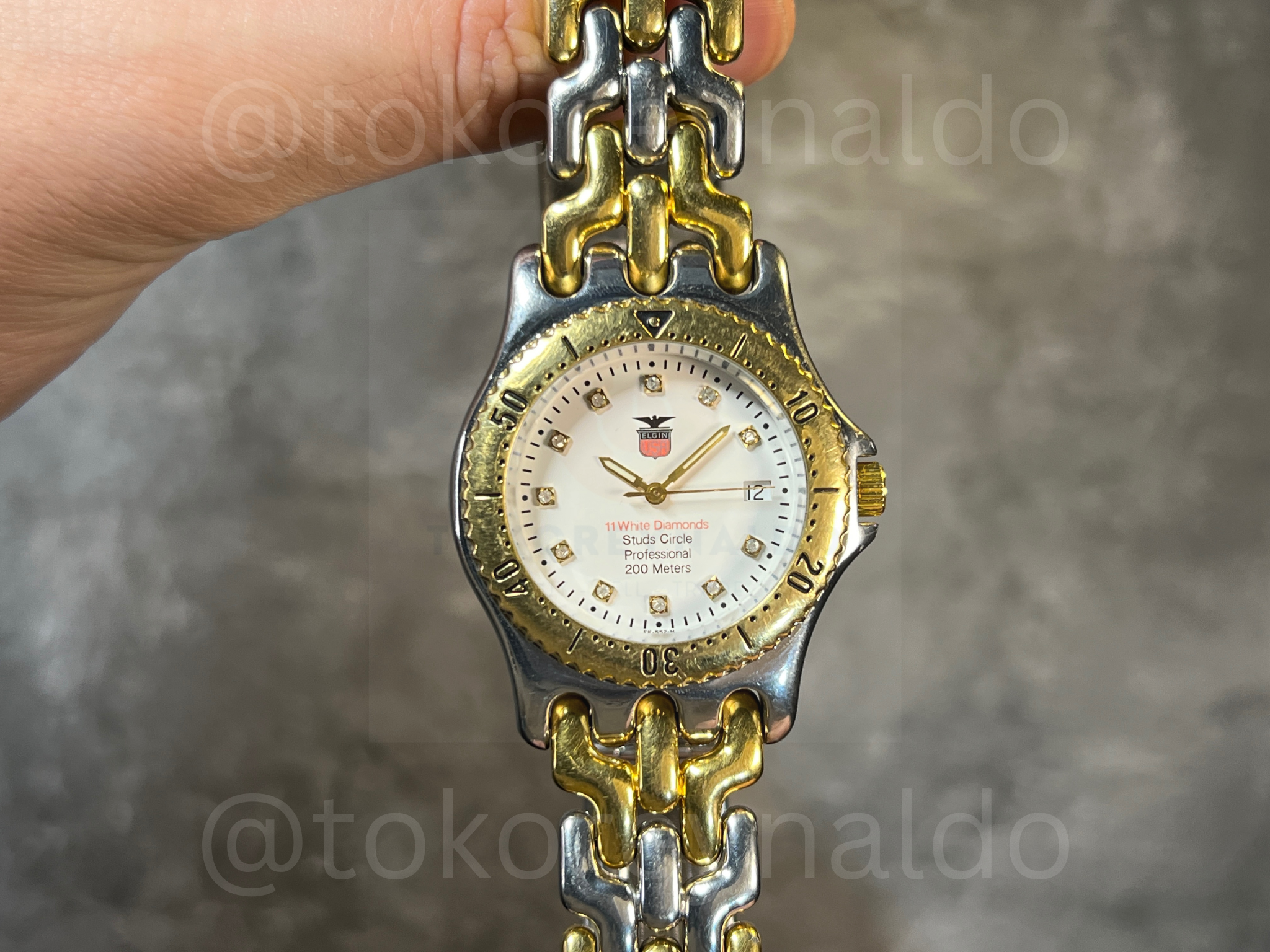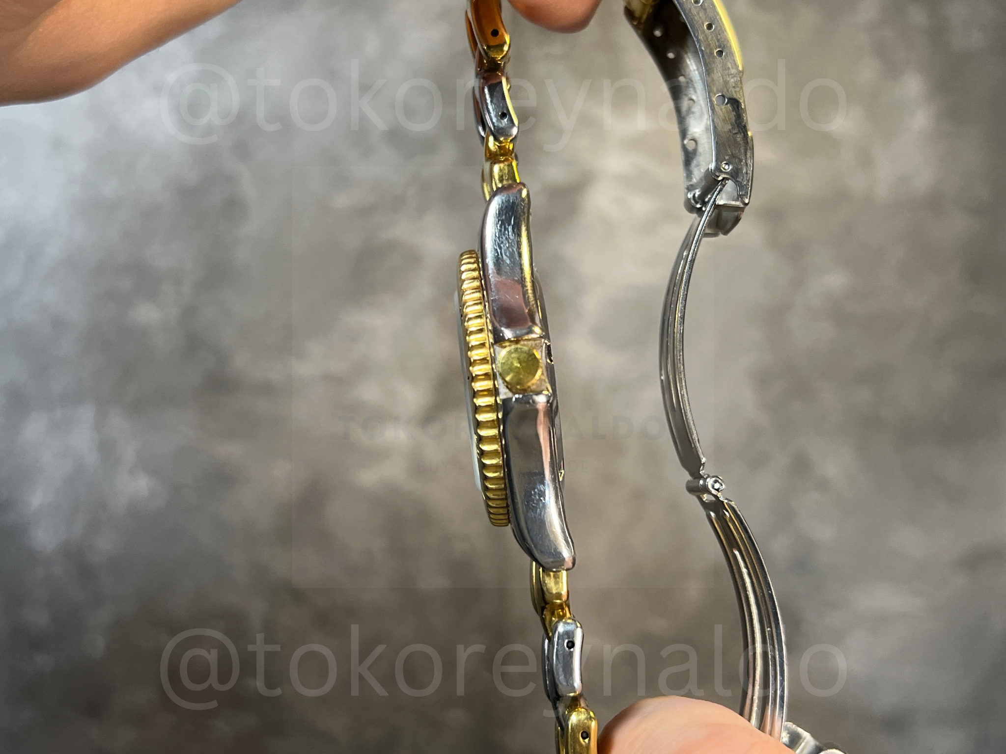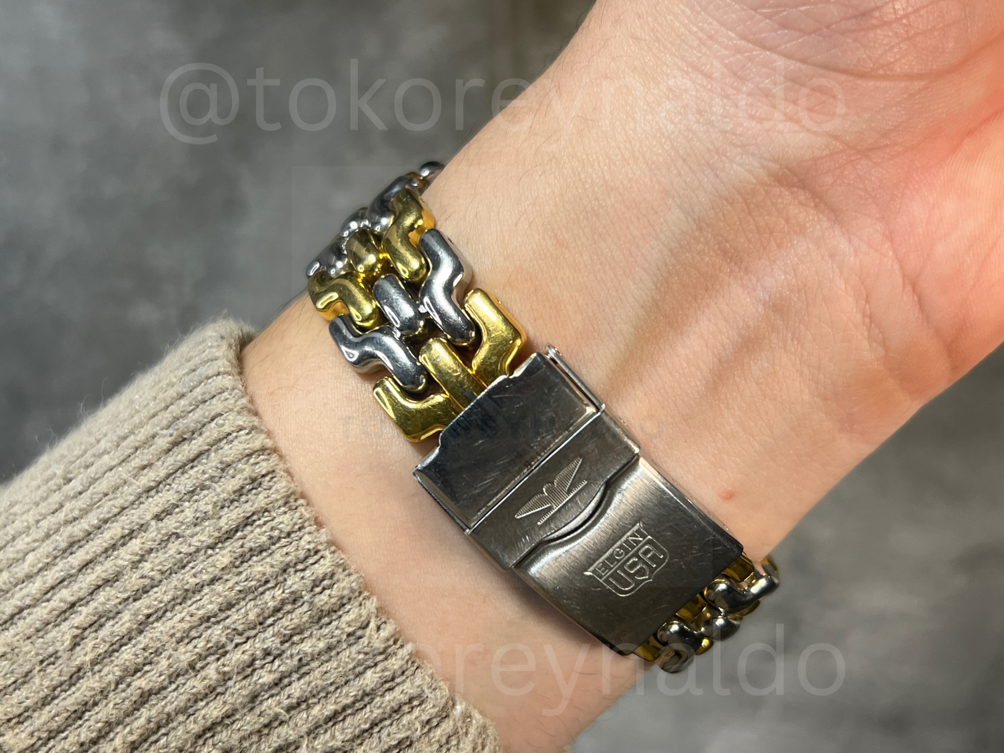 Authentic vintage Elgin US4 FK-552 N featuring a classic round two-tone case with a signature unidirectional rotating “Fish Bone” textured bezel. This striking timepiece showcases a crisp white dial accented by high-luster diamond indices at the hour markers and a practical date window at the 3 o’clock position. Paired with its original integrated two-tone “Shark Bone” link bracelet, it offers a bold luxury sport aesthetic for collectors, available now at Toko Reynaldo.