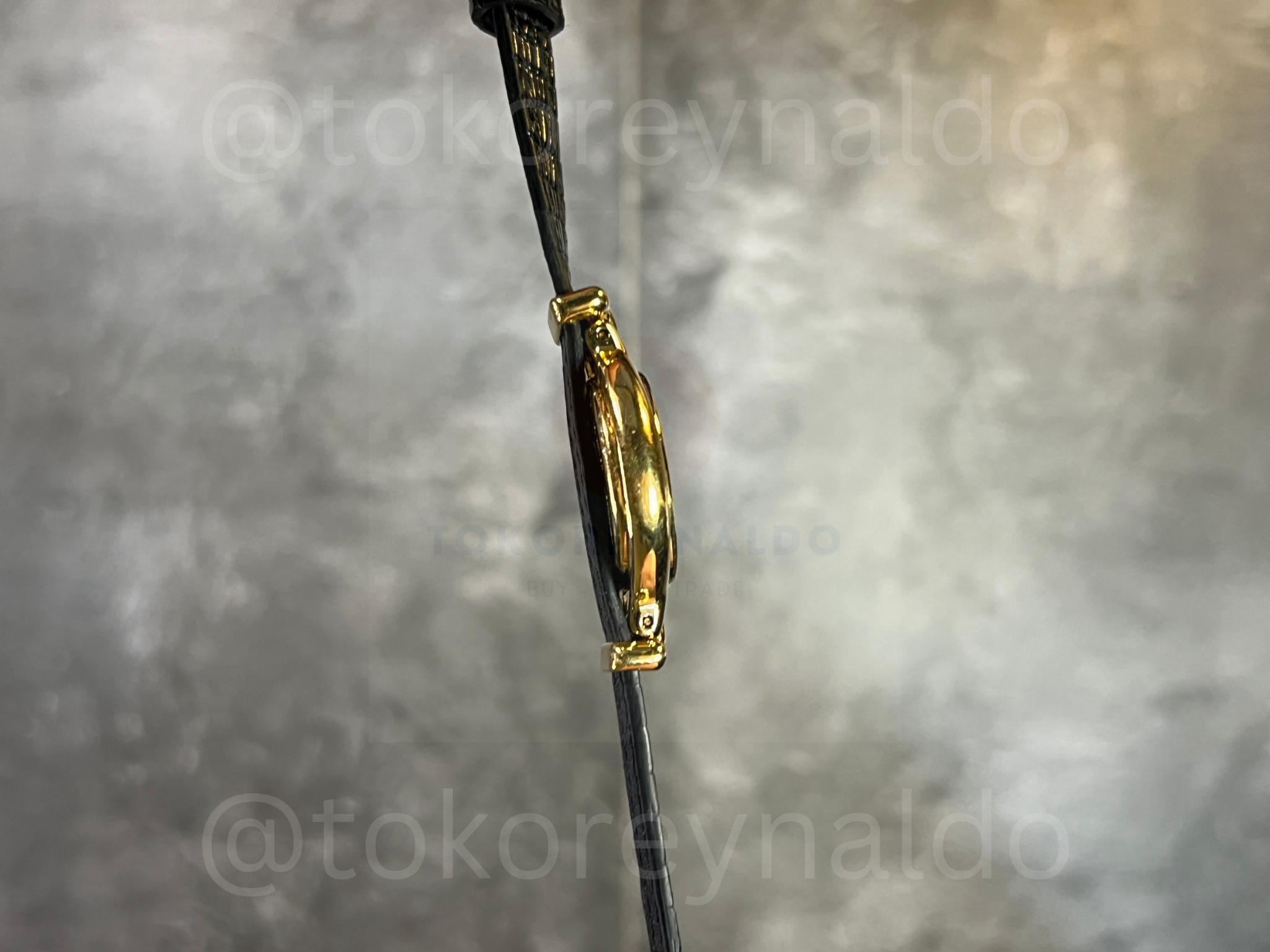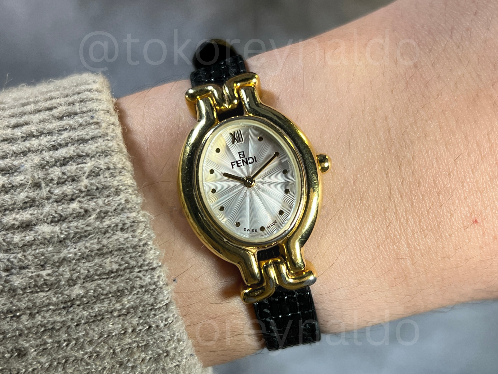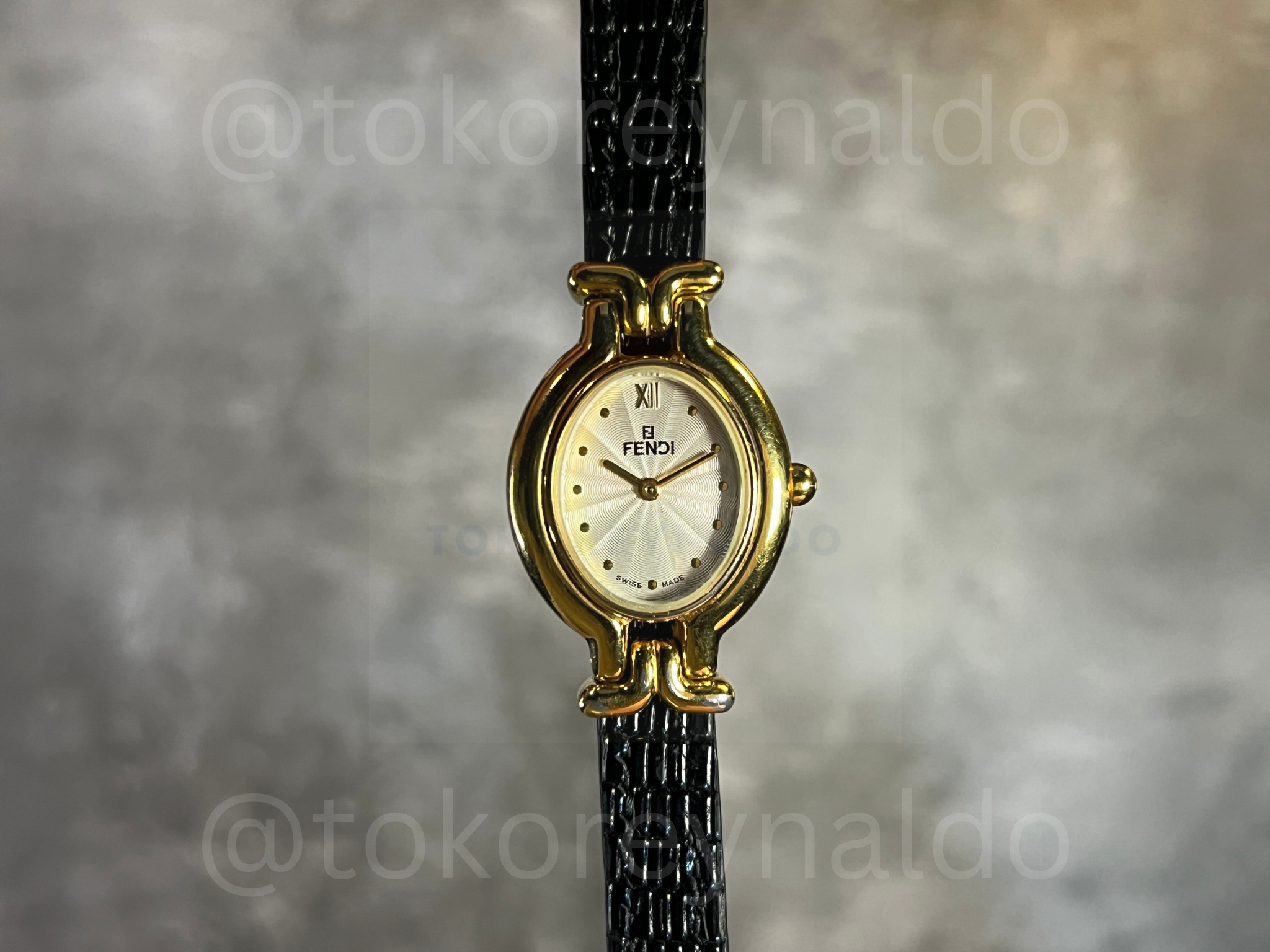 Authentic vintage Fendi 640L featuring a graceful oval-shaped case in a polished gold-plated finish with signature integrated decorative lugs. This sophisticated Swiss-made dress watch showcases a radiant silver sunburst dial with minimalist gold-tone dot indices and elegant leaf-style hands. Paired with its original black lizard-grain leather strap, it is a timeless statement of Italian luxury for collectors, available now at Toko Reynaldo.