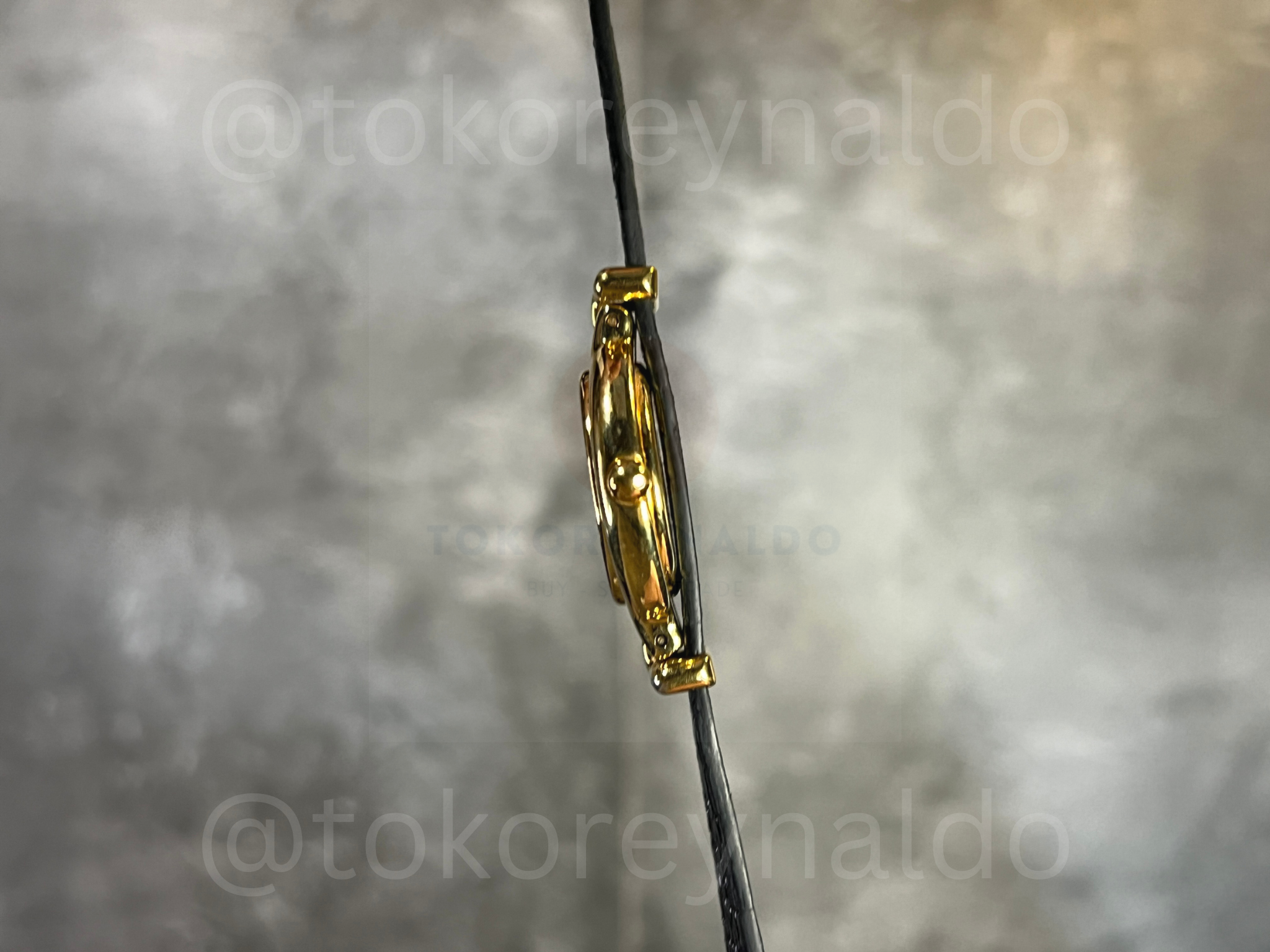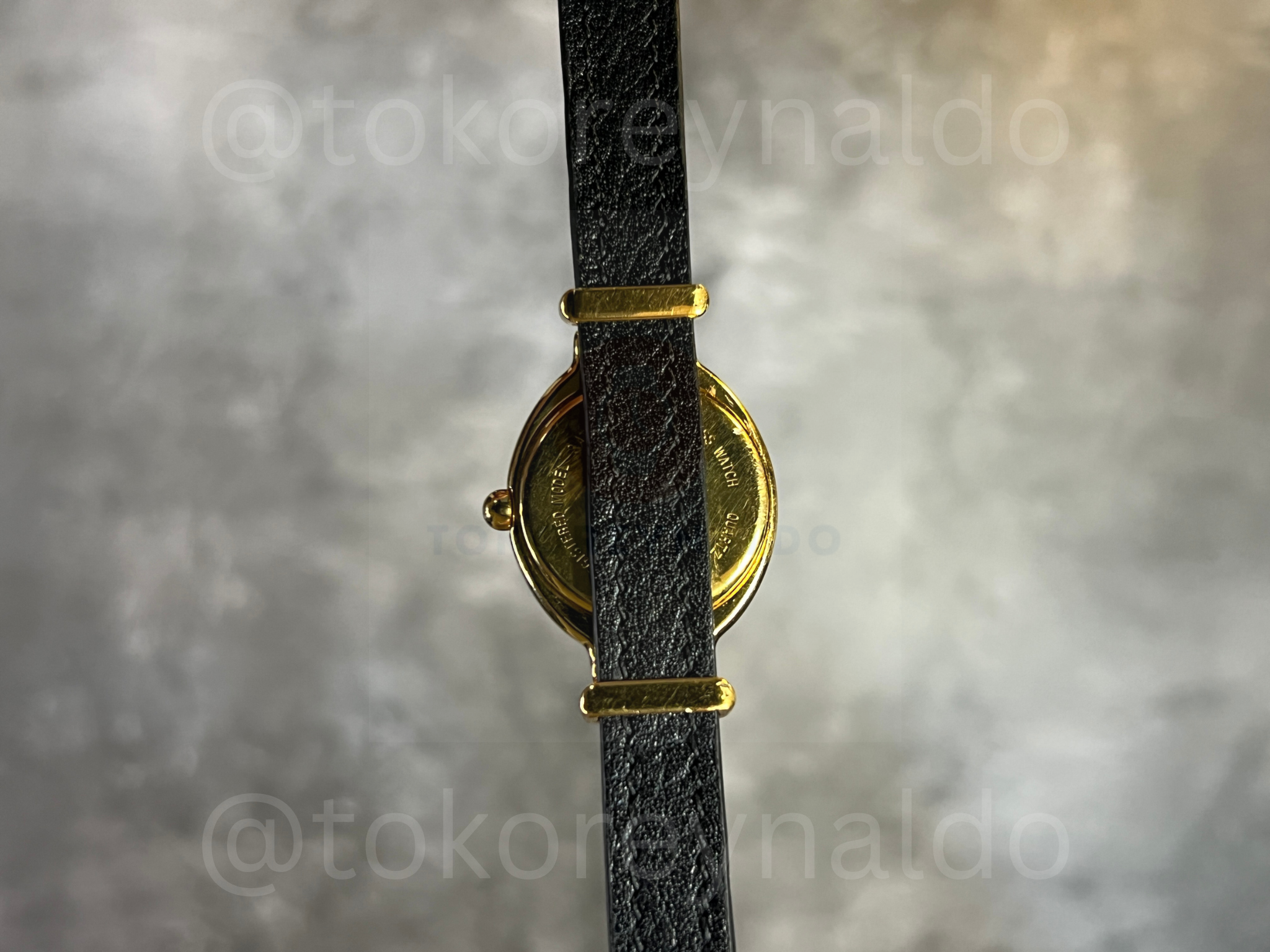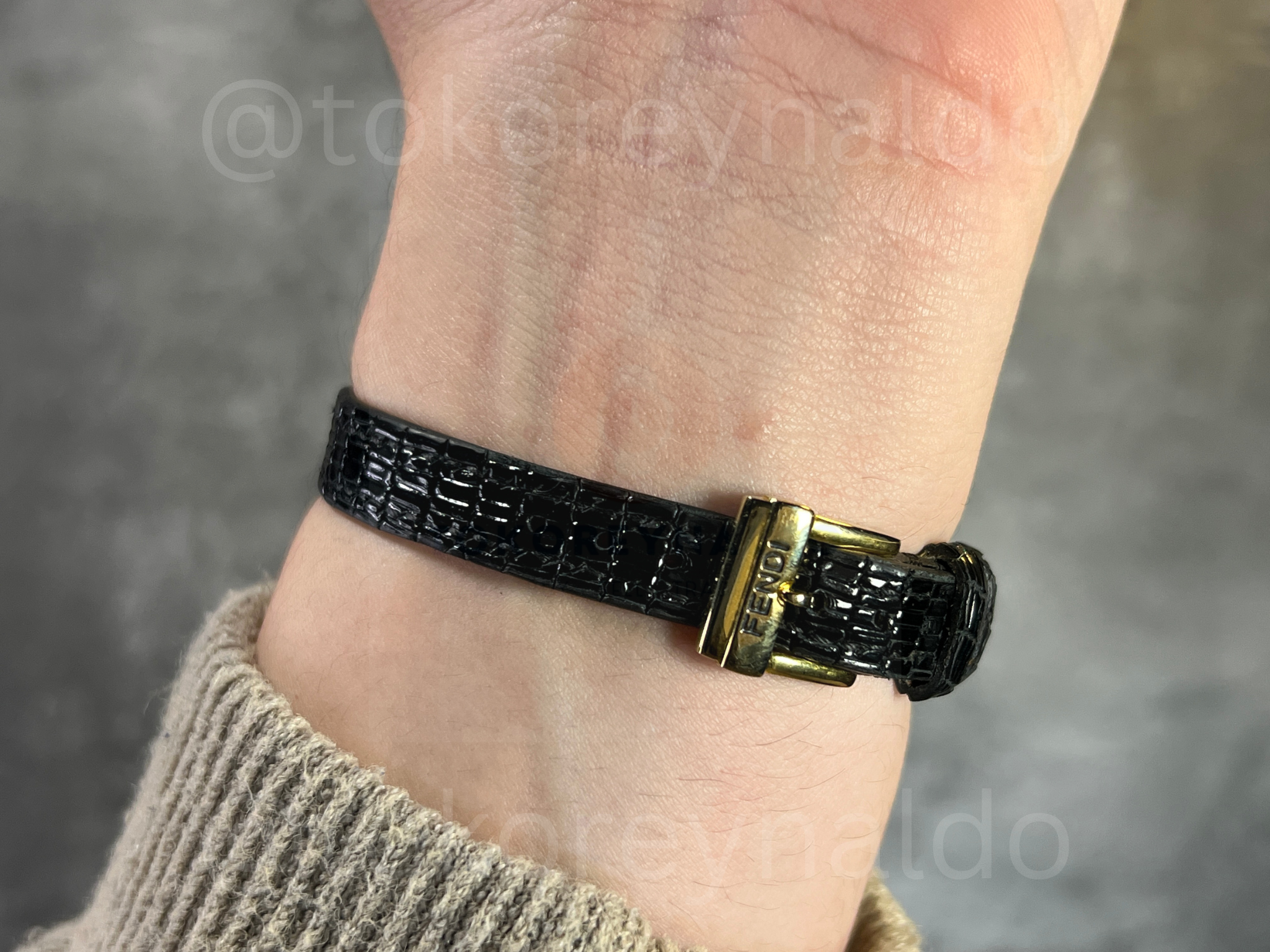 Authentic vintage Fendi 640L featuring a graceful oval-shaped case in a polished gold-plated finish with signature integrated decorative lugs. This sophisticated Swiss-made dress watch showcases a radiant silver sunburst dial with minimalist gold-tone dot indices and elegant leaf-style hands. Paired with its original black lizard-grain leather strap, it is a timeless statement of Italian luxury for collectors, available now at Toko Reynaldo.