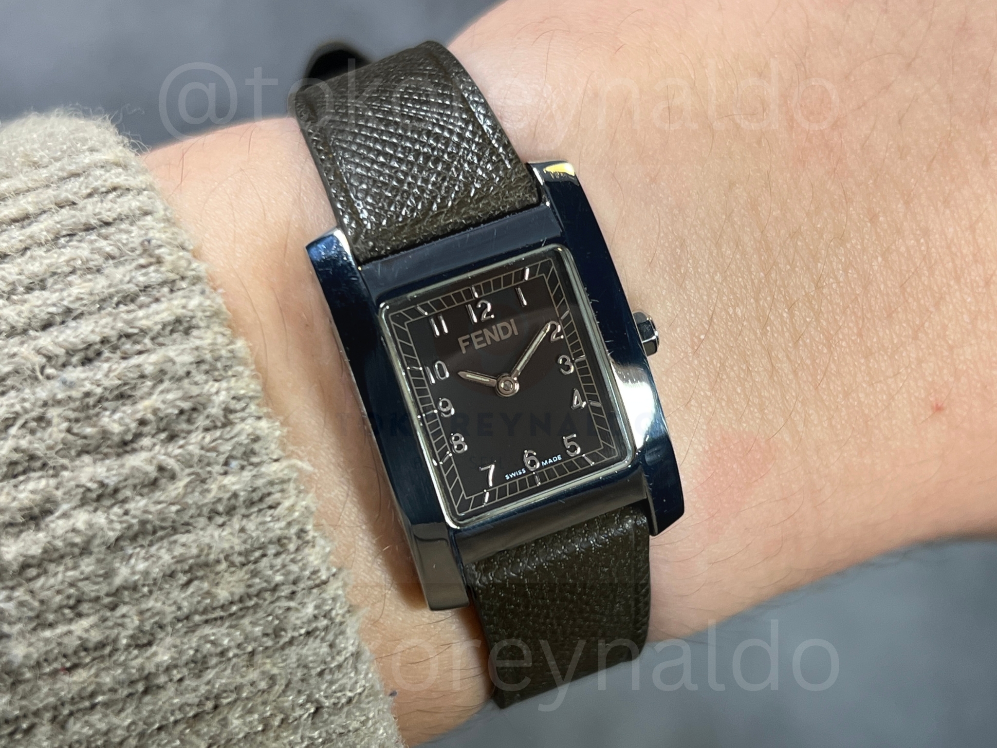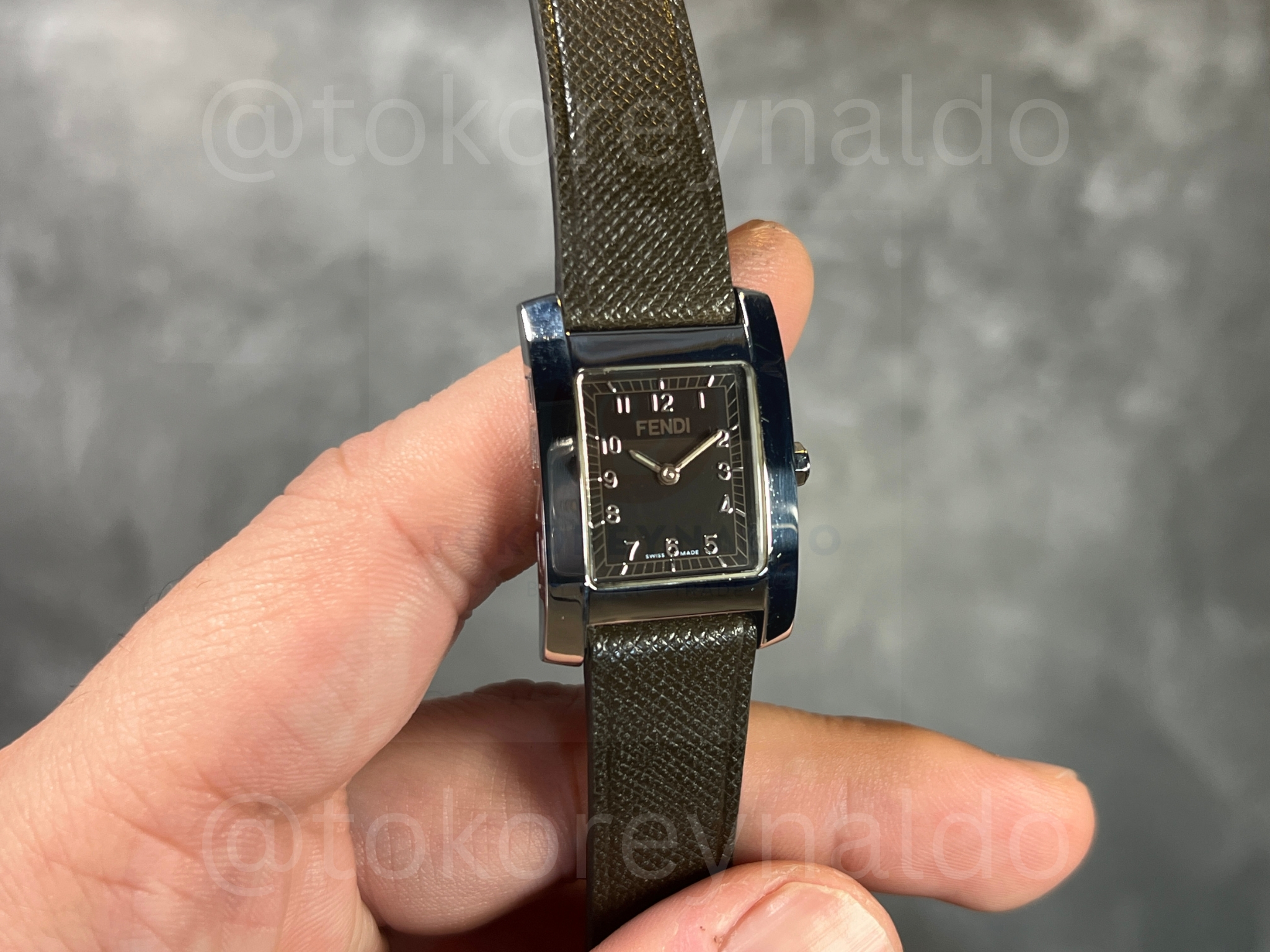 Authentic vintage Fendi (Ref. 7000L) featuring a sophisticated rectangular “tank” case in a high-polish stainless steel finish. This iconic Swiss-made dress watch showcases a sleek black dial with a unique combination of silver-tone Arabic numeral hour markers and minimalist baton indices, framed by a delicate outer railway minute track. Paired with a premium olive green saffiano leather strap, it is a refined statement of Italian fashion and Swiss precision, available now at Toko Reynaldo.