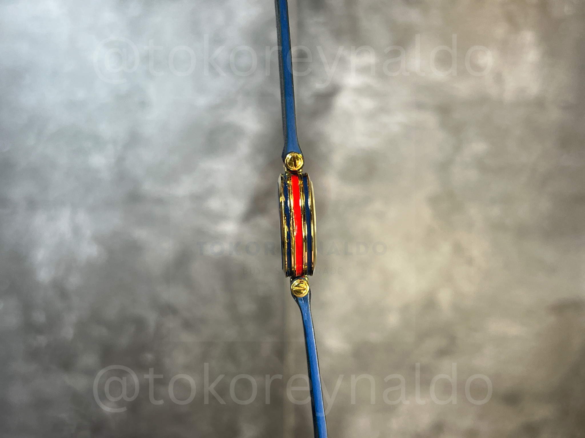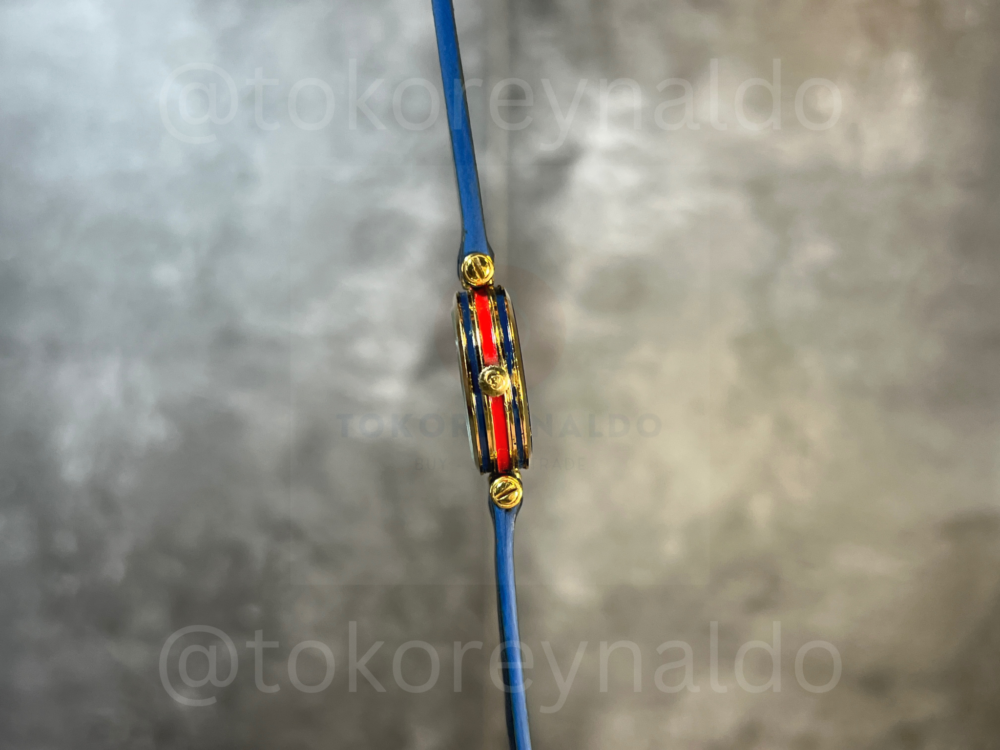 Authentic vintage Gucci 2000L featuring a classic small round gold-plated case with iconic red and green enamel accents on the side profile. This signature Swiss-made timepiece showcases a rare two-tone dial with a cream center and a vibrant blue outer ring accented by gold Roman numeral hour markers. Paired with a premium navy blue leather strap and unique gold-tone T-bar lugs, it is a timeless and highly collectible luxury accessory, available now at Toko Reynaldo.