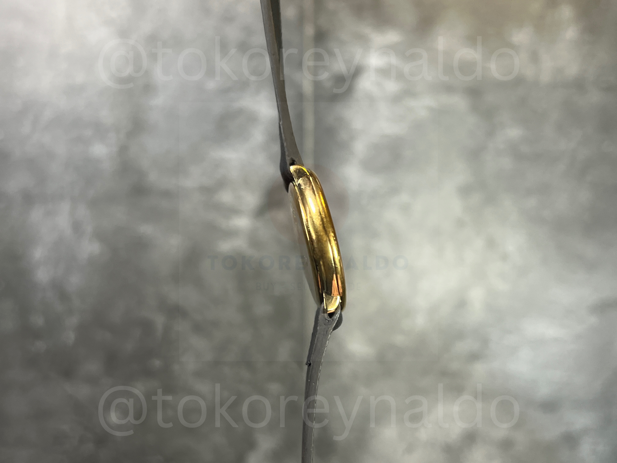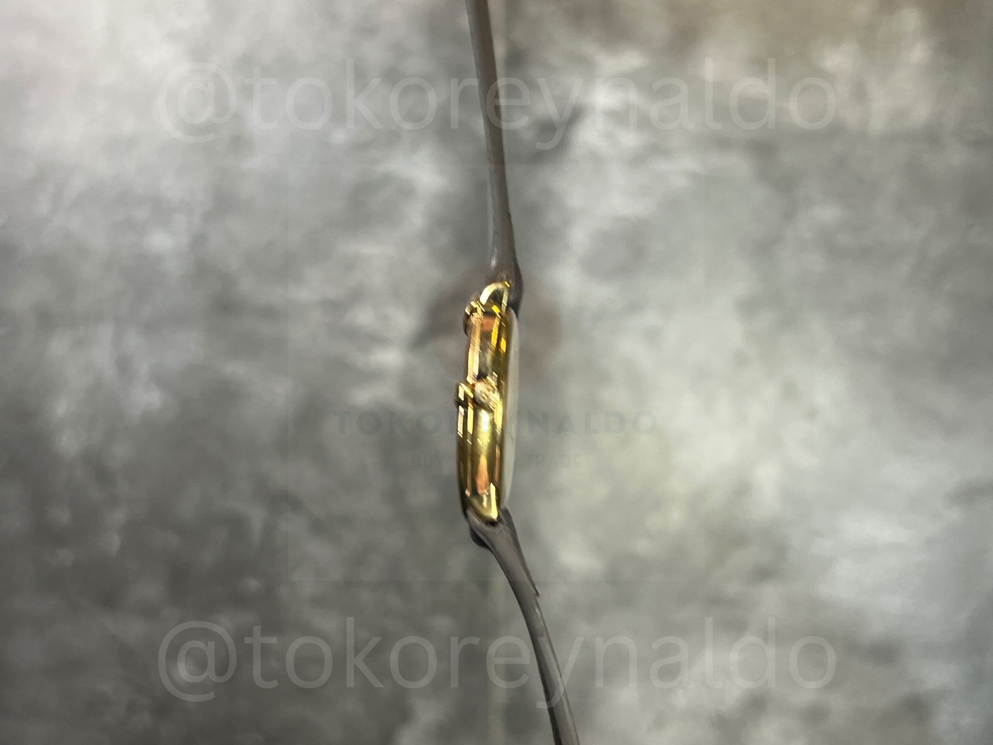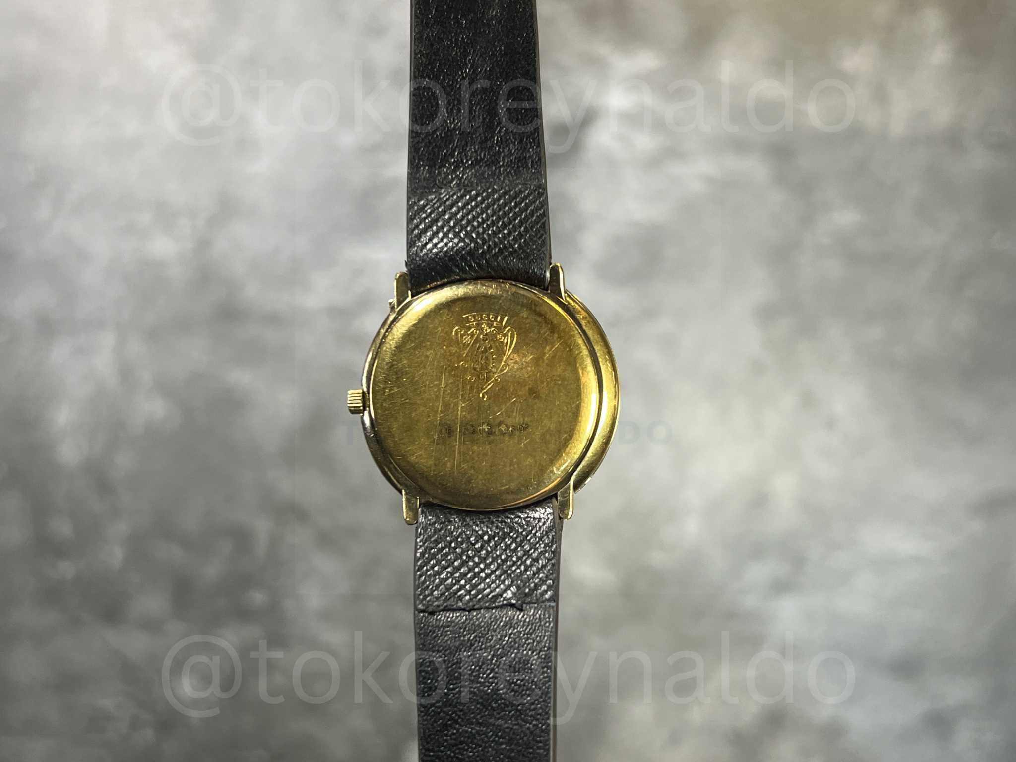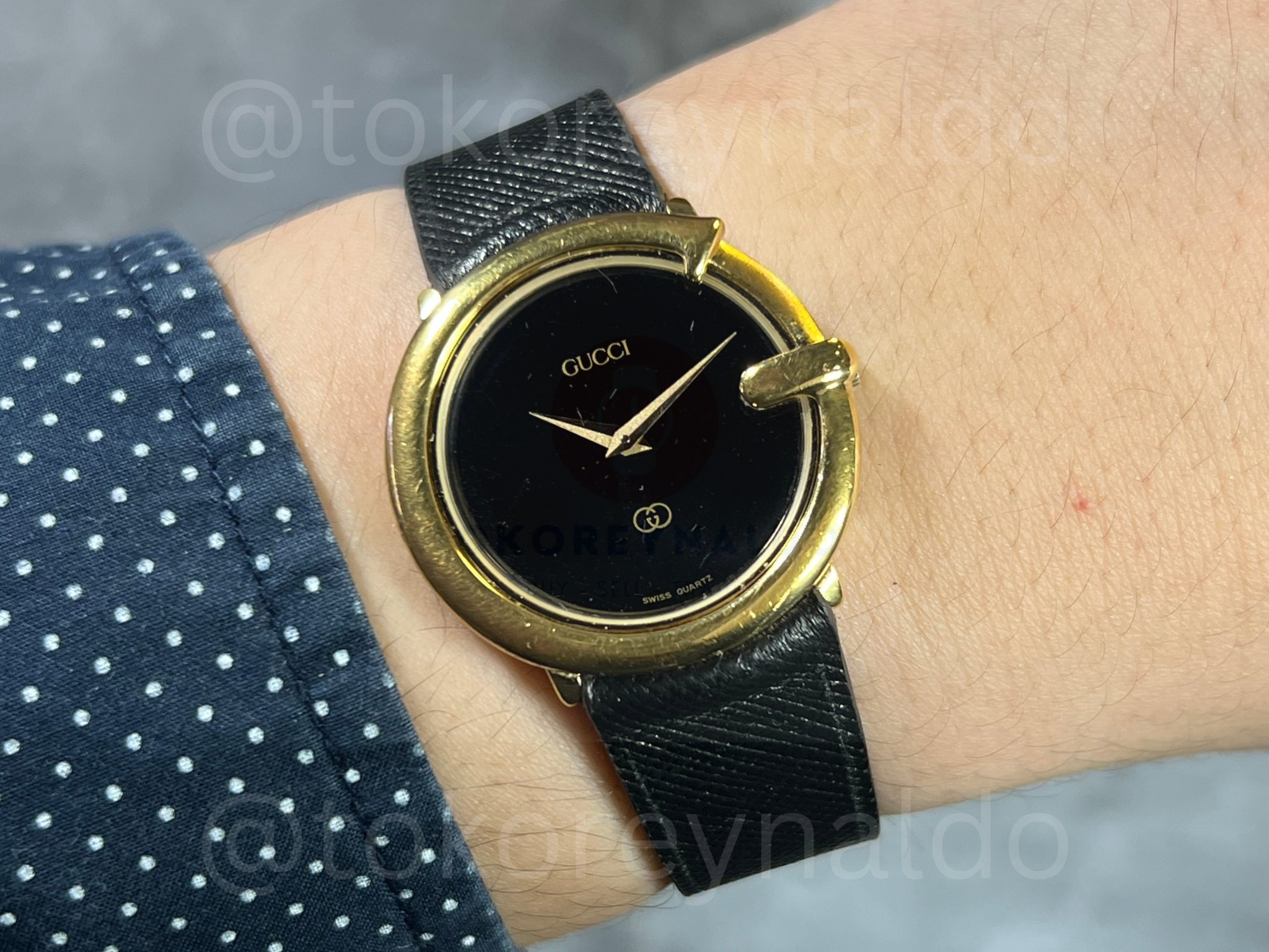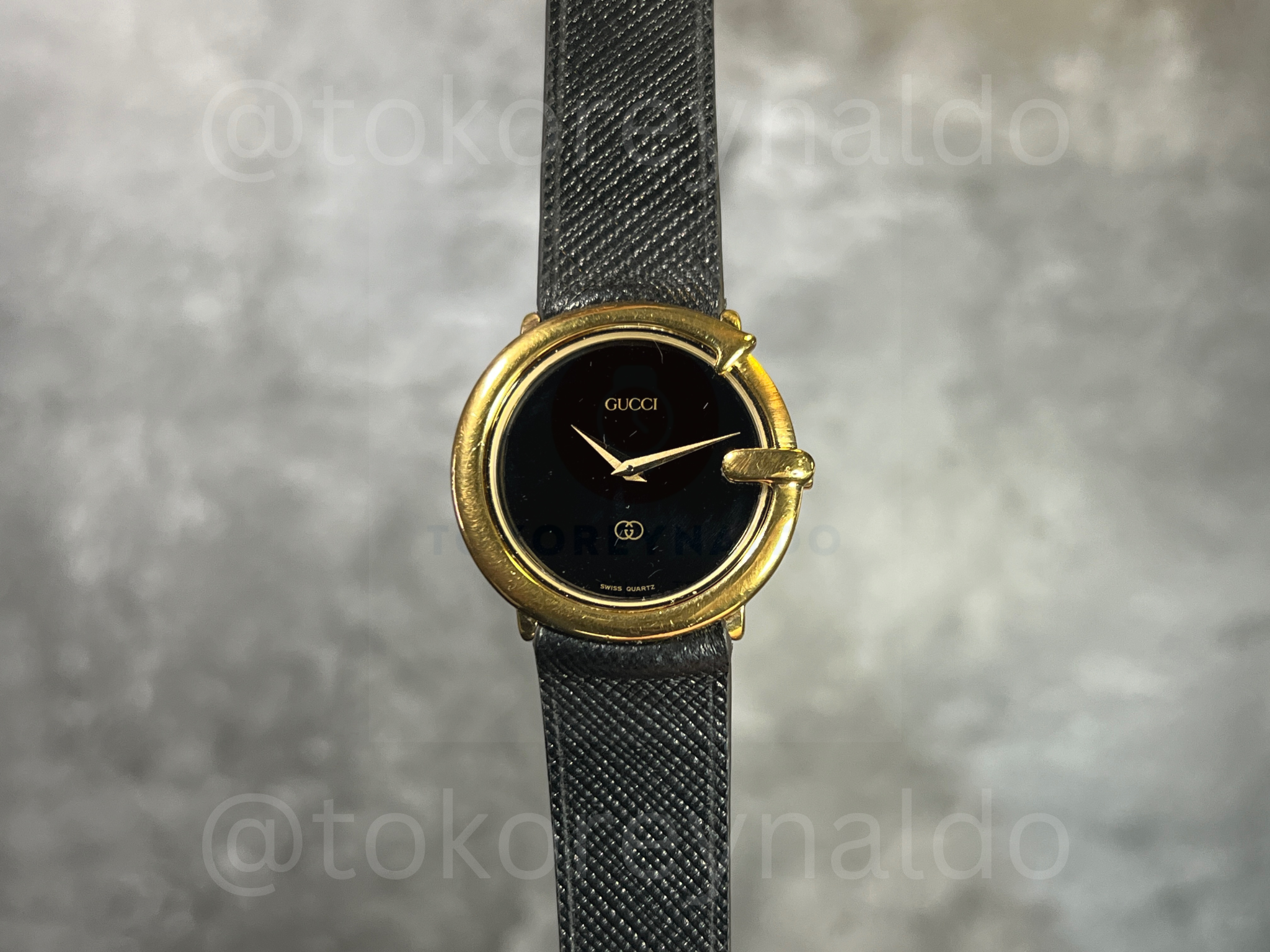 Authentic vintage Gucci 3600 featuring the iconic “G” shaped case in a polished gold-plated finish. This sophisticated Swiss-made timepiece showcases a minimalist black dial with elegant gold-tone leaf-style hands and the signature interlocking GG logo. Paired with a premium black saffiano leather strap, it is a bold and timeless statement of luxury fashion for collectors, available now at Toko Reynaldo.