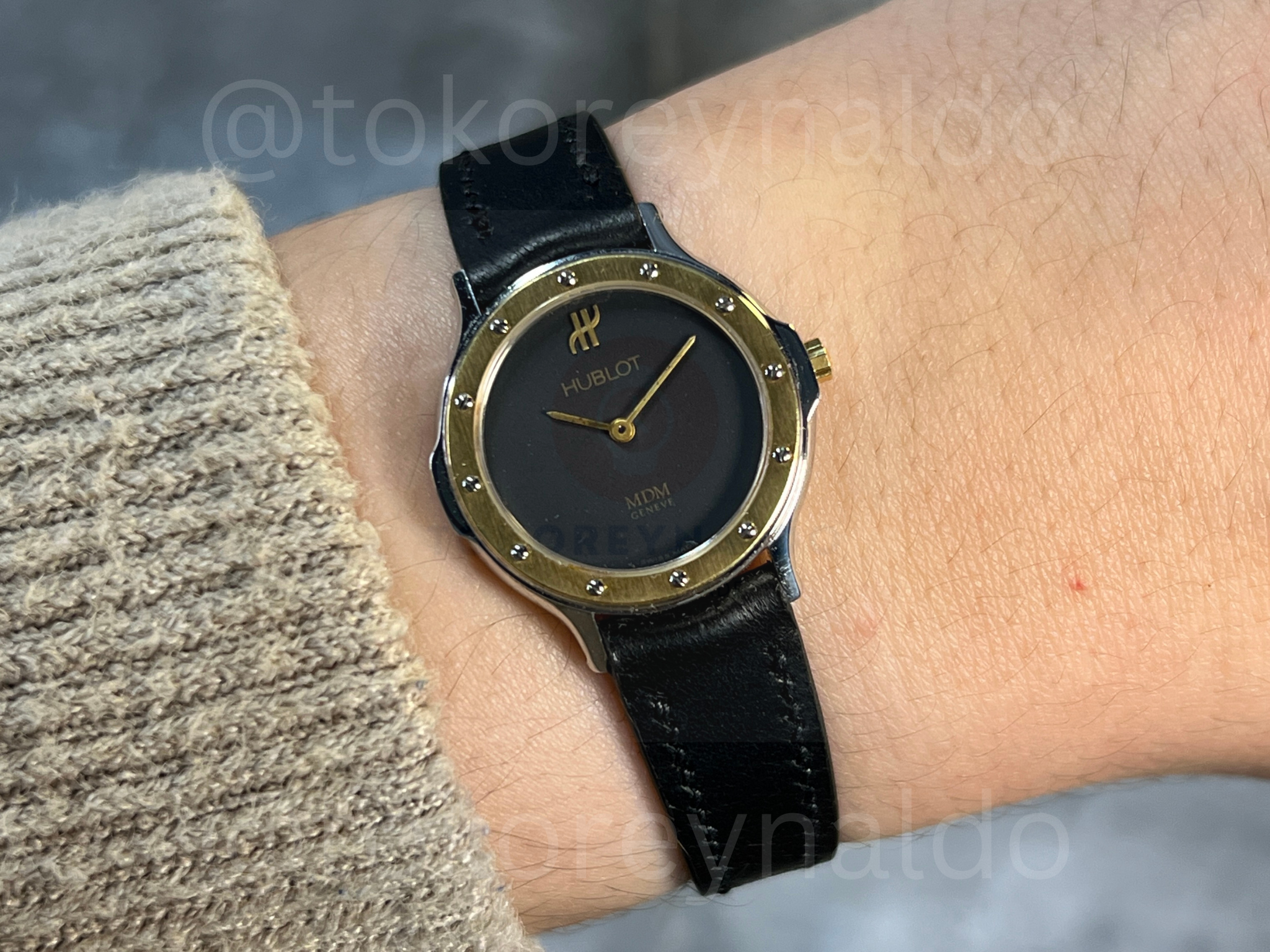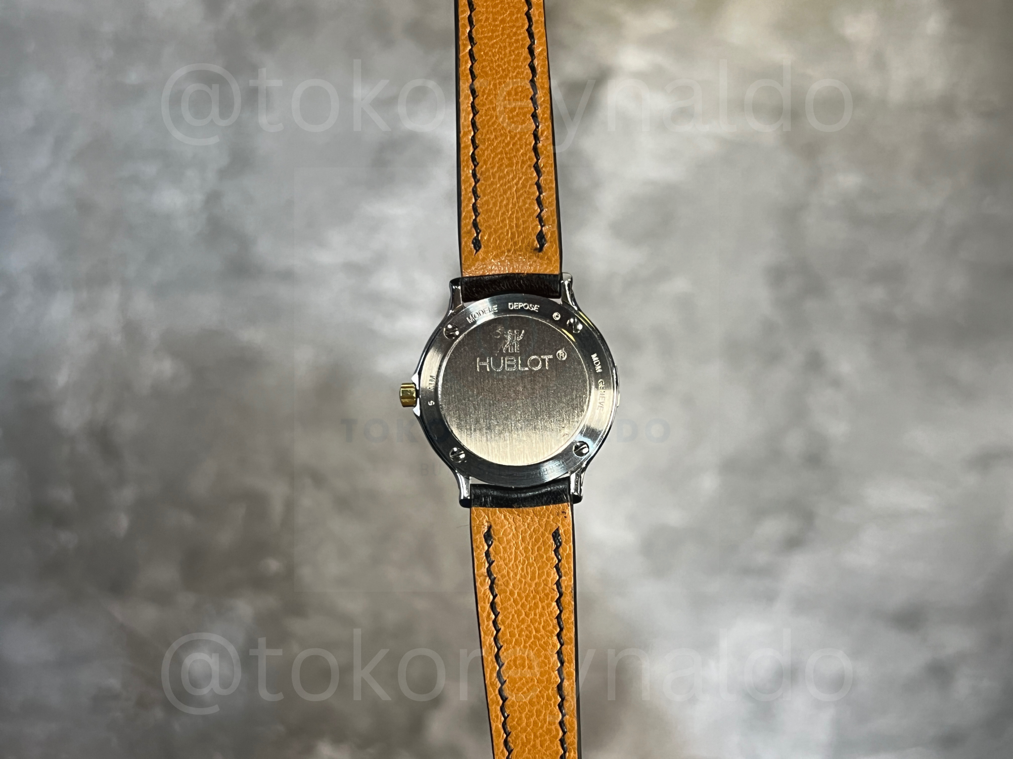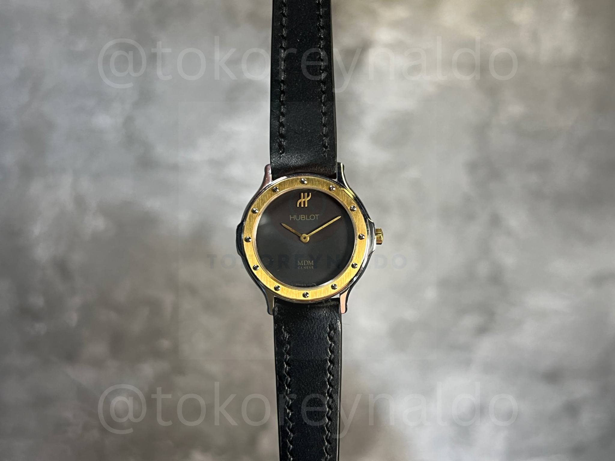 Authentic vintage Hublot MDM 1280.100 featuring a classic small round stainless steel case with a solid 18K yellow gold bezel. This elegant Swiss-made timepiece showcases a minimalist matte black dial with gold-tone hands and the iconic Hublot logo at the 12 o’clock position. Paired with a premium black leather strap, it embodies the original “Classic Fusion” aesthetic that redefined luxury sport watches, available now at Toko Reynaldo.
