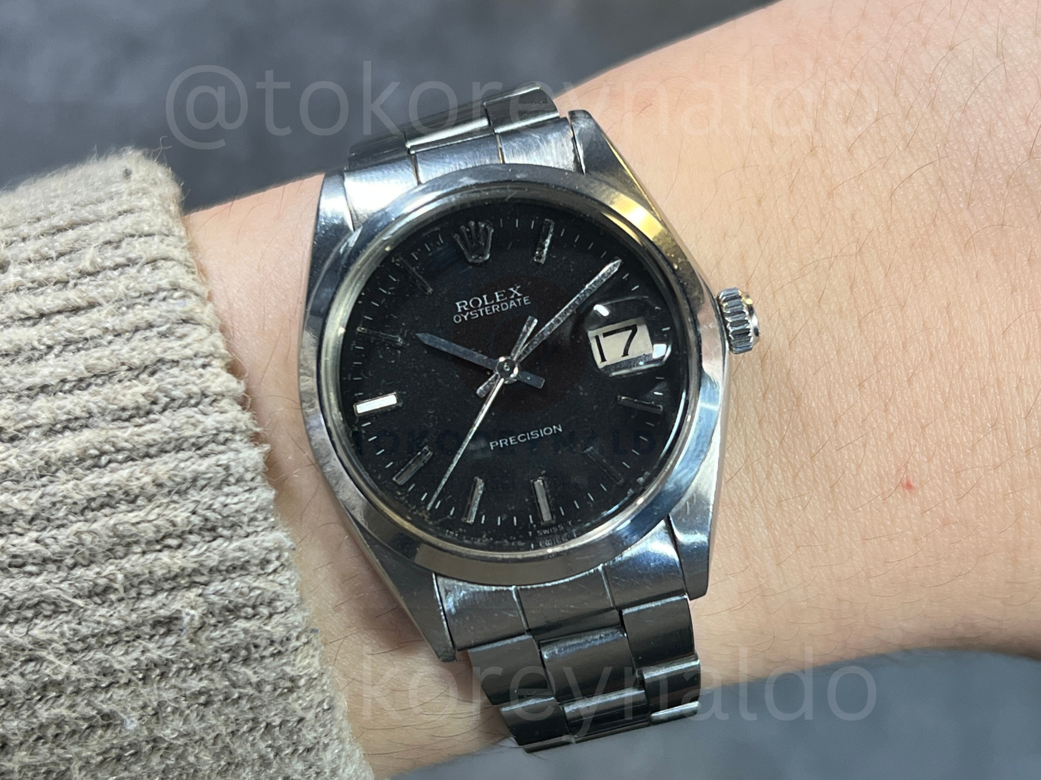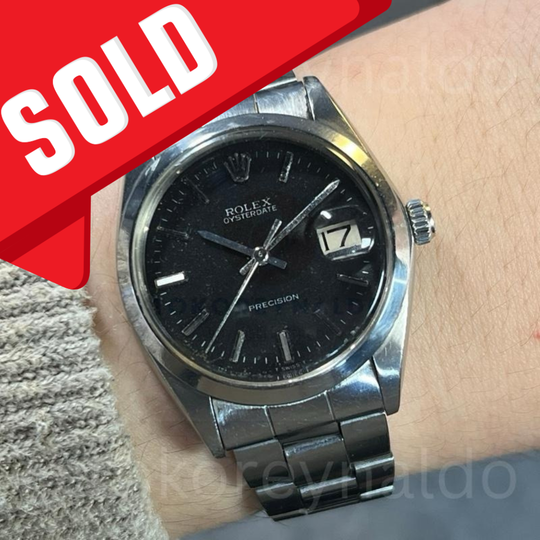 Authentic vintage Rolex Oysterdate Precision (Ref. 6694) featuring a robust 34mm stainless steel Oyster case with a high-polish finish. This iconic Swiss-made manual-wind timepiece showcases a sophisticated deep black dial adorned with applied silver-tone baton indices and sleek luminous hands. A hallmark of this model is the functional date window at the 3 o’clock position under a cyclops magnifying lens, paired with its original stainless steel Oyster bracelet, available now at Toko Reynaldo.