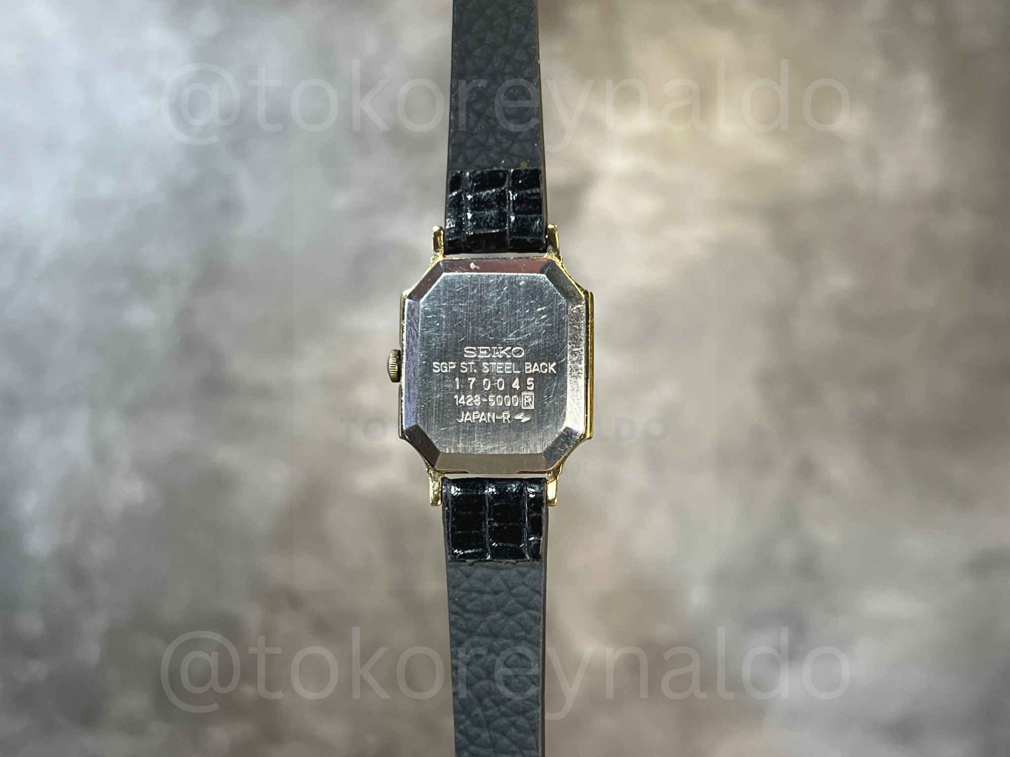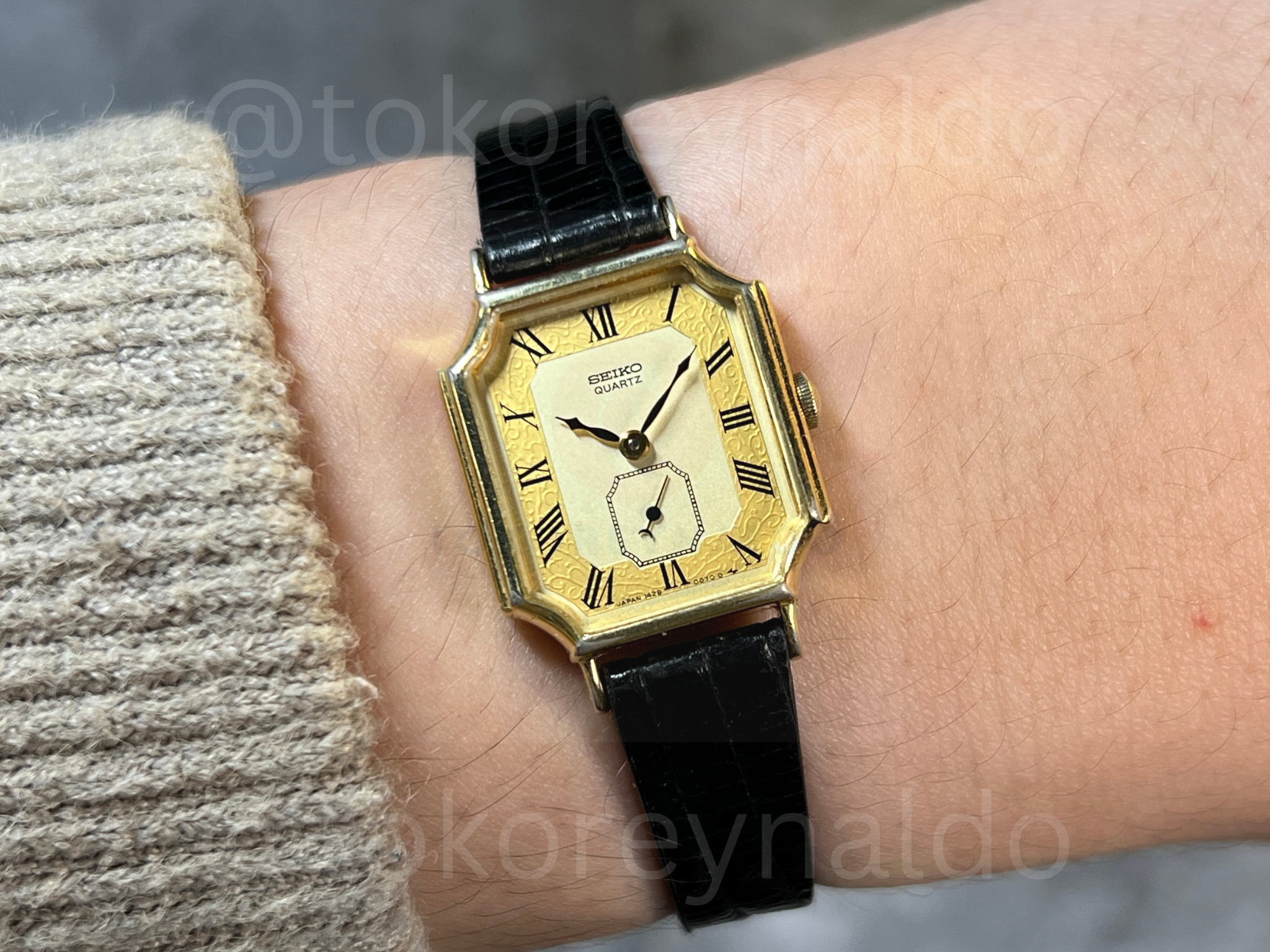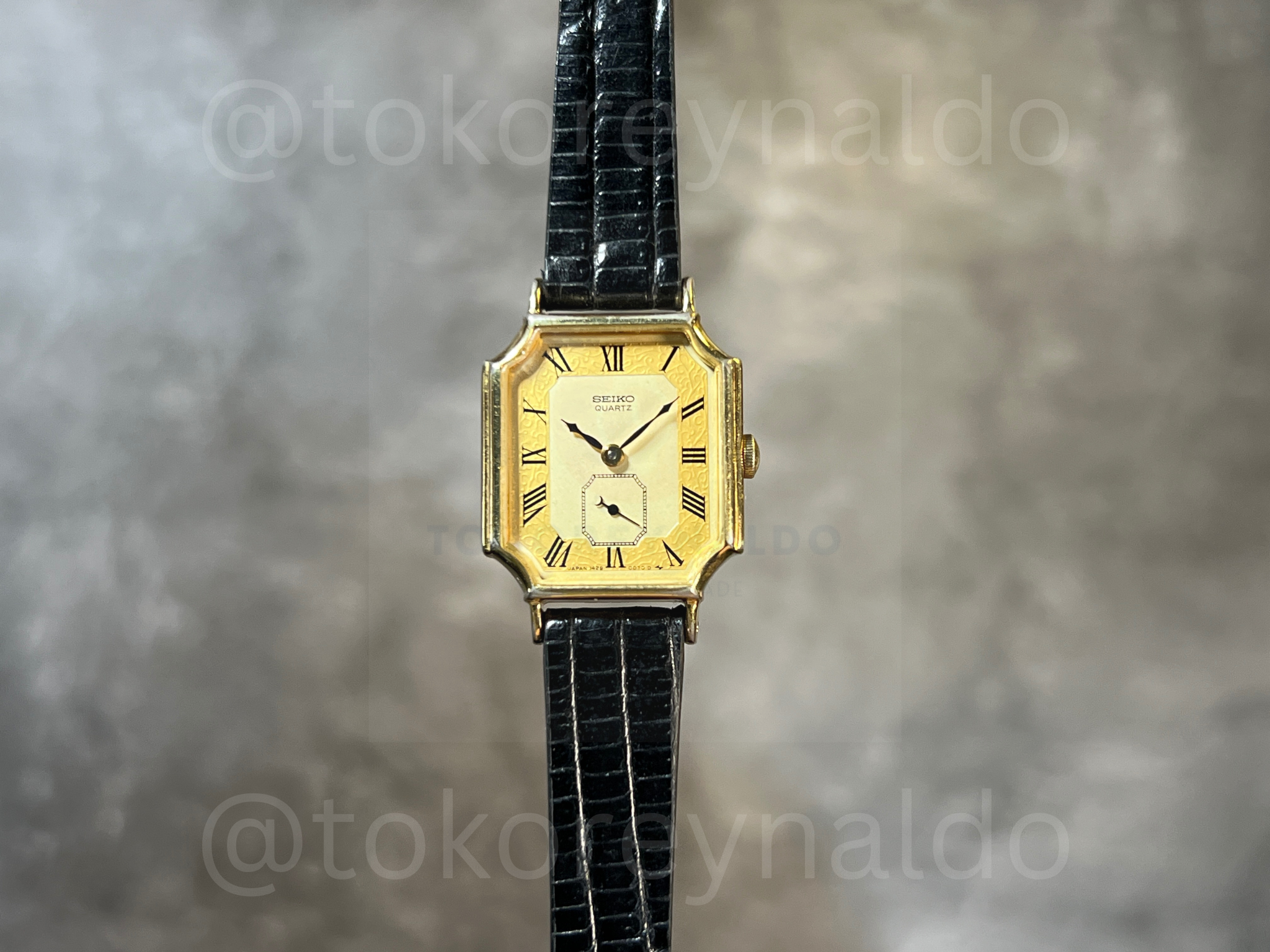 Authentic vintage Seiko 1428-5000 featuring a rare octagonal gold-plated case and a sophisticated champagne textured dial. This elegant Japanese-made dress watch showcases classic black Roman numeral indices and a distinctive sub-second sub-dial at the 6 o’clock position. Paired with a premium black lizard-grain leather strap, it is a refined and collectible timepiece available now at Toko Reynaldo.