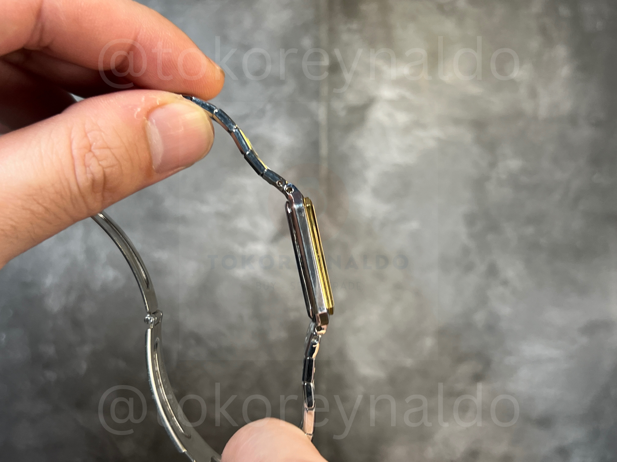 Authentic vintage Seiko Cadet 8N40-5060 featuring a sophisticated square two-tone case with a polished gold-tone bezel. This elegant Japanese dress watch showcases a crisp white dial with minimalist gold-tone baton indices and sleek hands. Paired with its original integrated two-tone stainless steel bracelet, this slim-profile timepiece offers a refined aesthetic for collectors, available now at Toko Reynaldo.