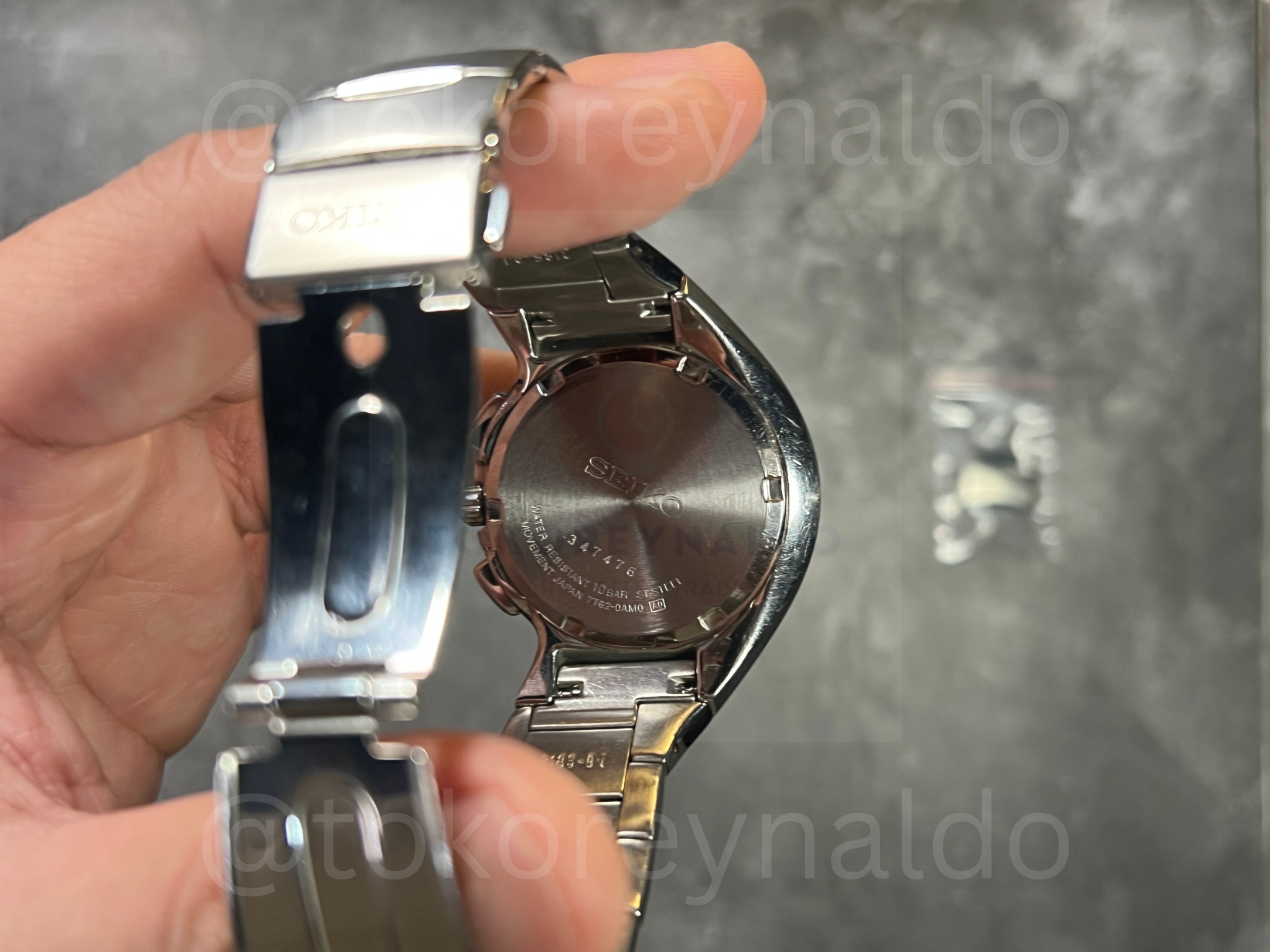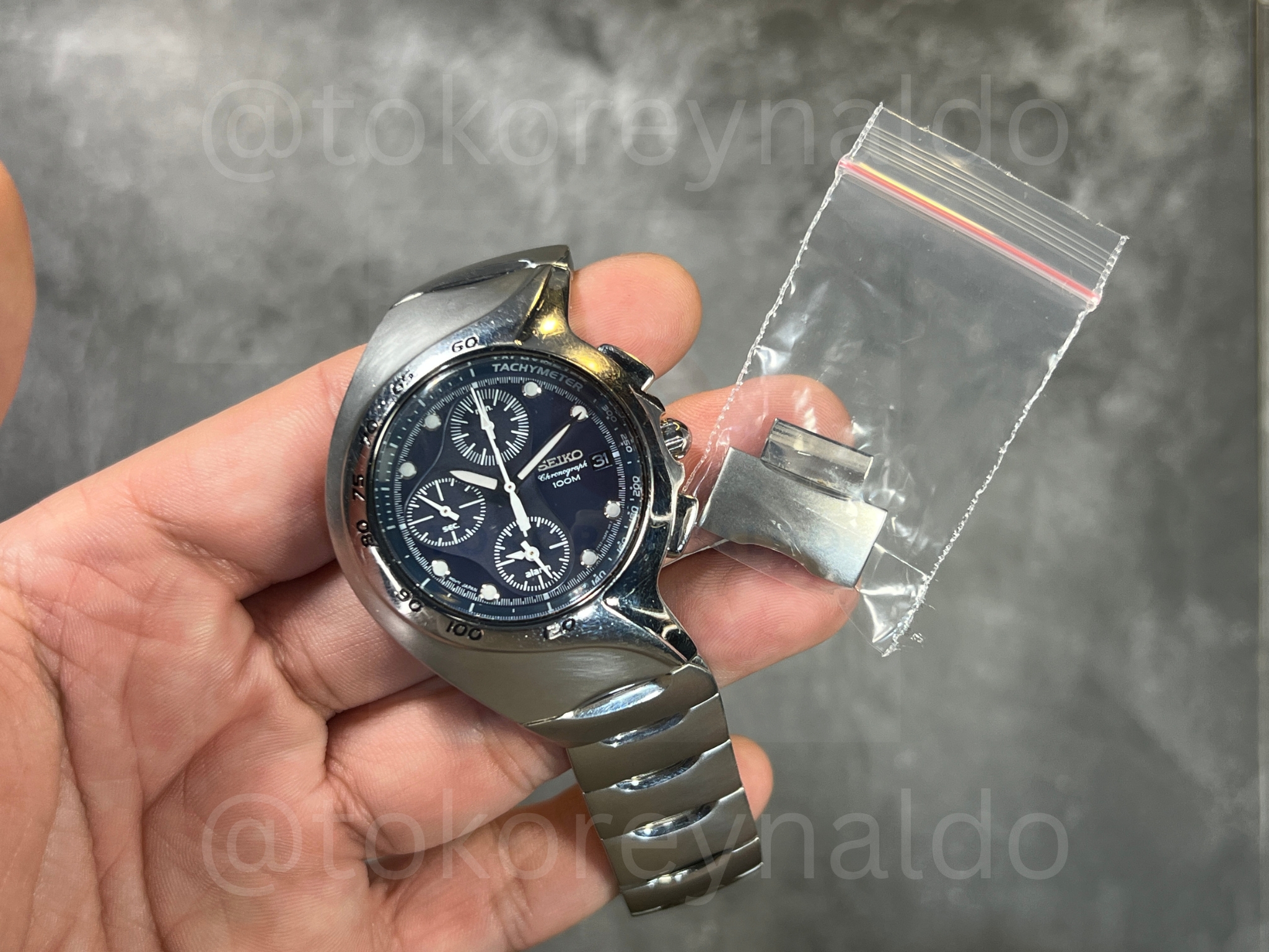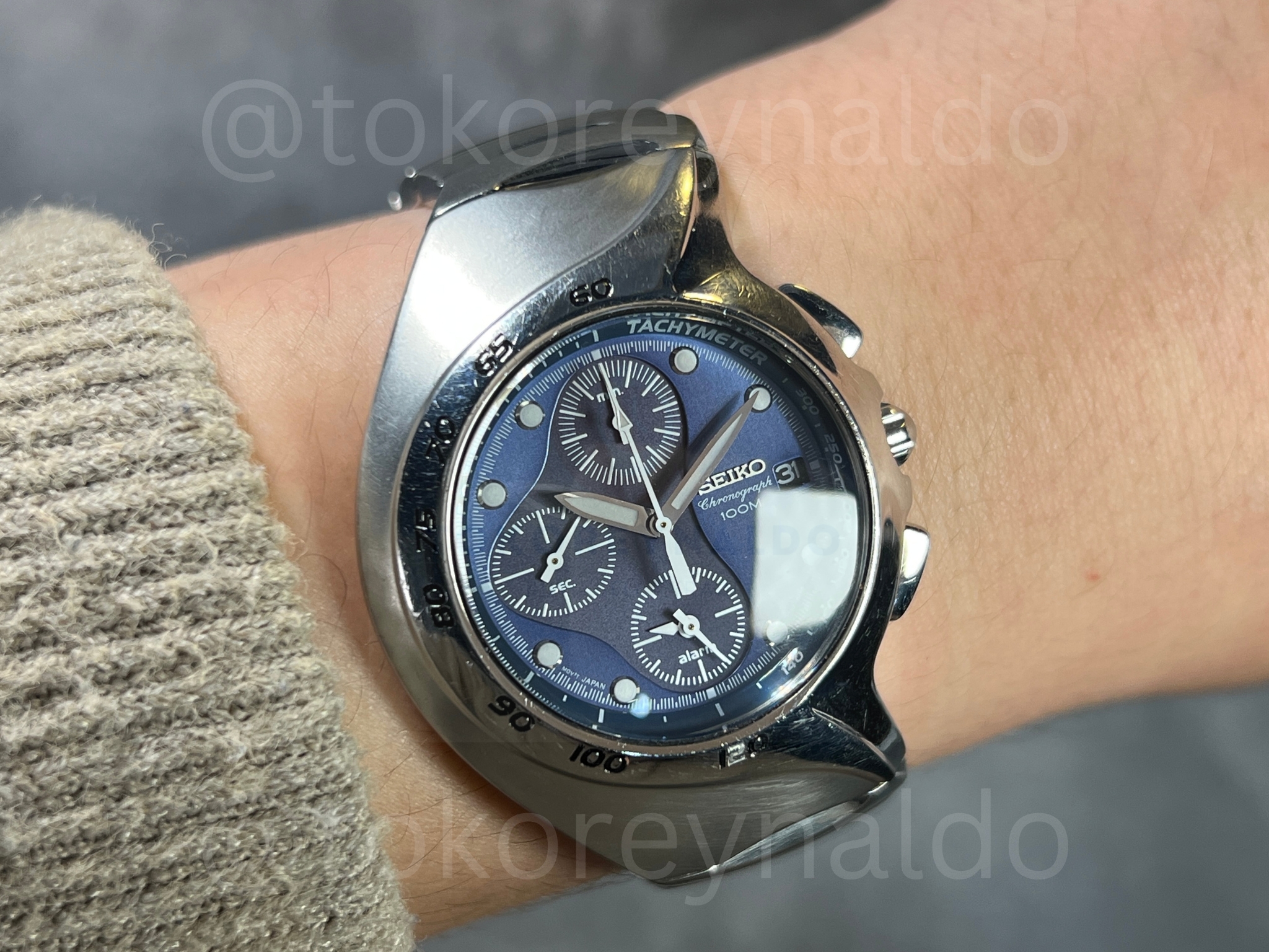 Authentic vintage Seiko Chronograph (Ref. 7T92-0AM0) featuring a rare and futuristic asymmetrical “Alien” case in high-polish stainless steel. This iconic Japanese-made sports watch showcases a deep blue sunray dial with three functional sub-dials, a date window at the 3 o’clock position, and a tachymeter scale integrated into the inner bezel. Paired with its original integrated stainless steel bracelet, this avant-garde design is a highly sought-after piece for collectors of unconventional horology, available now at Toko Reynaldo.