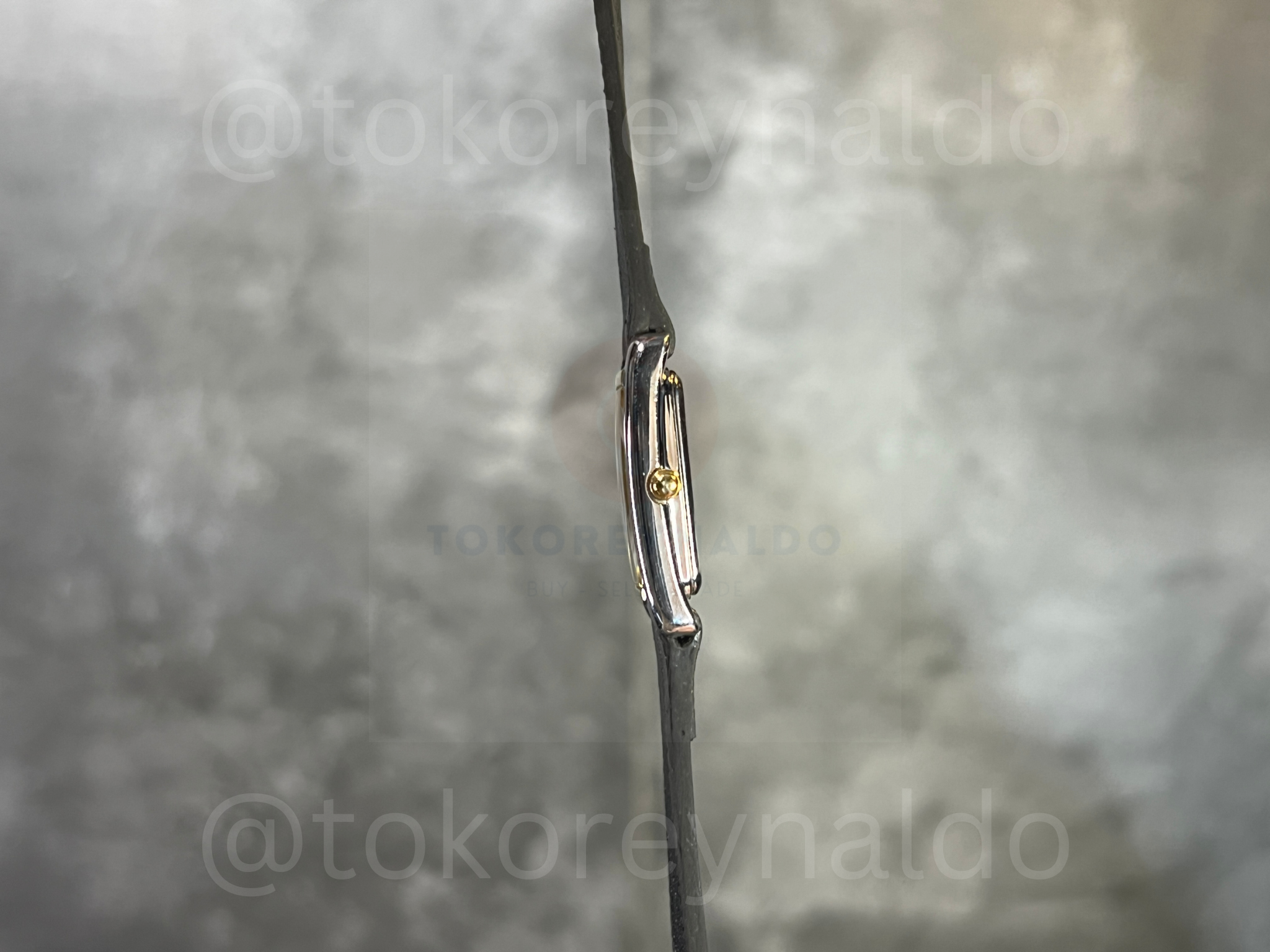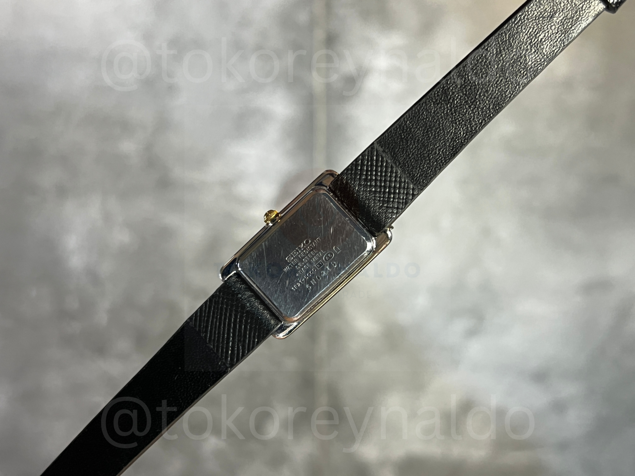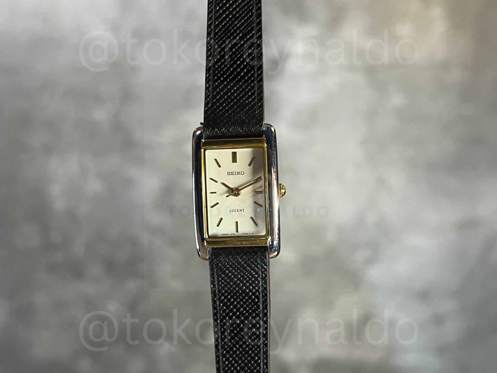 Authentic vintage Seiko Lucent (Ref. 1F21-5C00) featuring a sophisticated small “Tank” rectangular two-tone case with a polished gold-tone bezel and a stainless steel frame. This elegant Japanese-made dress watch showcases a clean cream dial with minimalist gold-tone baton indices and sleek matching hands. Paired with a premium black saffiano leather strap, it offers a refined and timeless aesthetic for collectors of high-end vintage Seiko pieces, available now at Toko Reynaldo.