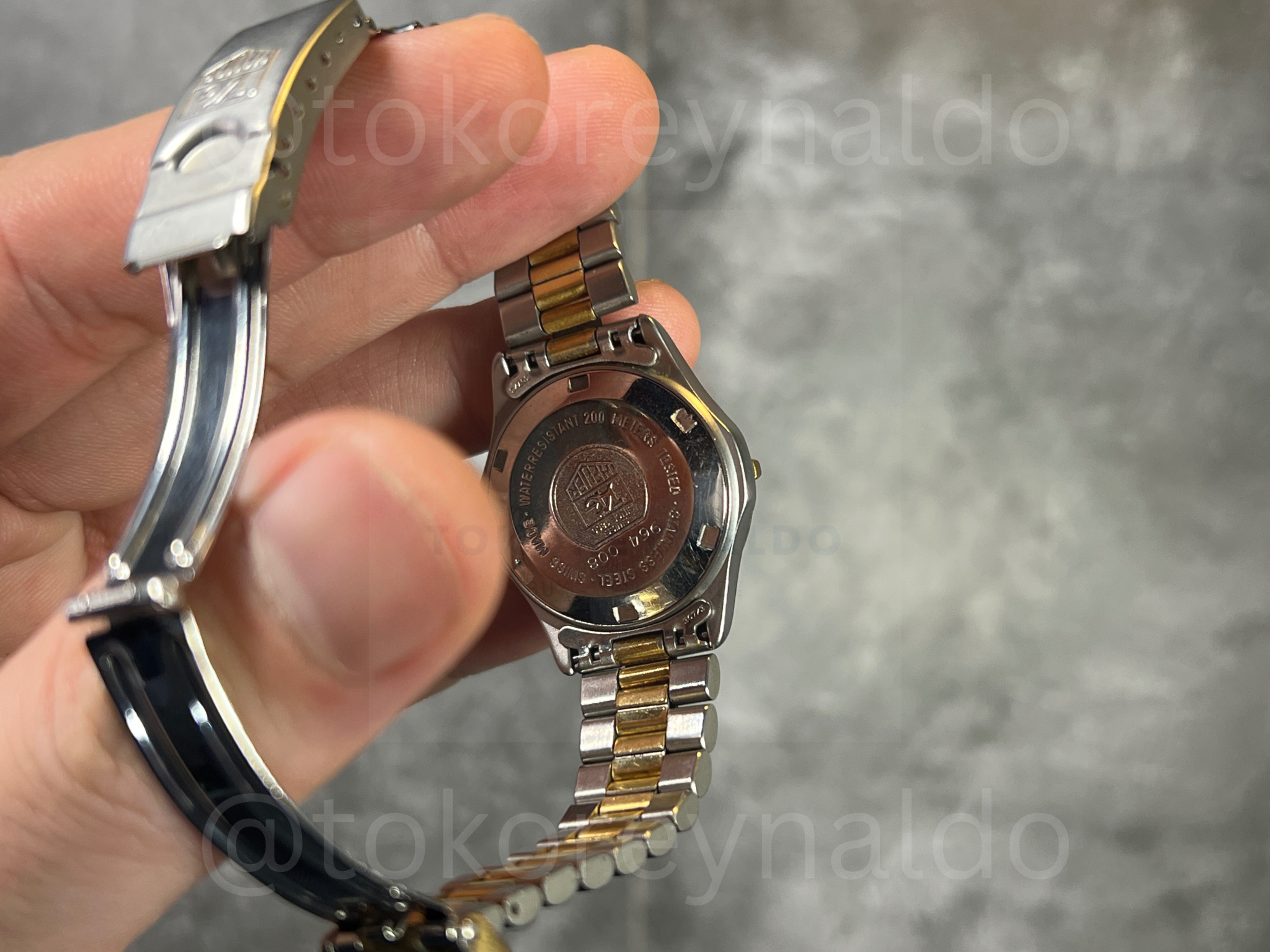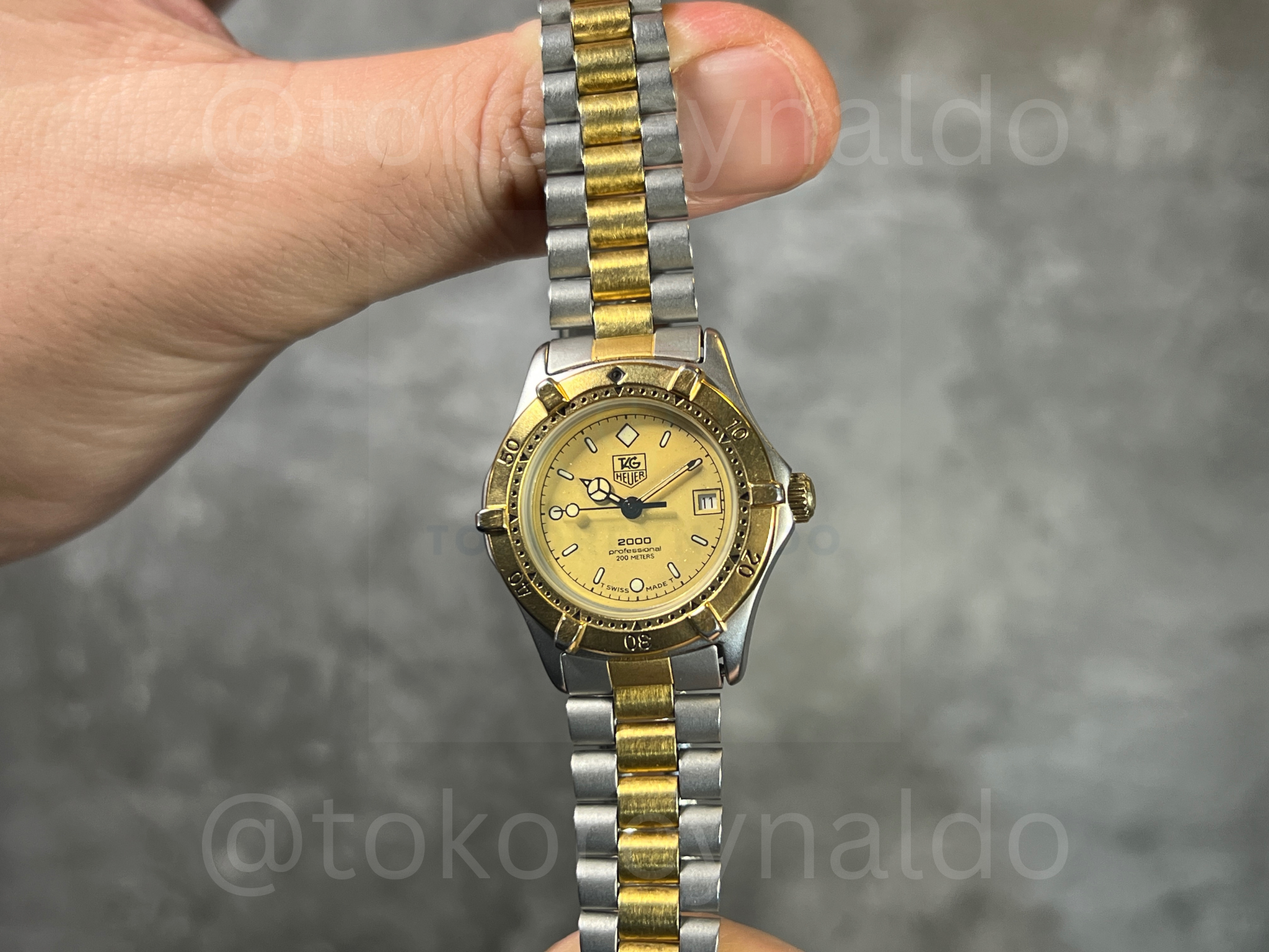 Authentic vintage TAG Heuer 2000 Professional (Ref. 964.008) featuring a classic mid-size stainless steel case with a signature unidirectional rotating gold-plated bezel. This iconic Swiss-made diver showcases a radiant champagne dial with luminous dot indices, mercedes-style hands, and a quick-set date window at the 3 o’clock position. Paired with its original two-tone integrated jubilee-style bracelet, it offers a perfect blend of sport functionality and luxury heritage, available now at Toko Reynaldo.