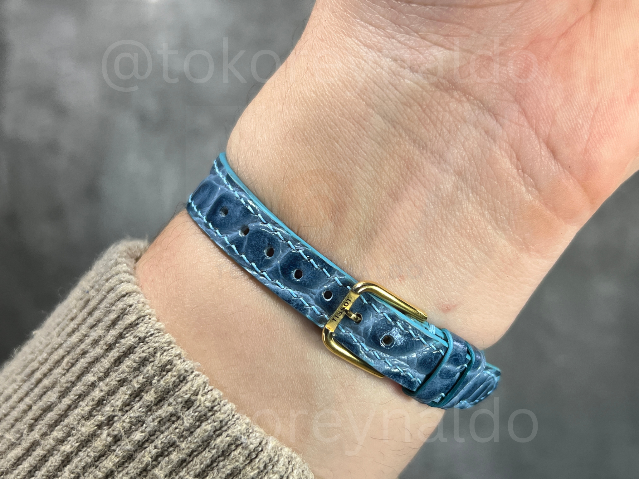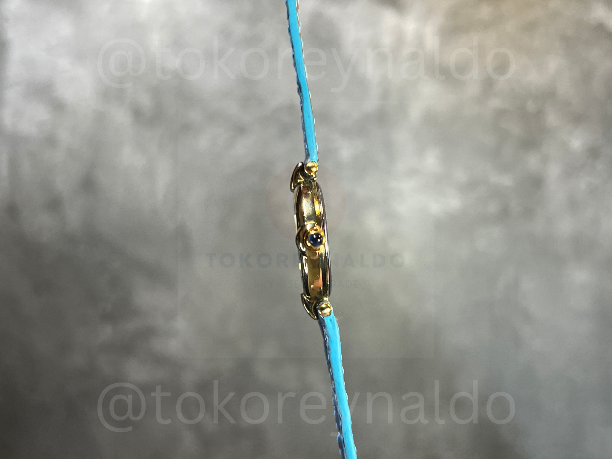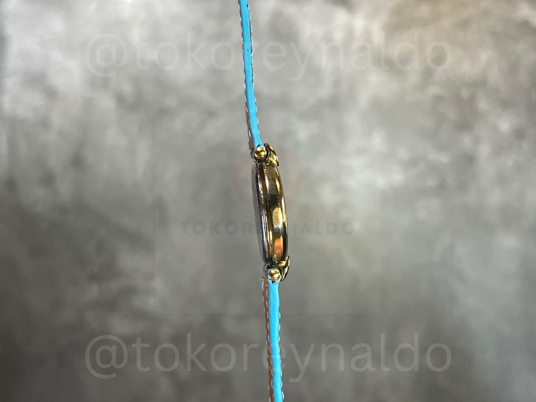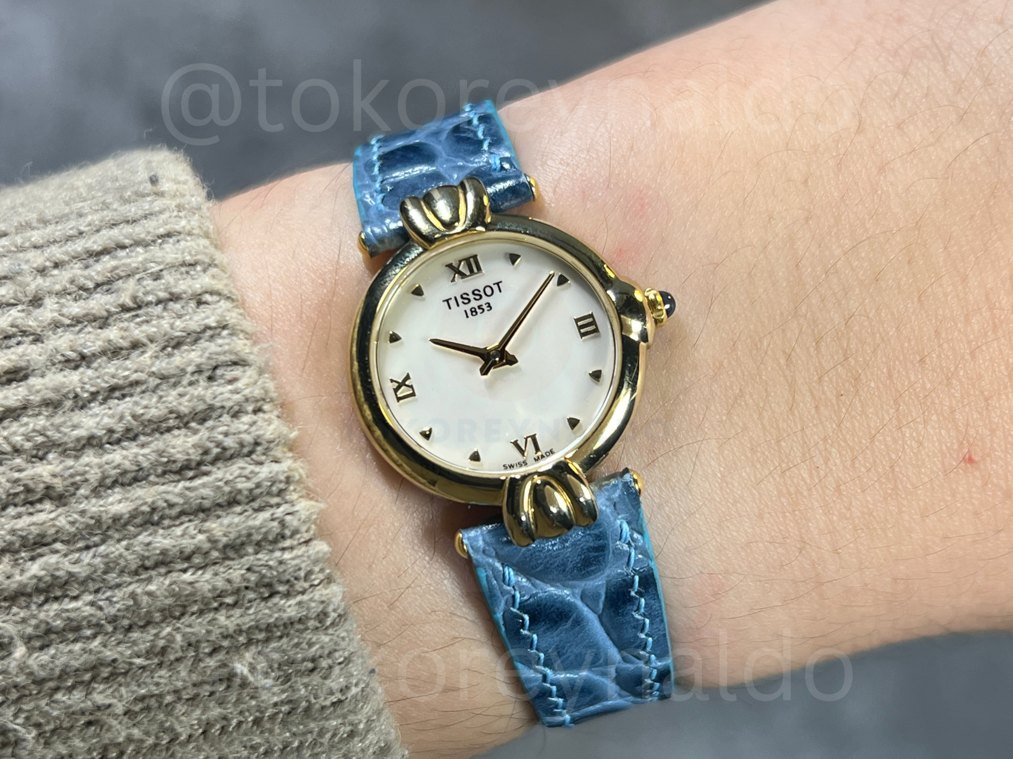 Authentic vintage Tissot (Ref. G226/326) featuring a petite round case in a polished gold-plated finish with signature decorative fluted lugs. This elegant Swiss-made dress watch showcases a radiant white Mother of Pearl (MOP) dial with a sophisticated mix of Roman numeral and dot indices, sleek gold-tone hands, and a black cabochon-tipped crown. Paired with a vibrant turquoise crocodile-grain leather strap, it is a refined statement of classic luxury for collectors, available now at Toko Reynaldo.