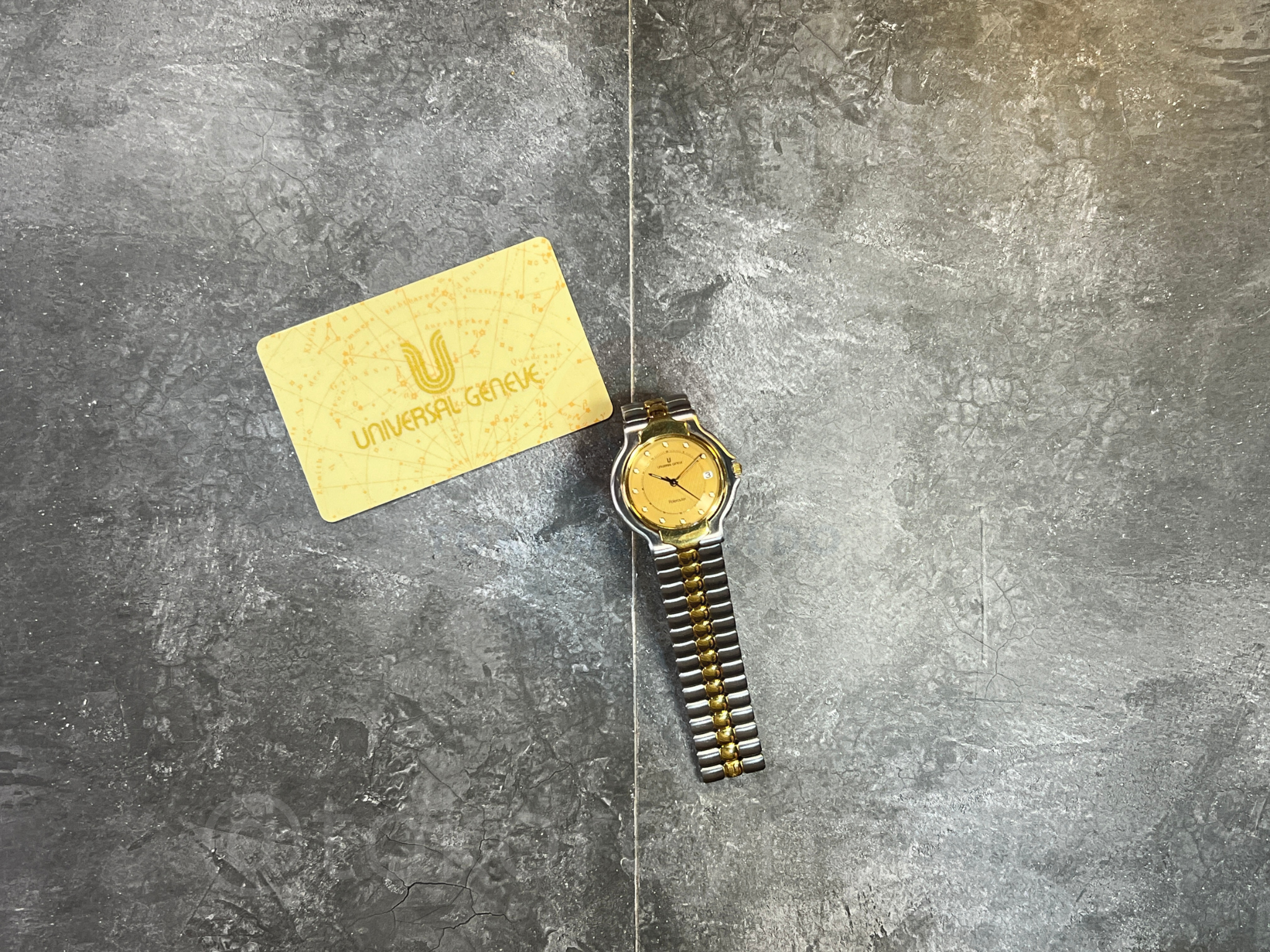 VINTAGE UNIVERSAL GENEVE POLEROUTER 677.085 TWO TONE 18K ELECTROPLATED G0LD TEXTURED DIAL DOT INDEX