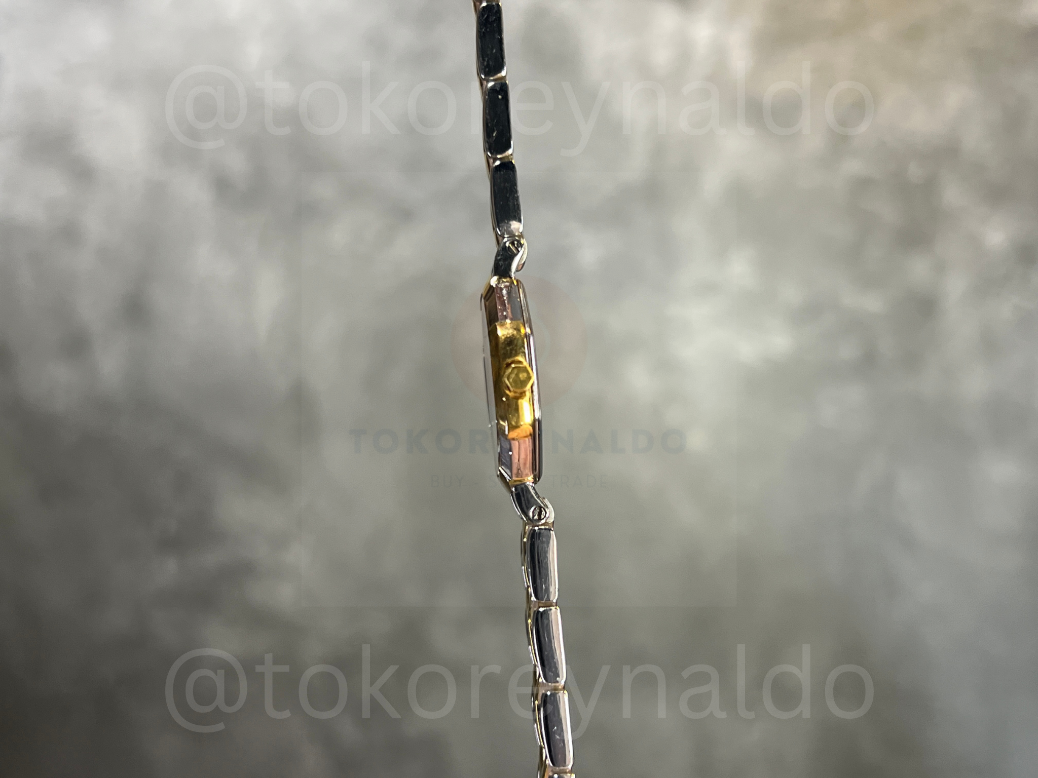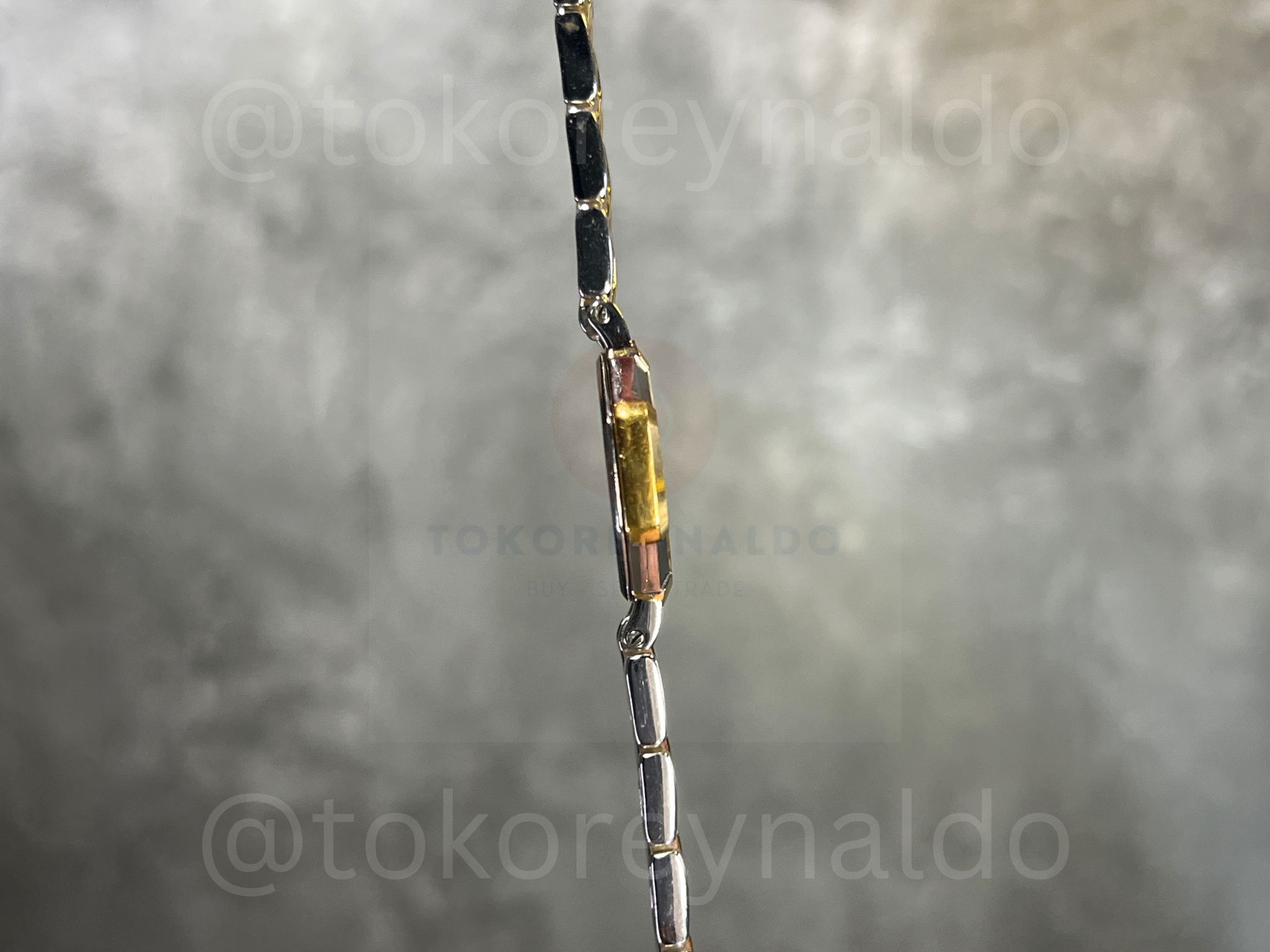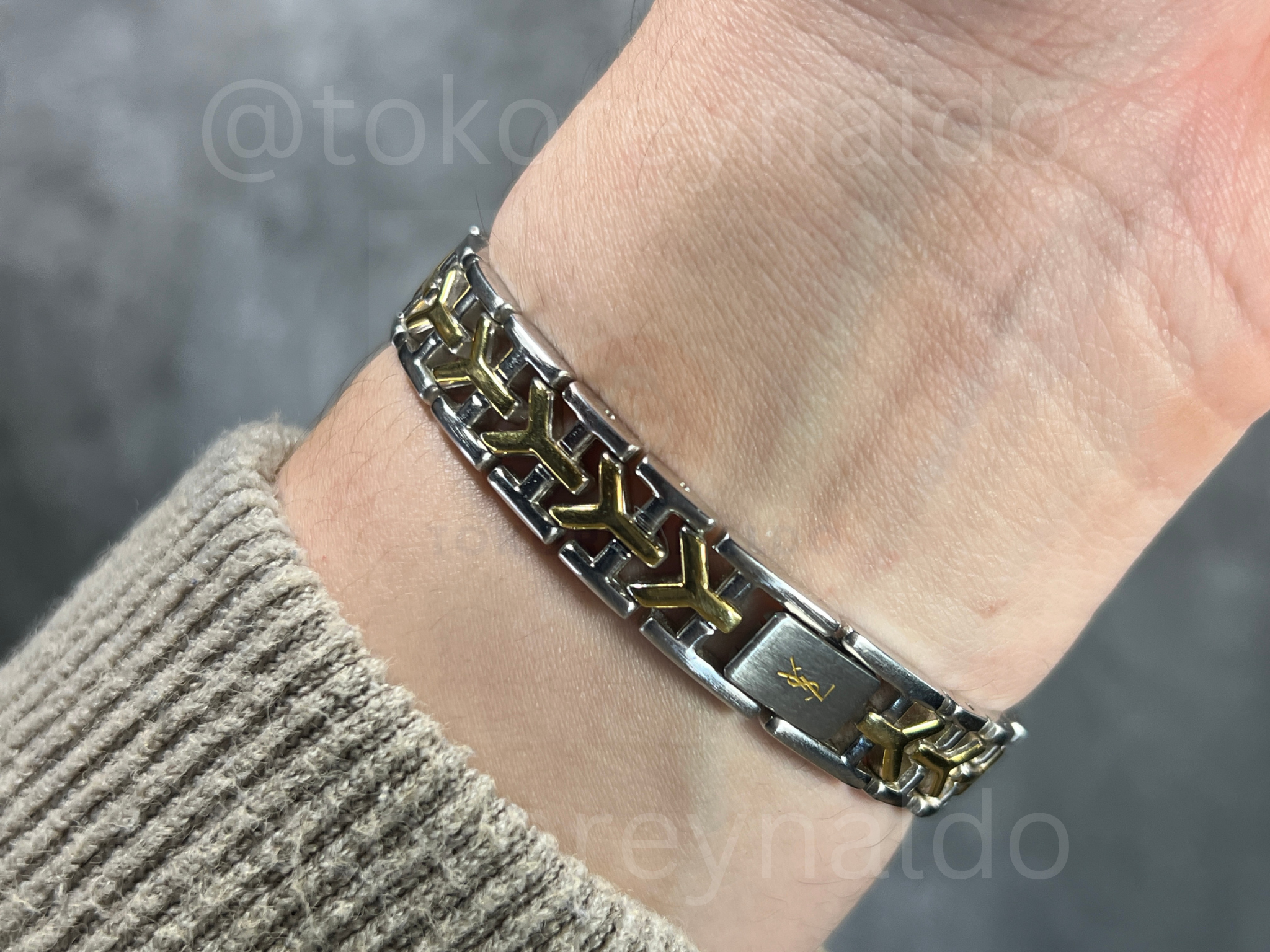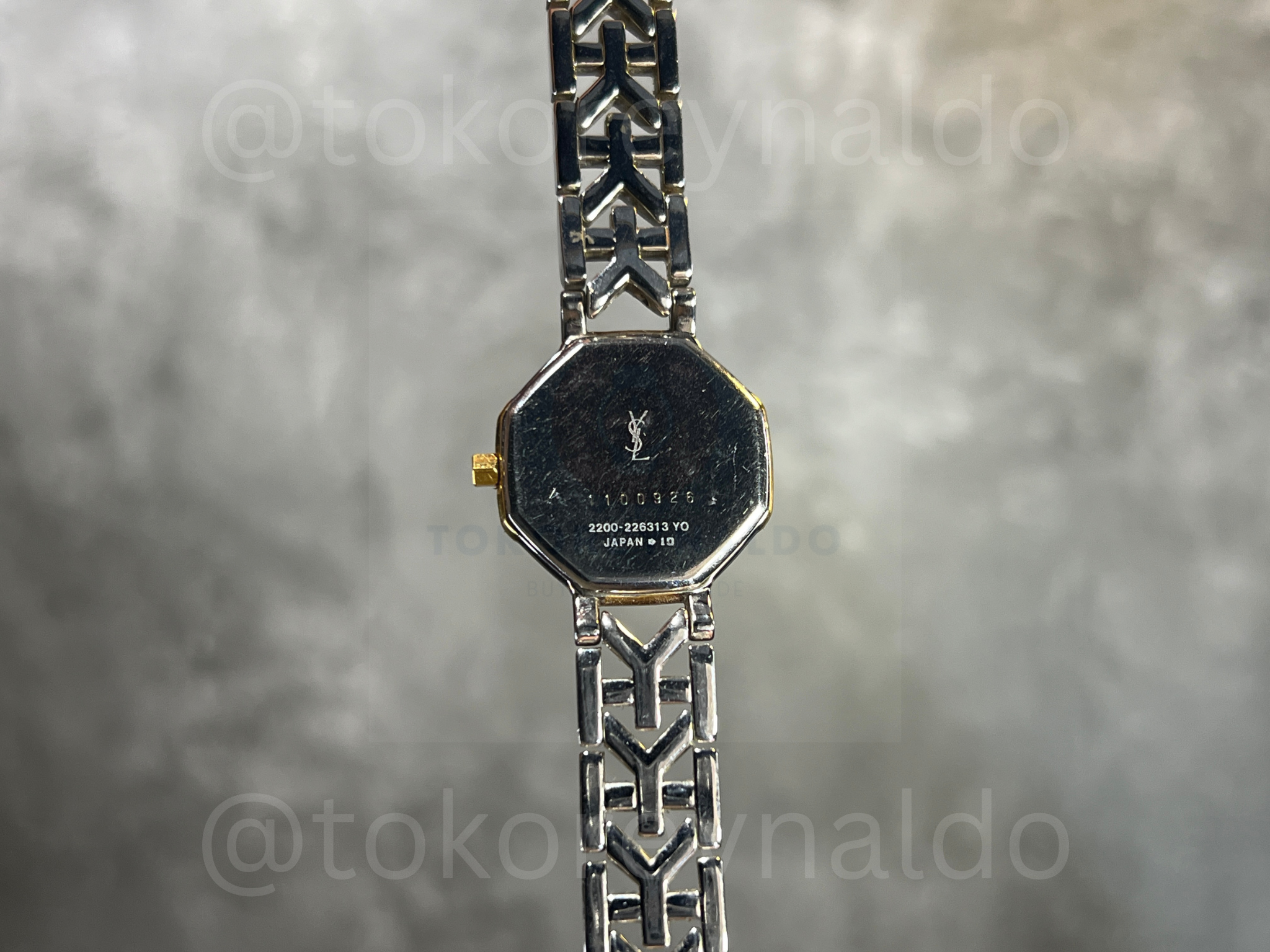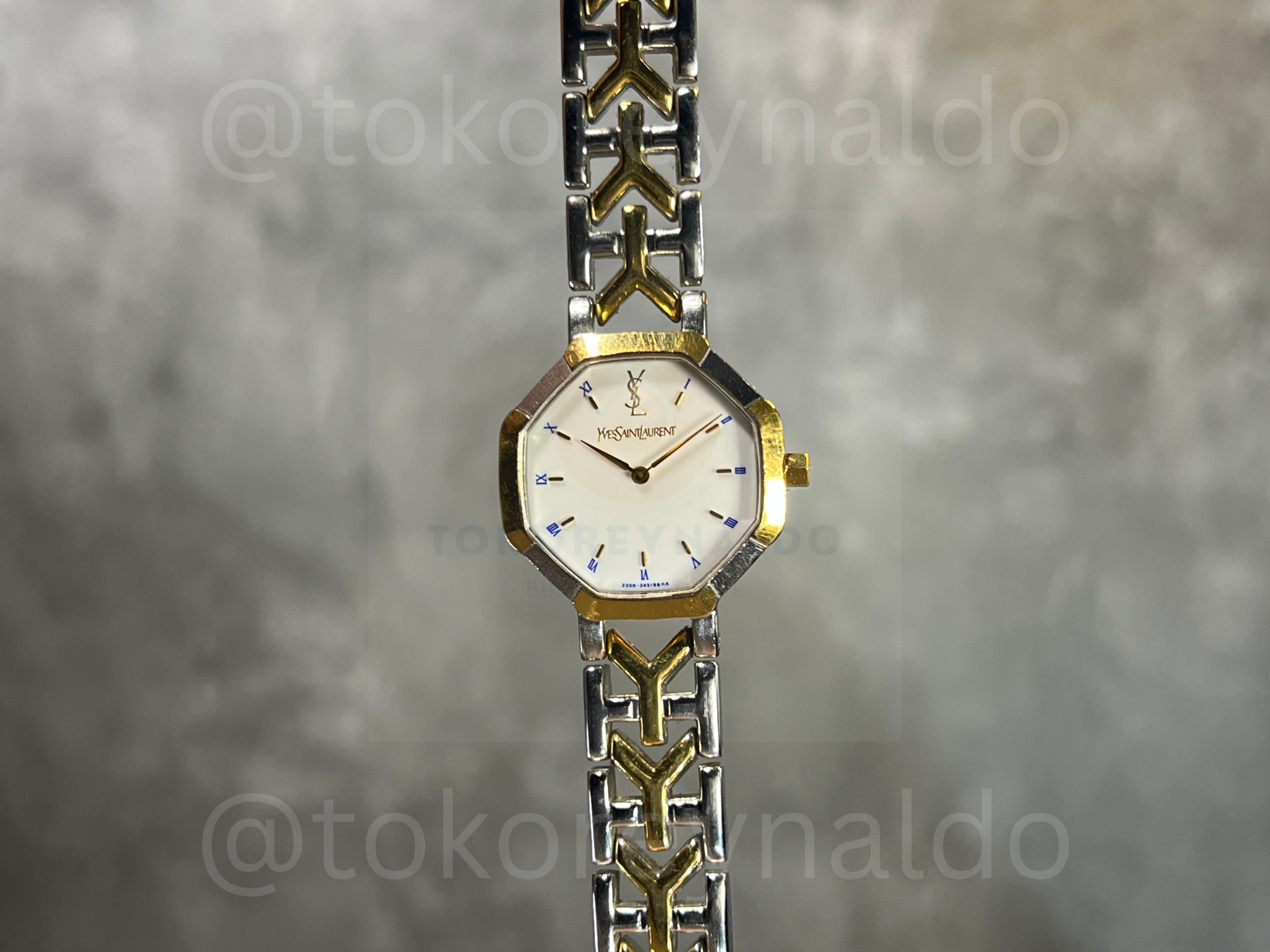 Authentic vintage Yves Saint Laurent (Ref. 2200-226313 YO) featuring a distinctive octagon-shaped case in a sophisticated two-tone stainless steel and gold-plated finish. This elegant Japanese-made dress watch showcases a clean white dial with minimalist blue baton indices, sleek gold-tone hands, and the iconic “YSL” monogram at the 12 o’clock position. Paired with its original integrated two-tone bracelet featuring signature “Y” shaped gold-plated center links, it is a rare and stylish statement of French high-fashion heritage, available now at Toko Reynaldo.